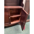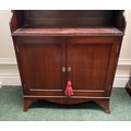 A FINE GEORGE III MAHOGANY WATERFALL BOOKCASE CABINET, with three cascading open shelves, enclosed by shaped side boards and panelled back, above a pair of cabinet doors, opening to shelved interior, raised on splayed legs, with brass carrying handles to the sides and the shaped gallery top with floral centre decoration. In need of slight restoration. Dimensions: 160cm high x 73cm wide x 29cm deep approx.