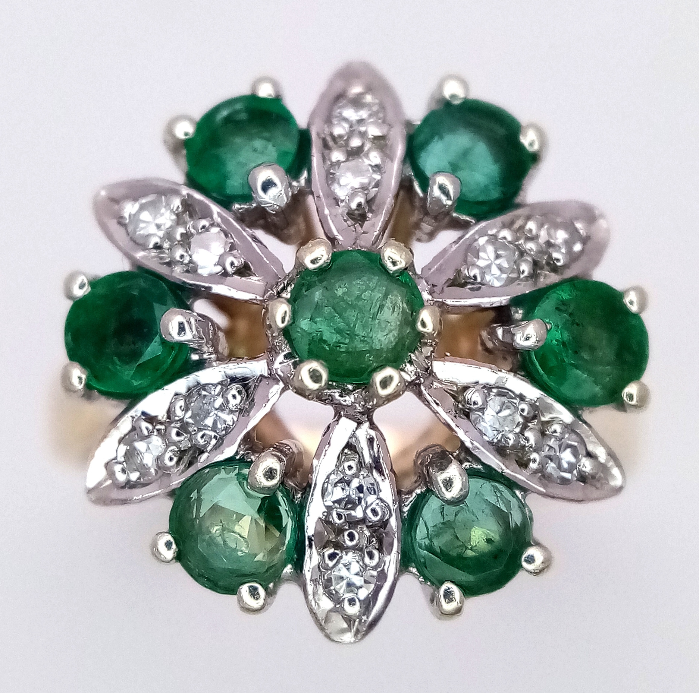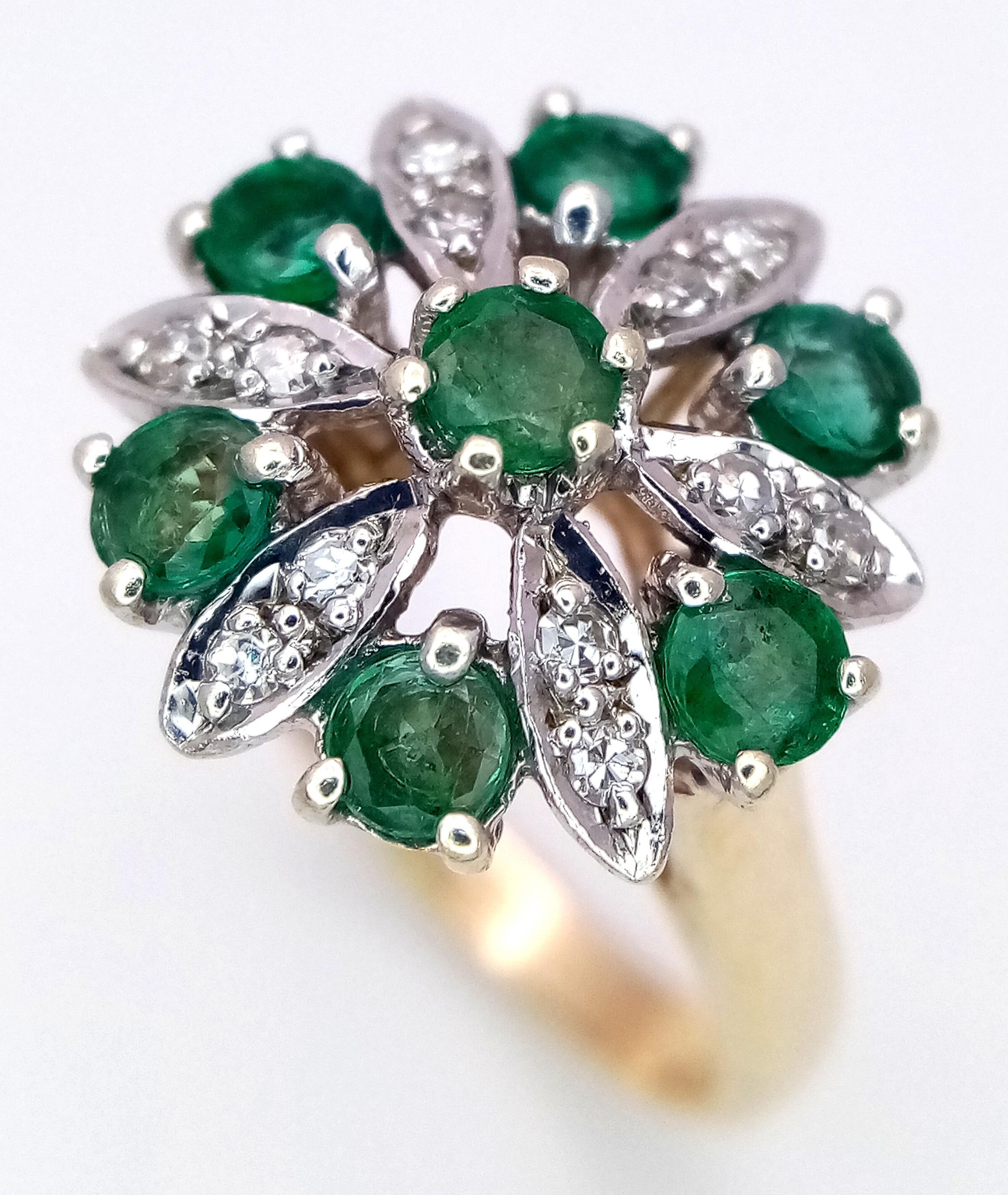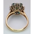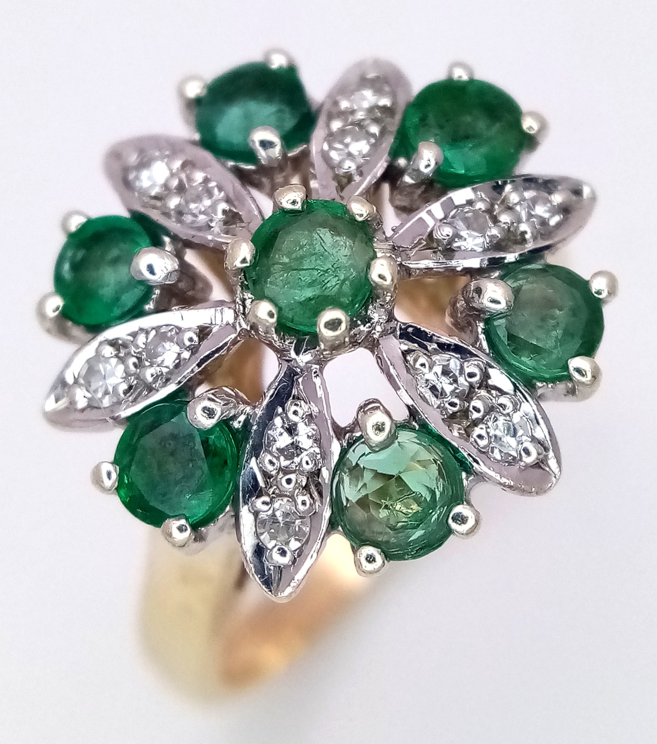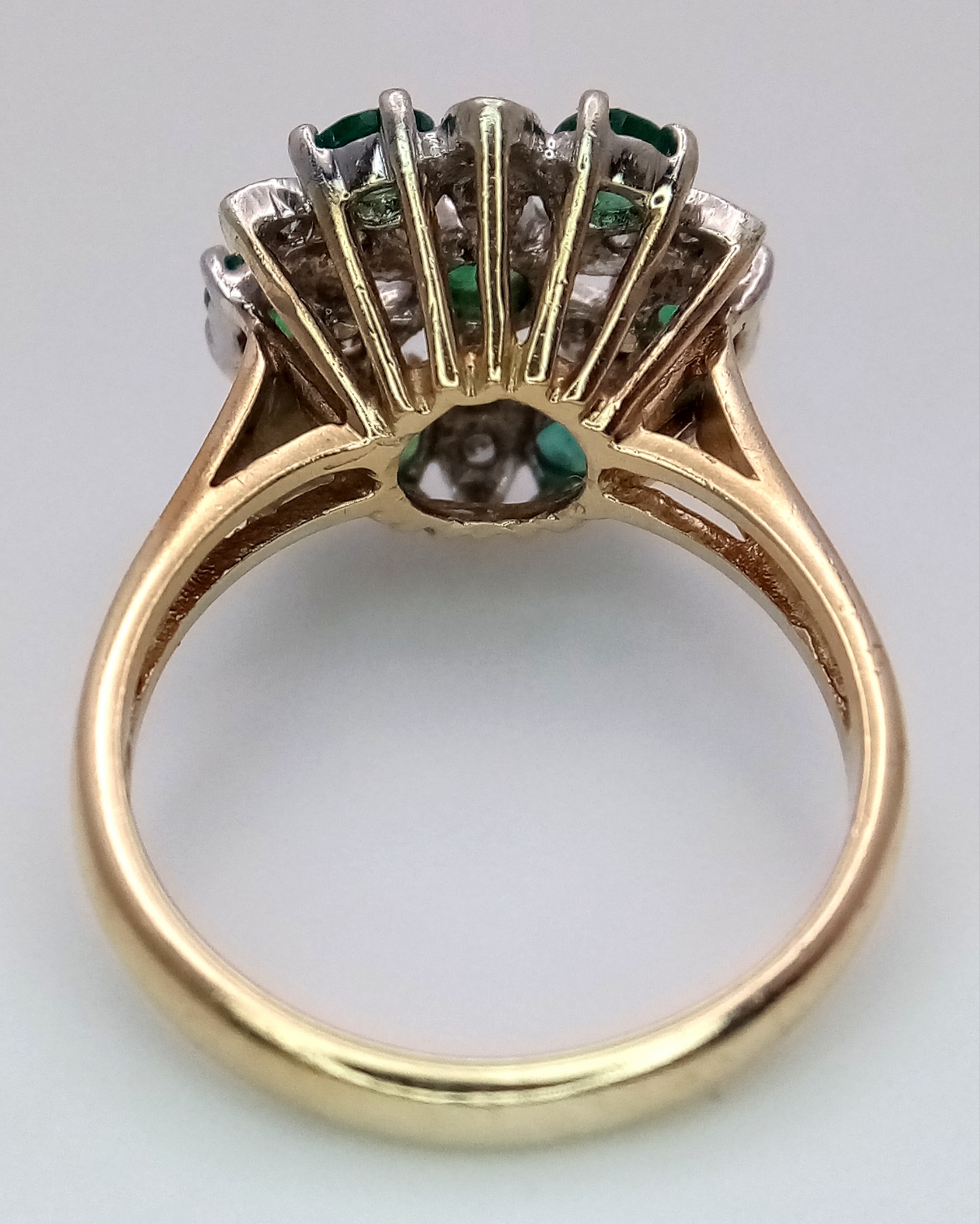 A 9K YELLOW GOLD DIAMOND AND EMERALD CLUSTER RING. 4.2G TOTA...