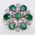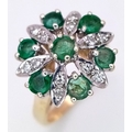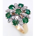 A 9K YELLOW GOLD DIAMOND AND EMERALD CLUSTER RING. 4.2G TOTAL WEIGHT, SIZE N. Ref: SC 2045