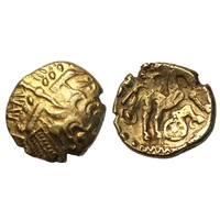 † Regini and Atrebates (c.60-50 BC) Stater Selsey uniface, traces of wreath design, rev. triple-tailed horse right, charioteer's arms above, wheel below, 5.97g, (SCBC 39, ABC 488, 216VA 212-5). Very fine
