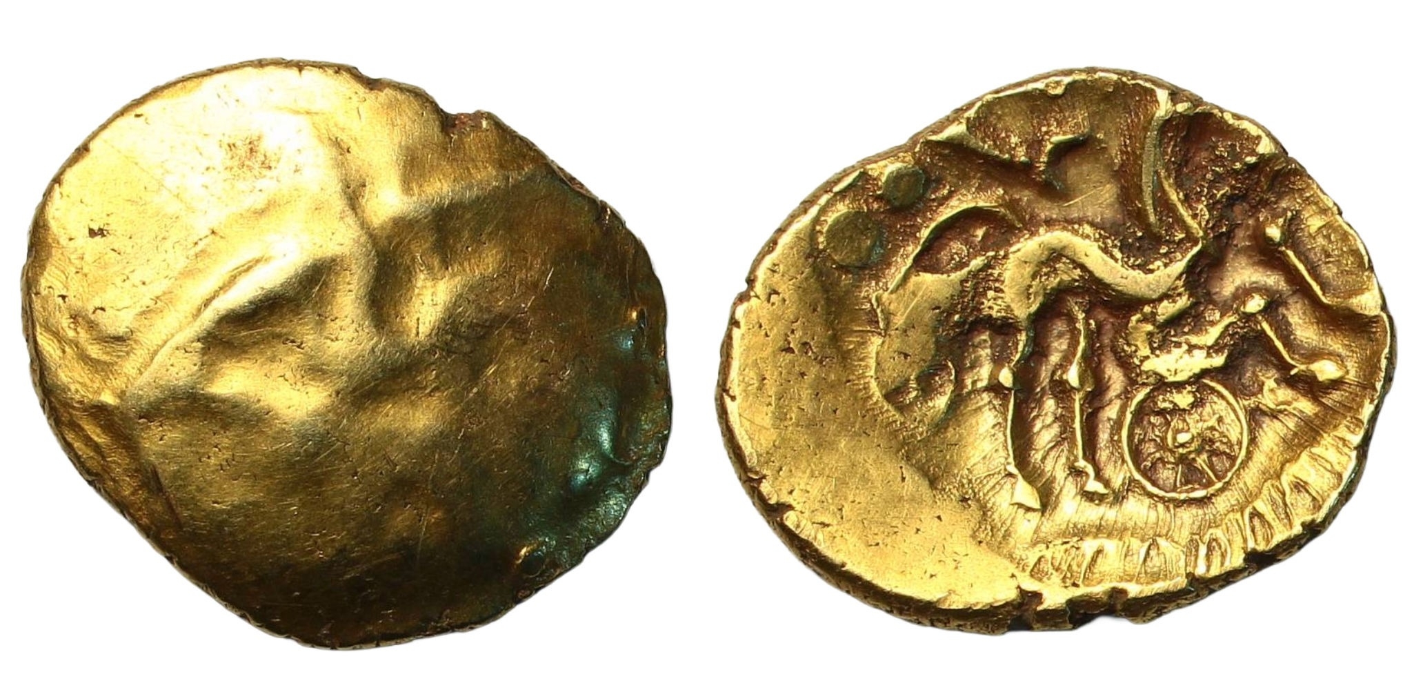 † Regini and Atrebates (c.60-50 BC) Stater Selsey uniface, traces of wreath design, rev. triple-tailed horse right, charioteer's arms above, wheel below, 5.97g, (SCBC 39, ABC 488, 216VA 212-5). Very fine
