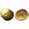 † Regini and Atrebates (c.60-50 BC) Stater Selsey uniface, traces of wreath design, rev. triple-tailed horse right, charioteer's arms above, wheel below, 5.97g, (SCBC 39, ABC 488, 216VA 212-5). Very fine