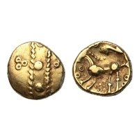 † Regini and Atrebates (c.60-50 BC) Stater Selsey uniface, traces of wreath design, rev. triple-tailed horse right, charioteer's arms above, wheel below, 5.97g, (SCBC 39, ABC 488, 216VA 212-5). Very fine