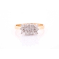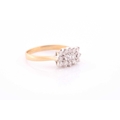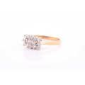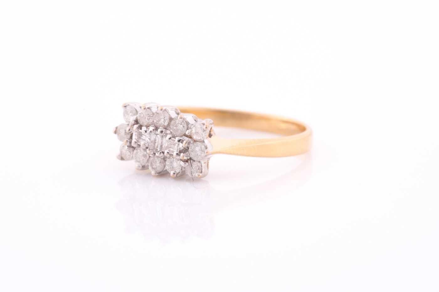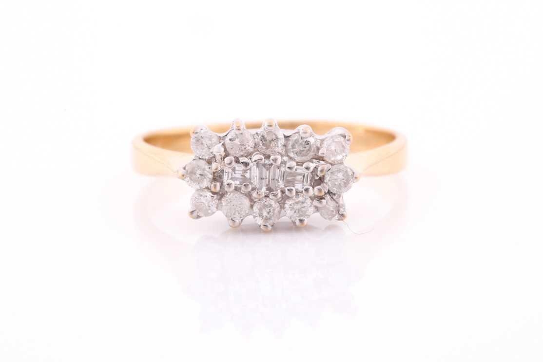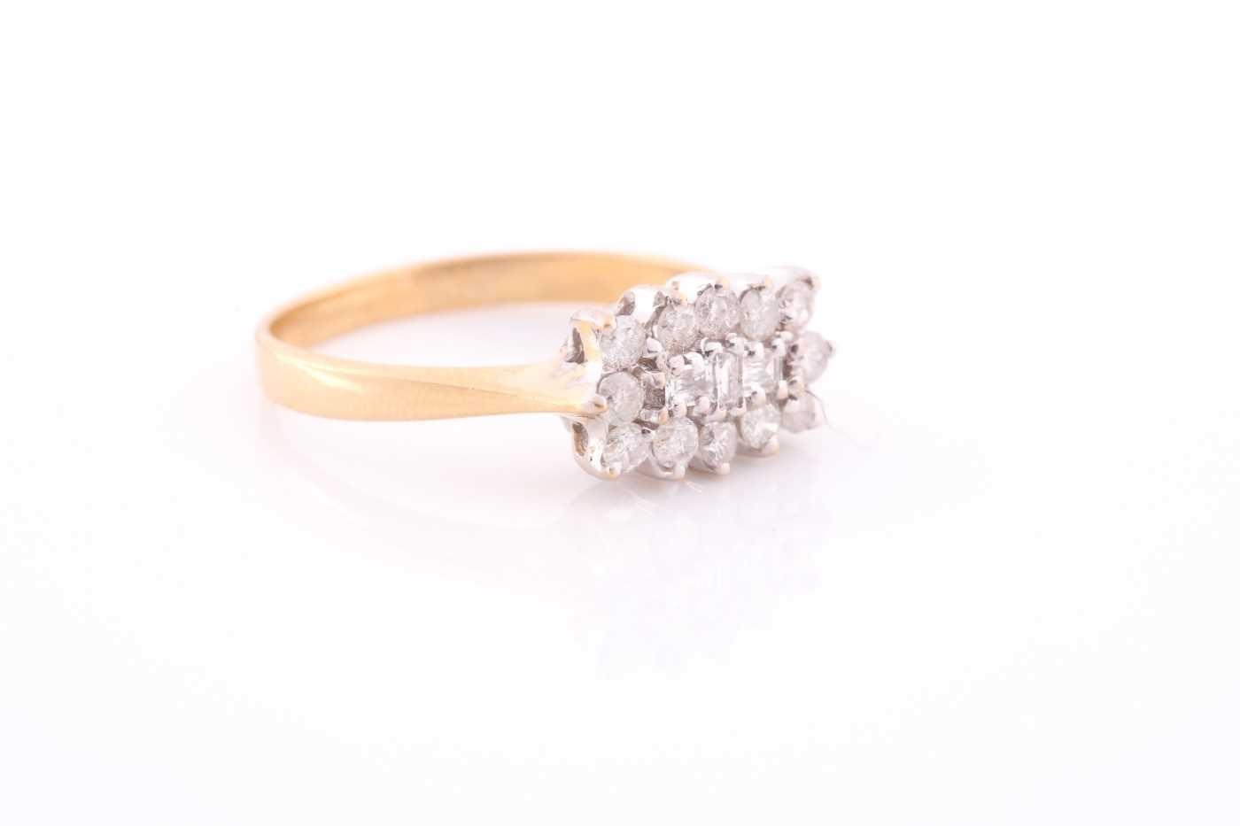 An 18ct yellow gold and diamond cluster ring, centred with three emerald-cut diamonds surrounded with round brilliant-cut diamonds, approximately 0.50 carats combined, size O, 3.5 grams.