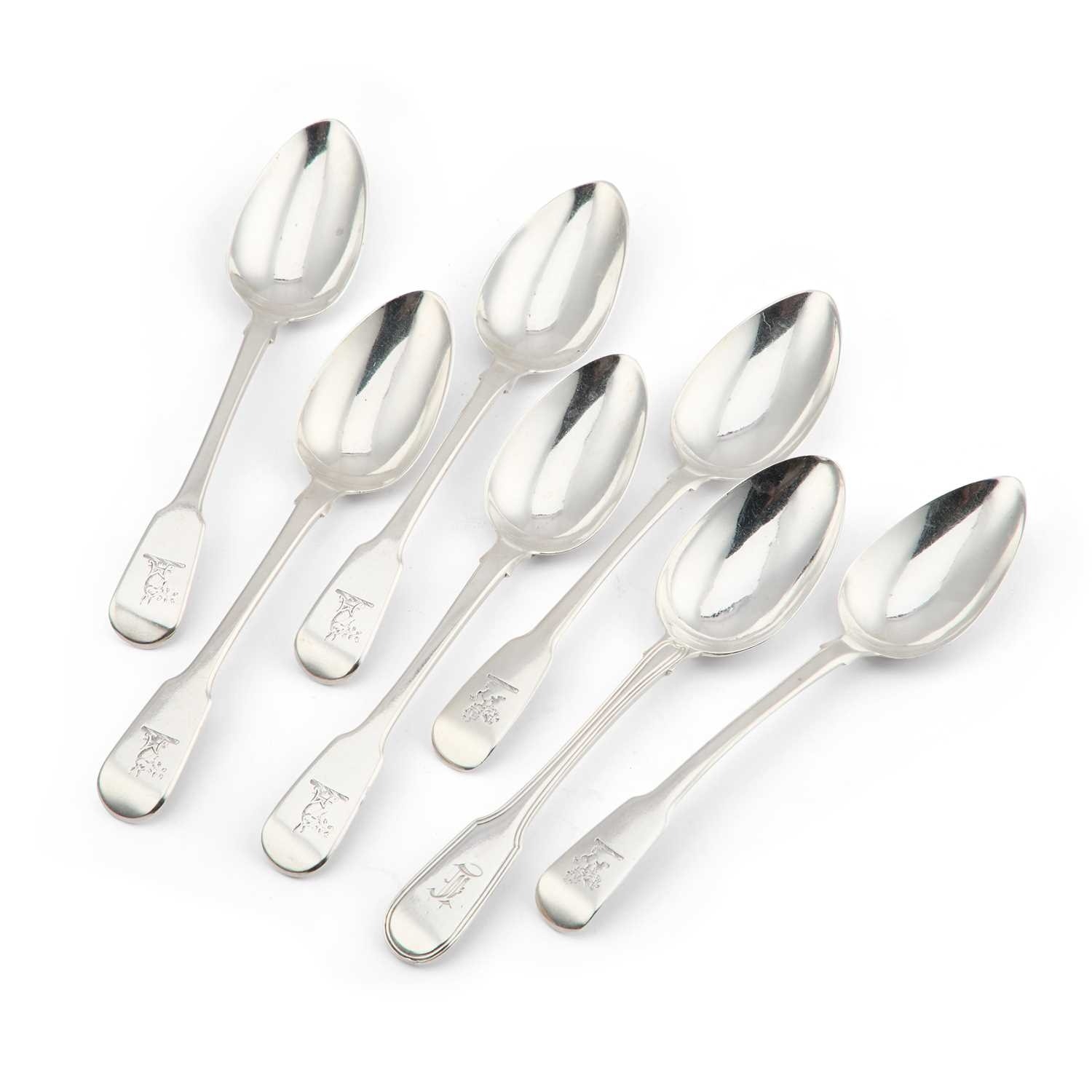 by William Chawner II, London 1824, Fiddle pattern, crested; together with three further silver dessert spoons. (7) Longest 17.5cm, 8.4 troy ounces