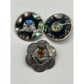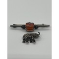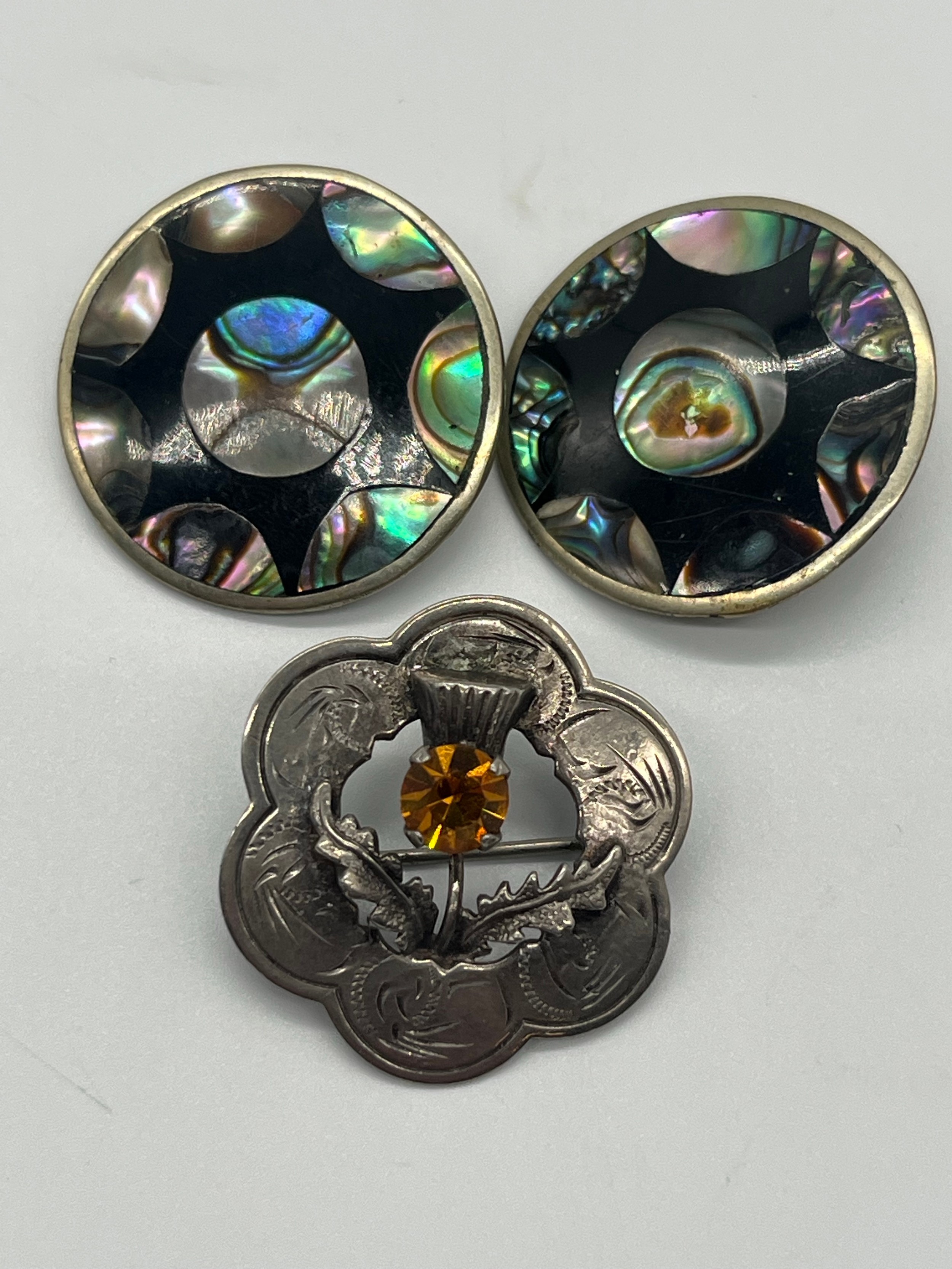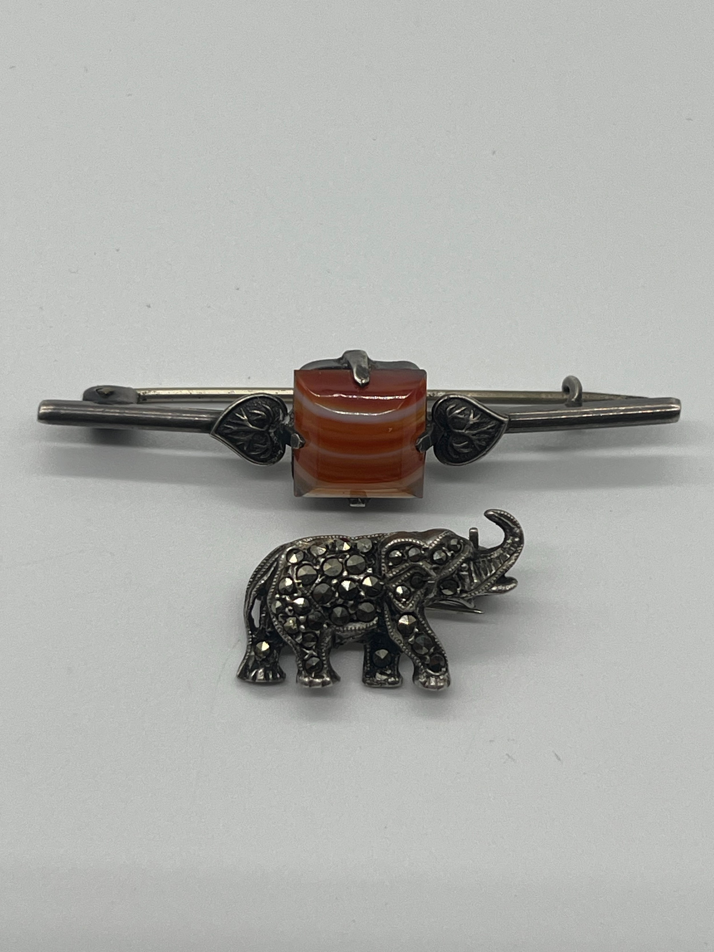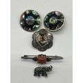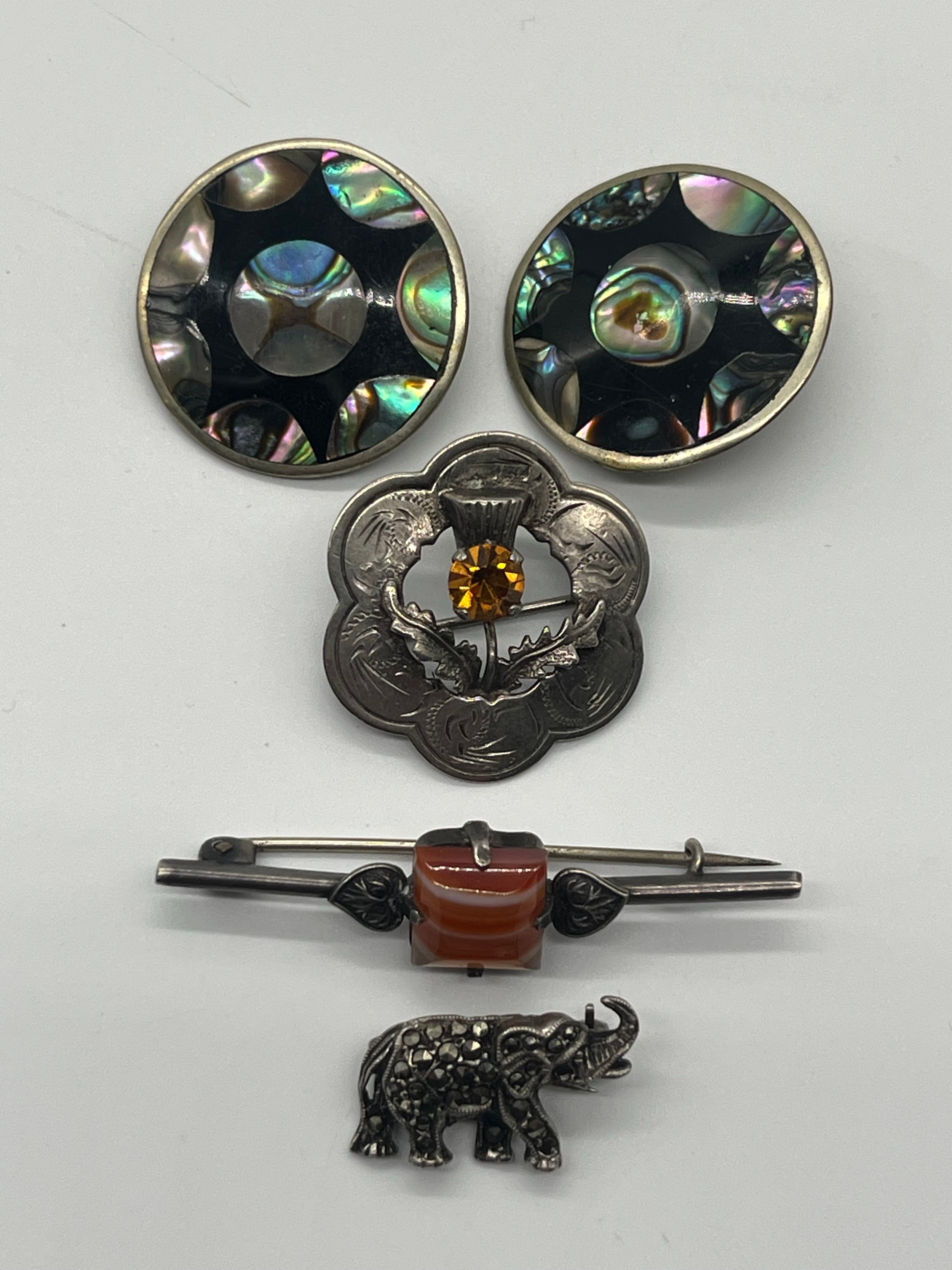 Silver and carnelian brooch, silver and marcasite elephant brooch, silver plated Scottish brooch and pair of Mexican silver and abalone earrings.