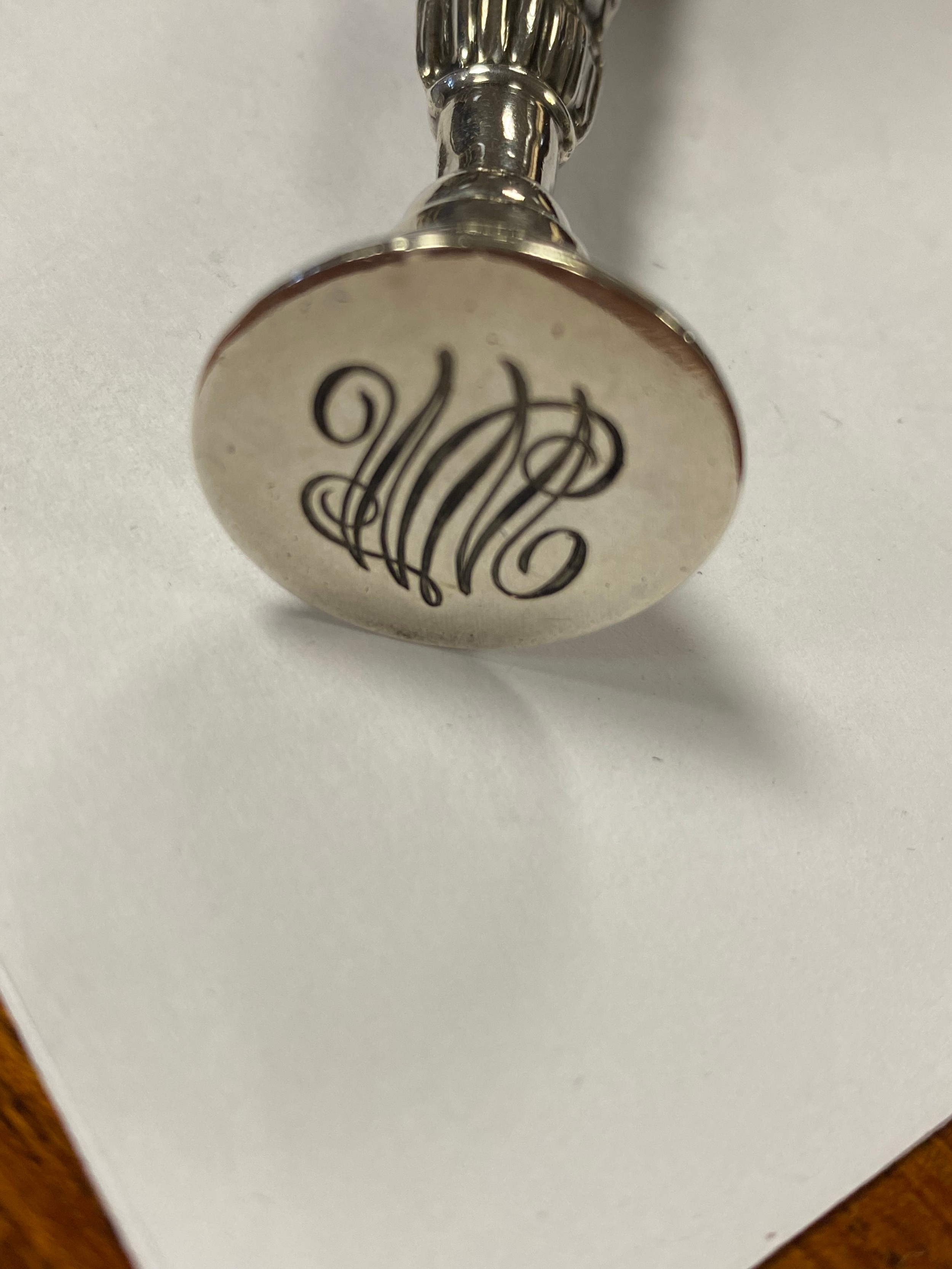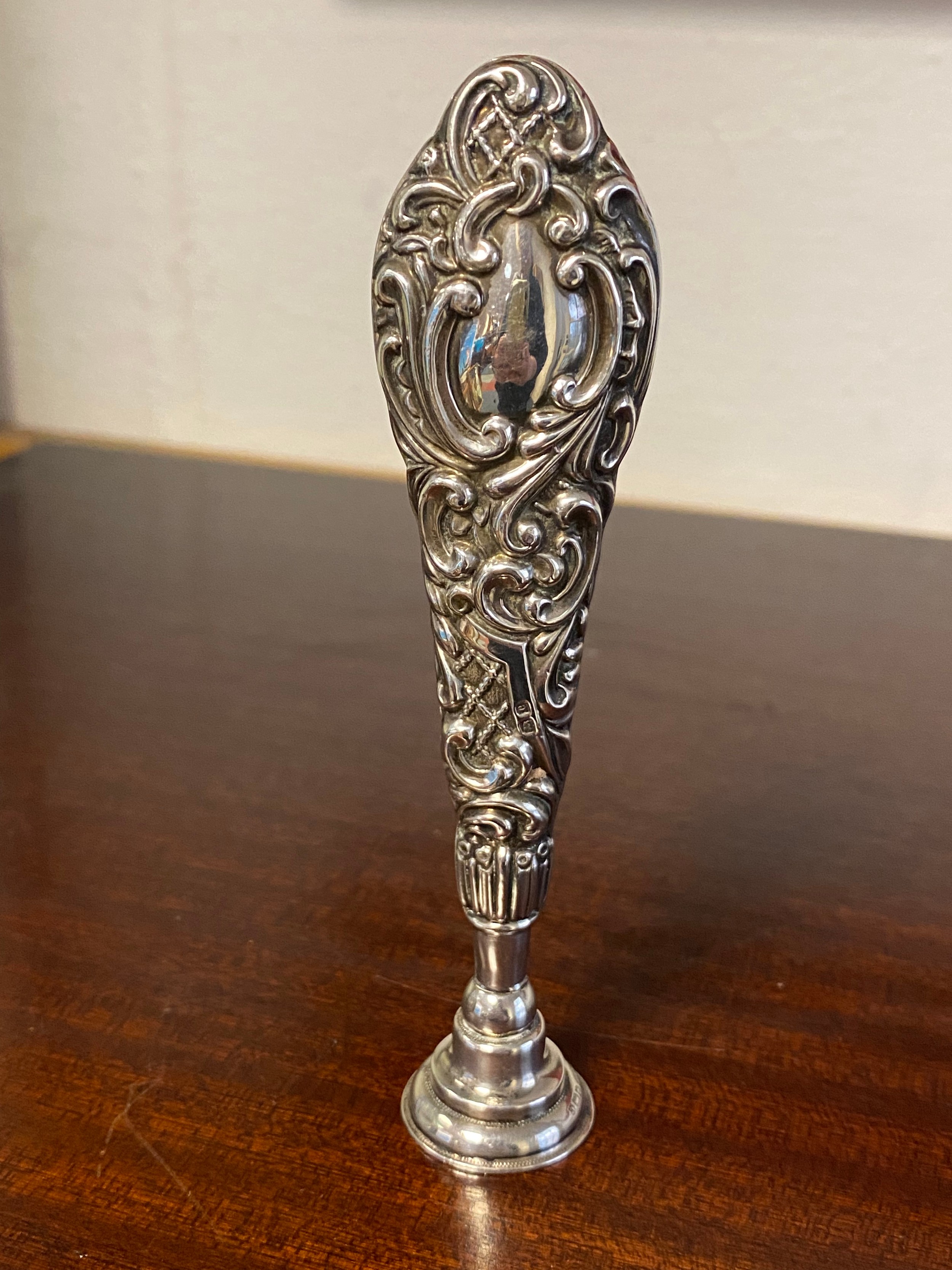 An Edwardian silver desk seal, Birmingham 1902, the handle with 'C' scroll and lattice decoration, with circular initialled seal -