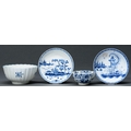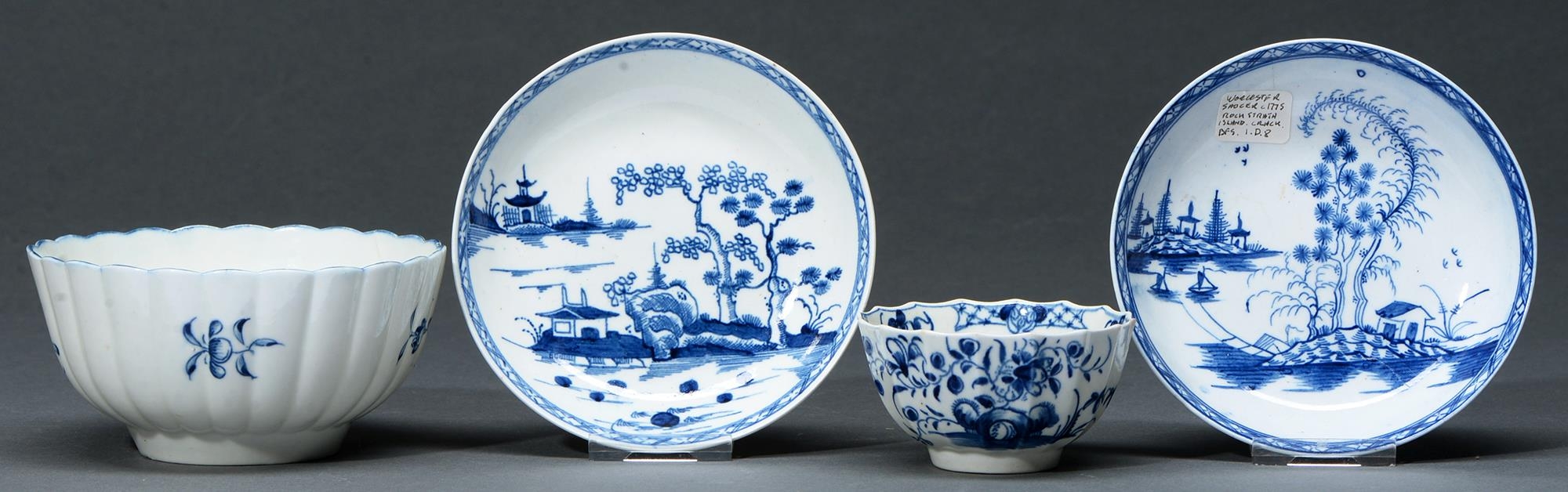 A Worcester blue and white tea bowl, slop basin and two saucers, c1758-85 painted with the Hollow Rock, Lily, Gillyflower, Cannonball or Rock Strata Island patterns, 8 and 12cm diam, painted open crescent or script W in underglaze blue or unmarked
