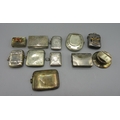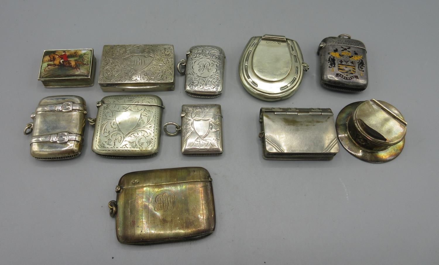 Art Deco silver monogrammed vesta case with stripes of engine turned pattern by S Blanckensee & Son Ltd, Chester 1922, and a collection of silver vesta cases and snuff boxes with various dates and makers, silver weight 5.57, and four silver plate vesta cases