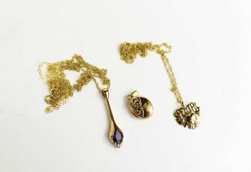 A 9ct gold and amethyst set pendant, with fine link chain, a 9ct gold locket and chain and a 'Special Mum' pendant with 9ct gold chain, combined weight 4.38g.