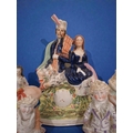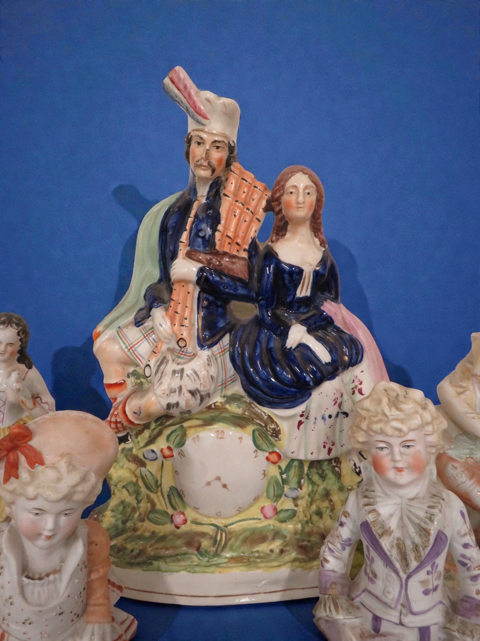 Collection of Staffordshire pottery figures, tallest 14 inches. Group of approximately ten Victorian flatback figures and groups including romantic couples, figures with lambs and dogs, Turkish or Eastern-inspired couple with feathered headdress, decorative spill vases, and various genre subjects typical of 19th century Staffordshire production. Hand-painted enamels with period colors and gilt highlights. Mixed sizes with tallest example at 14 inches. Traditional cottage pottery appealing to Staffordshire collectors.