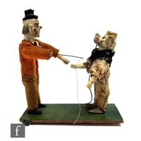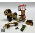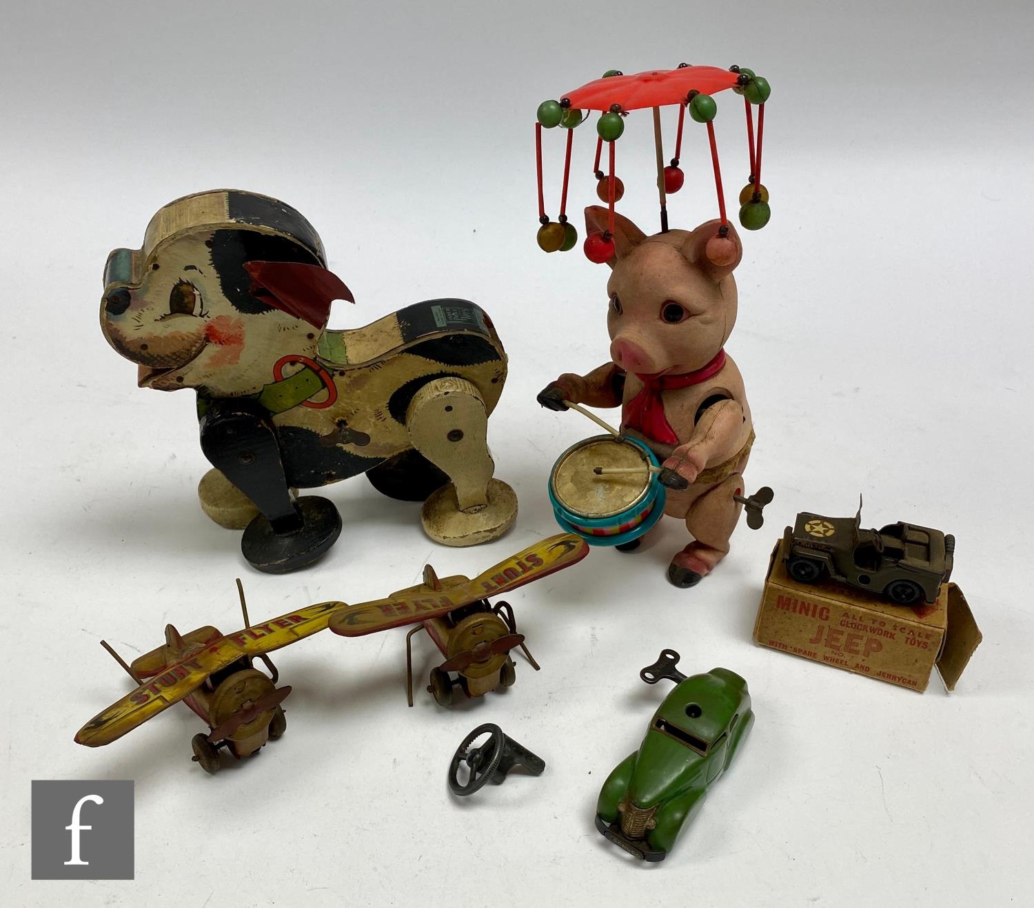 A collection of assorted clockwork toys to include a Schuco 3000 Telesteering car in green with steering wheel accessory, a pre-war Japanese Shimazaki celluloid drumming pig, a boxed Triang Minic No. 1 Jeep, a Fisher Price Puppy Bak-Up and two Suzuki Stunt Flyer aeroplanes, all S/D. (6)