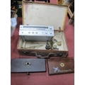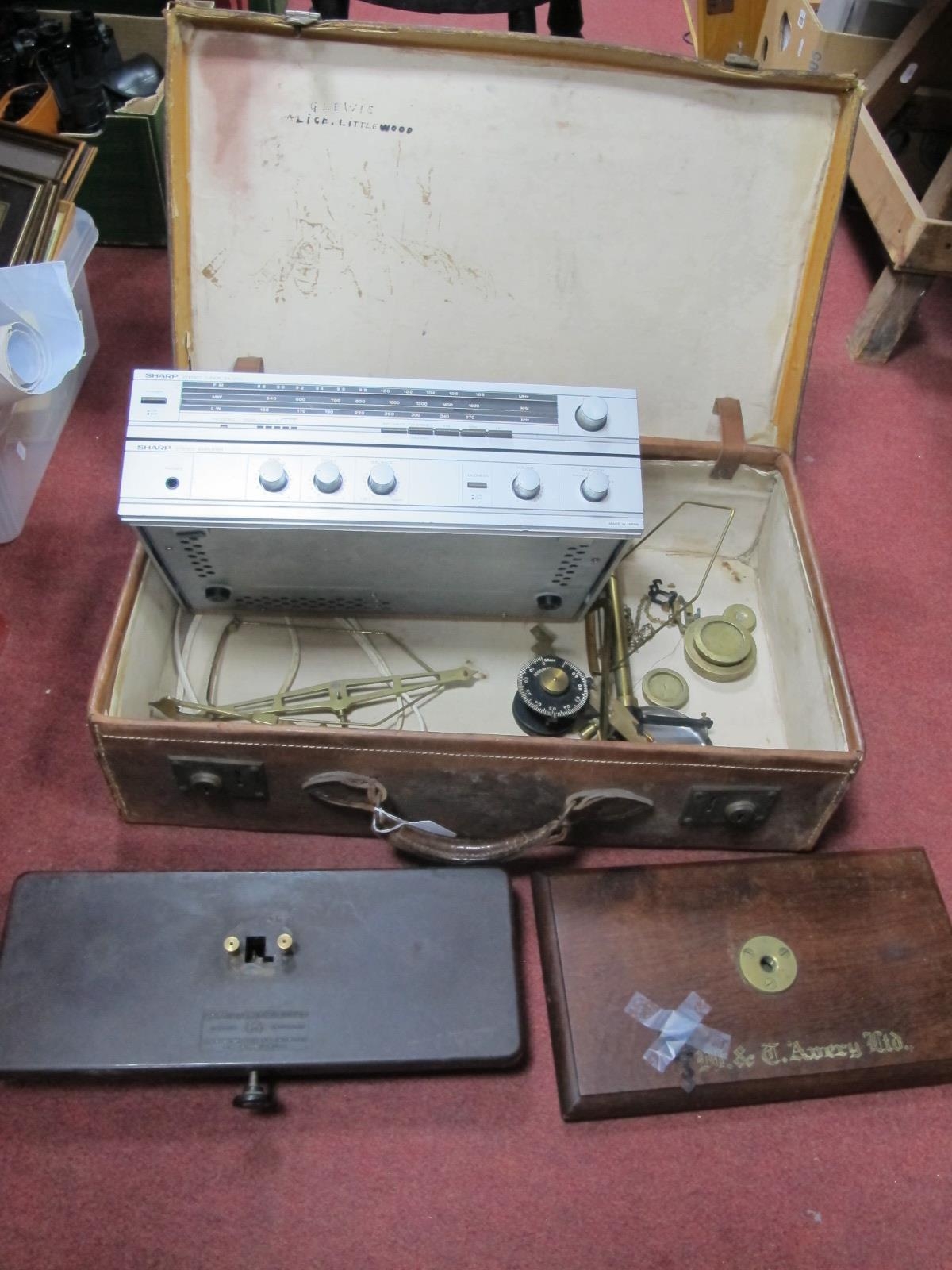 Griffin and George Bakelite Based Balance Scales, and early Avery set on wooden base, brass weights, Sharp tuner SA-200E, leather case.