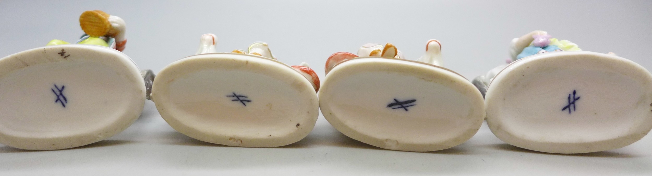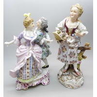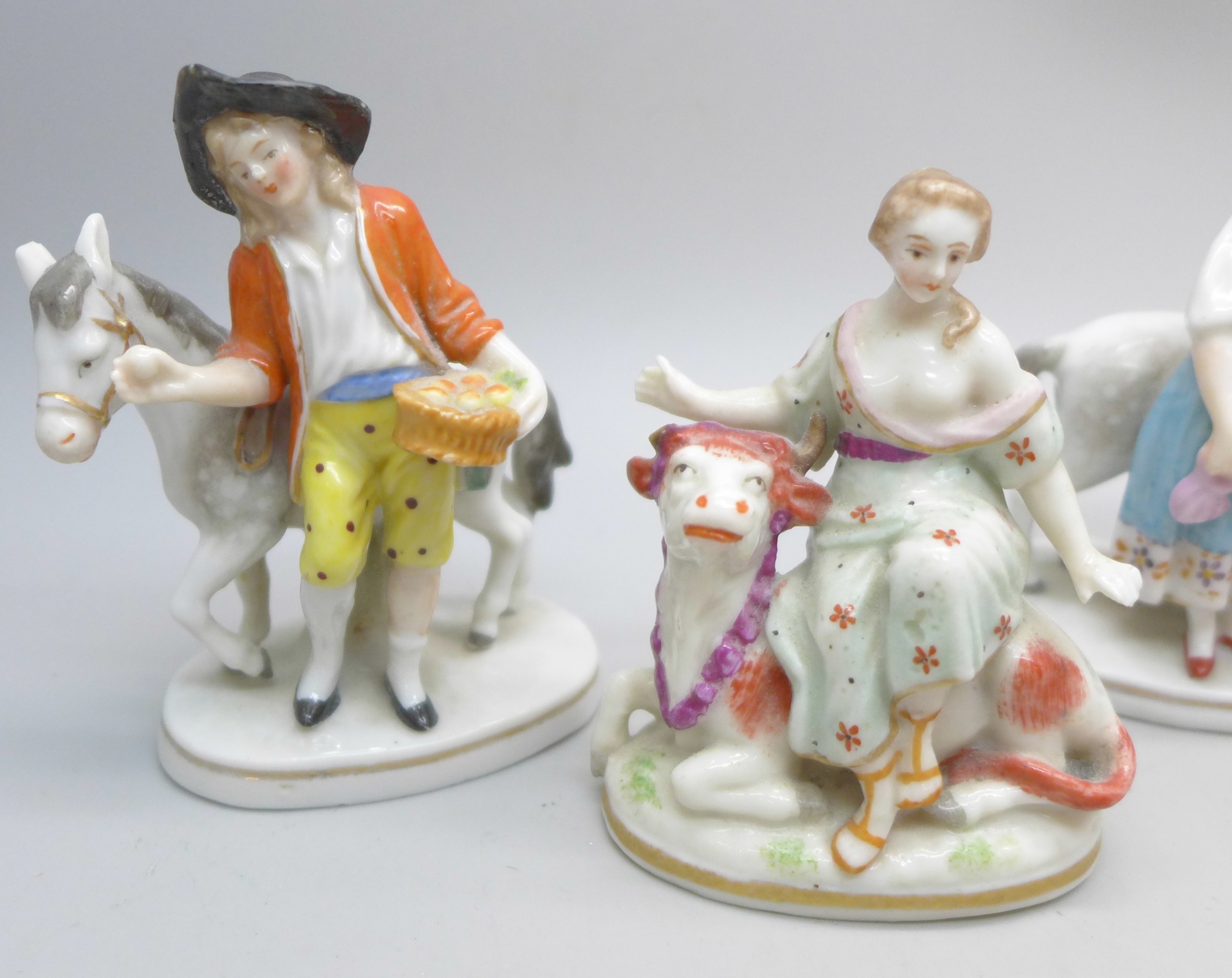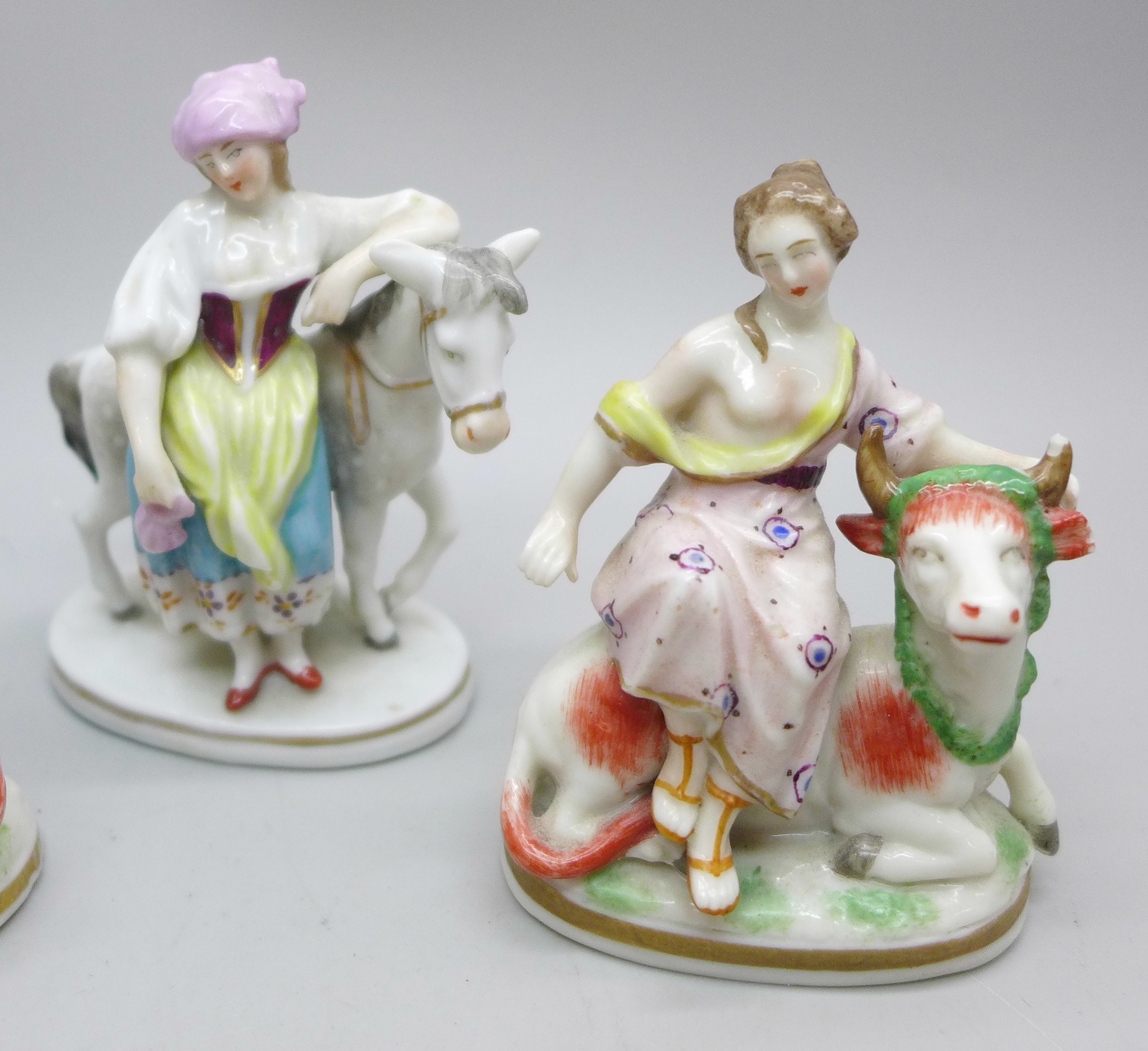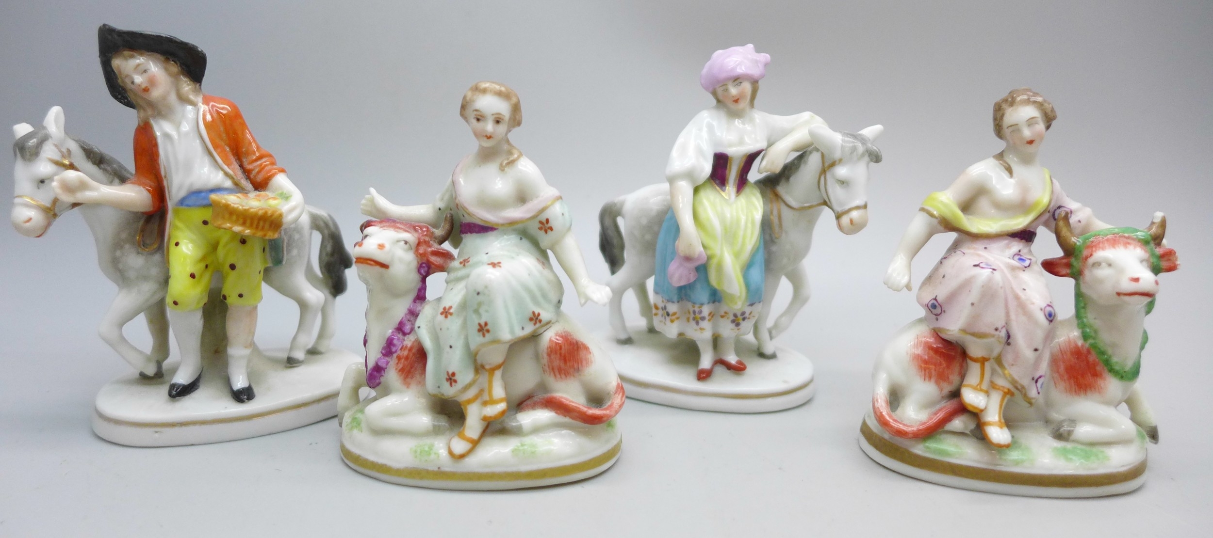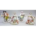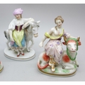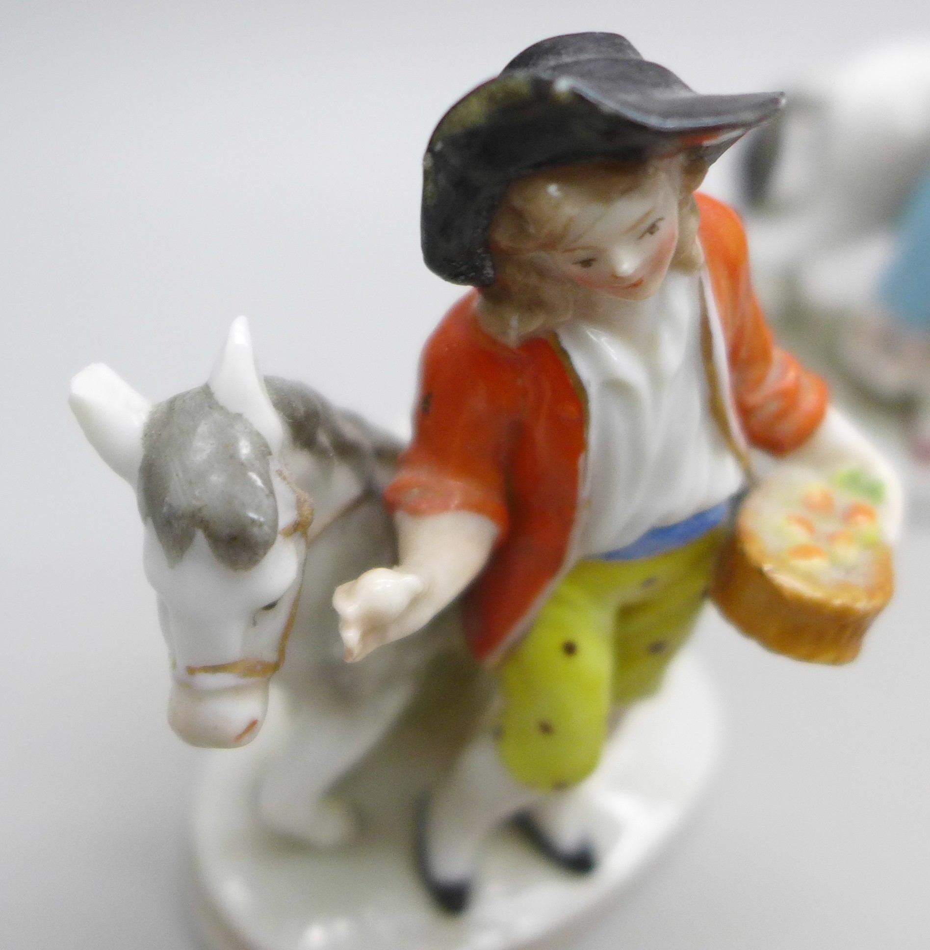 A collection of four miniature porcelain figures with Sitzendorf mark, (3 a/f)
