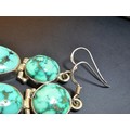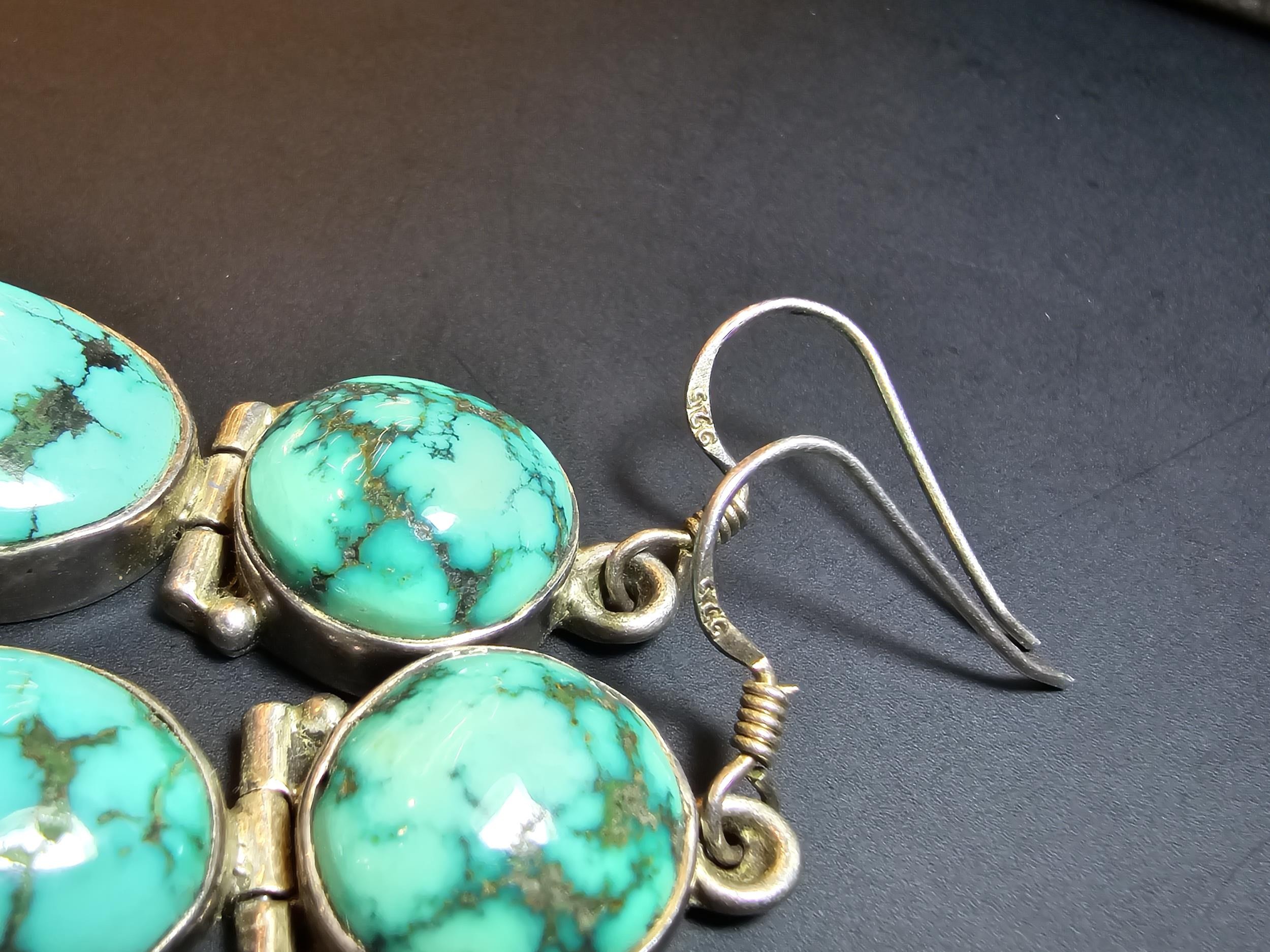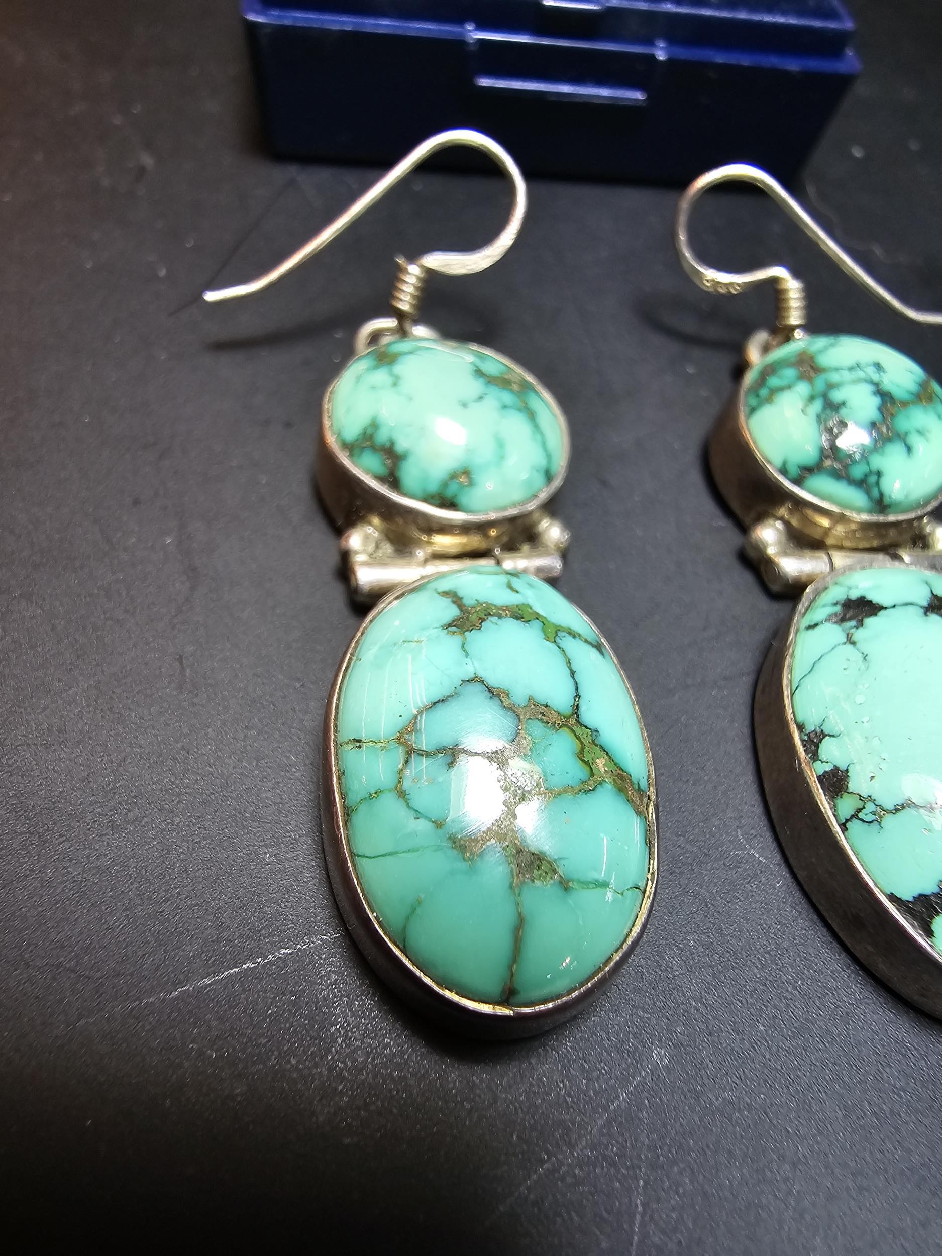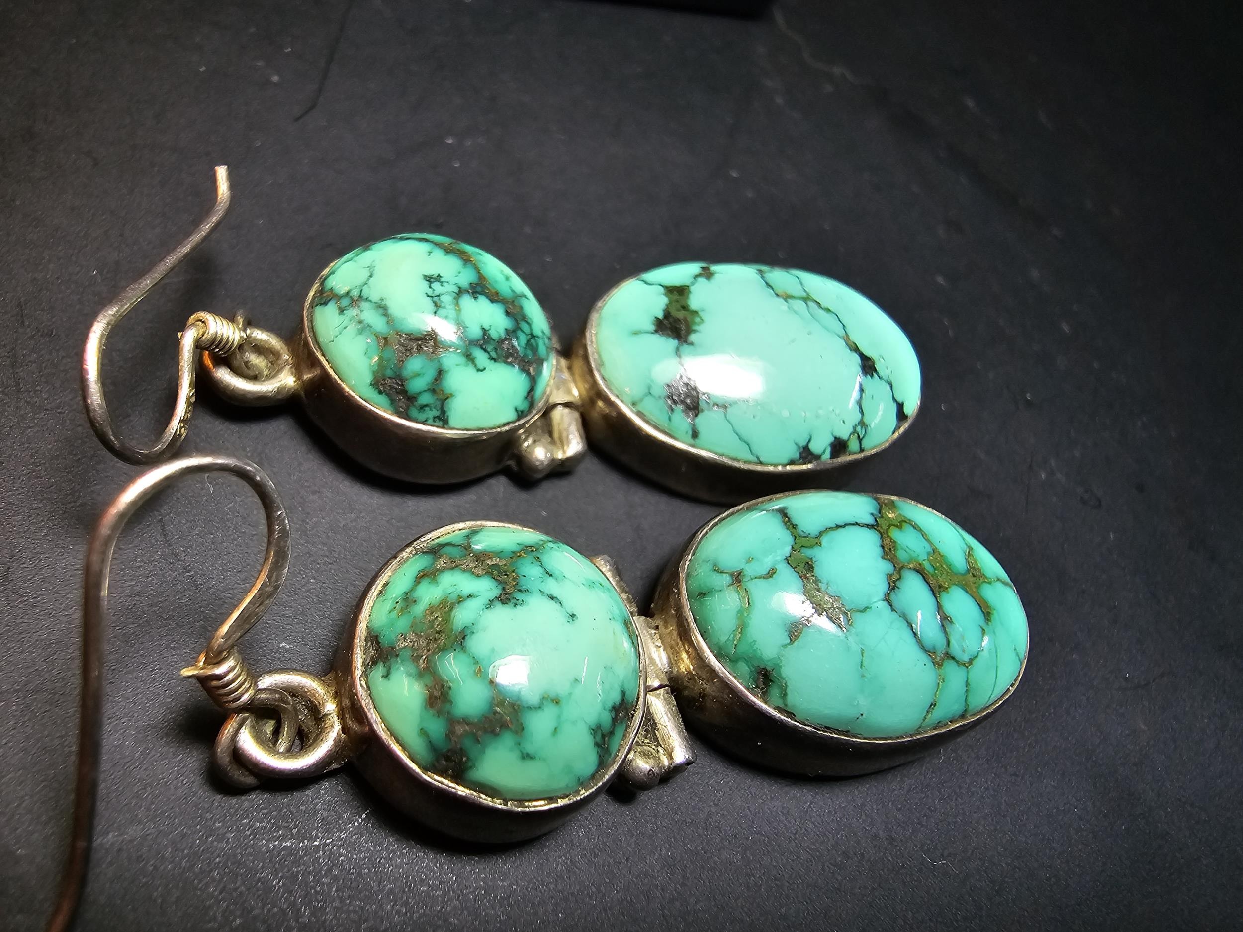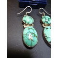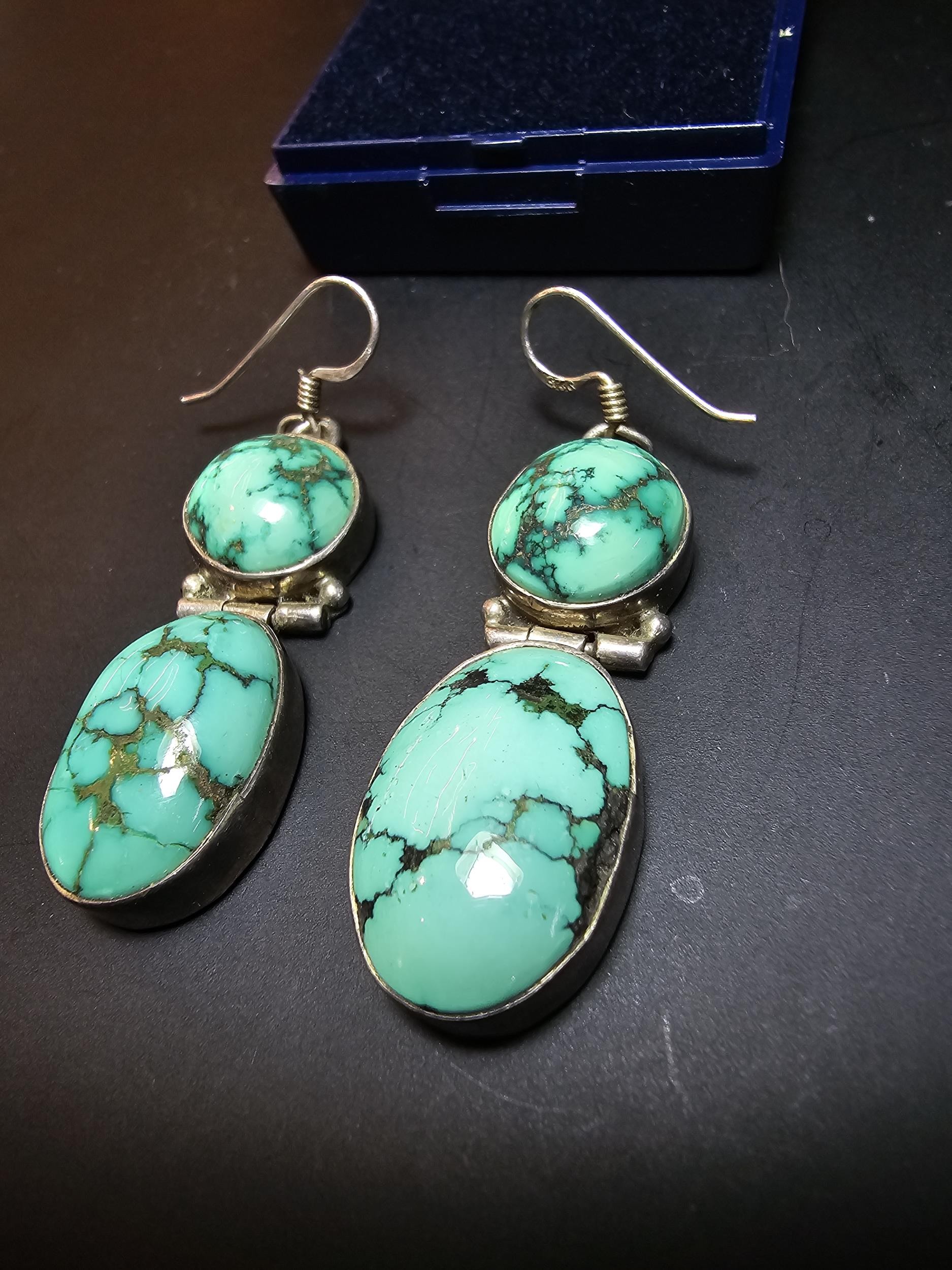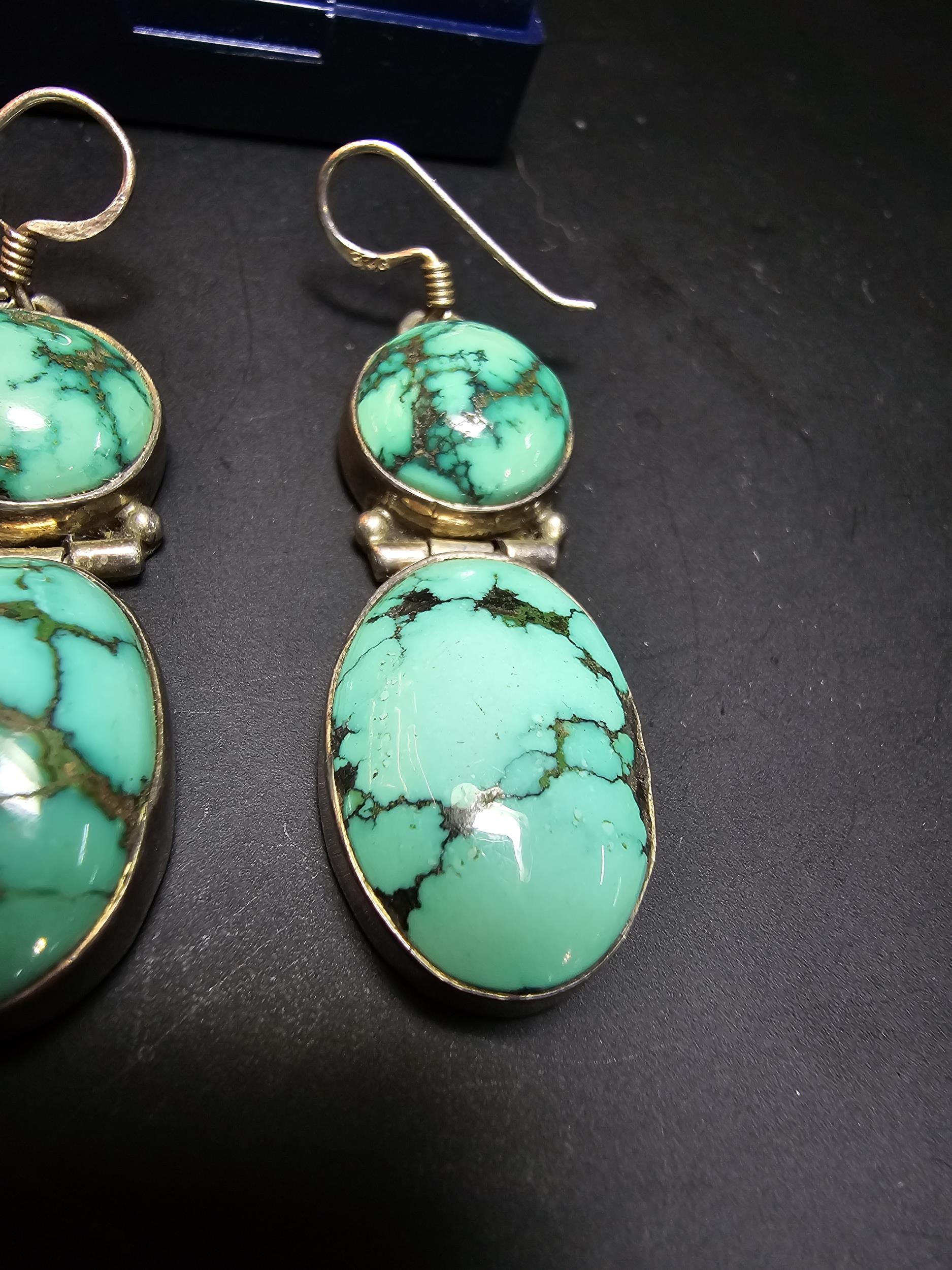 A good quality vintage 925 silver pair of drop earrings inset with 2 large natural turquoise stones to reach earring, each drop earring is also hinged. In Excellent clean condition and display well. Length of the drop is 45mm, in good clean condition and boxed.