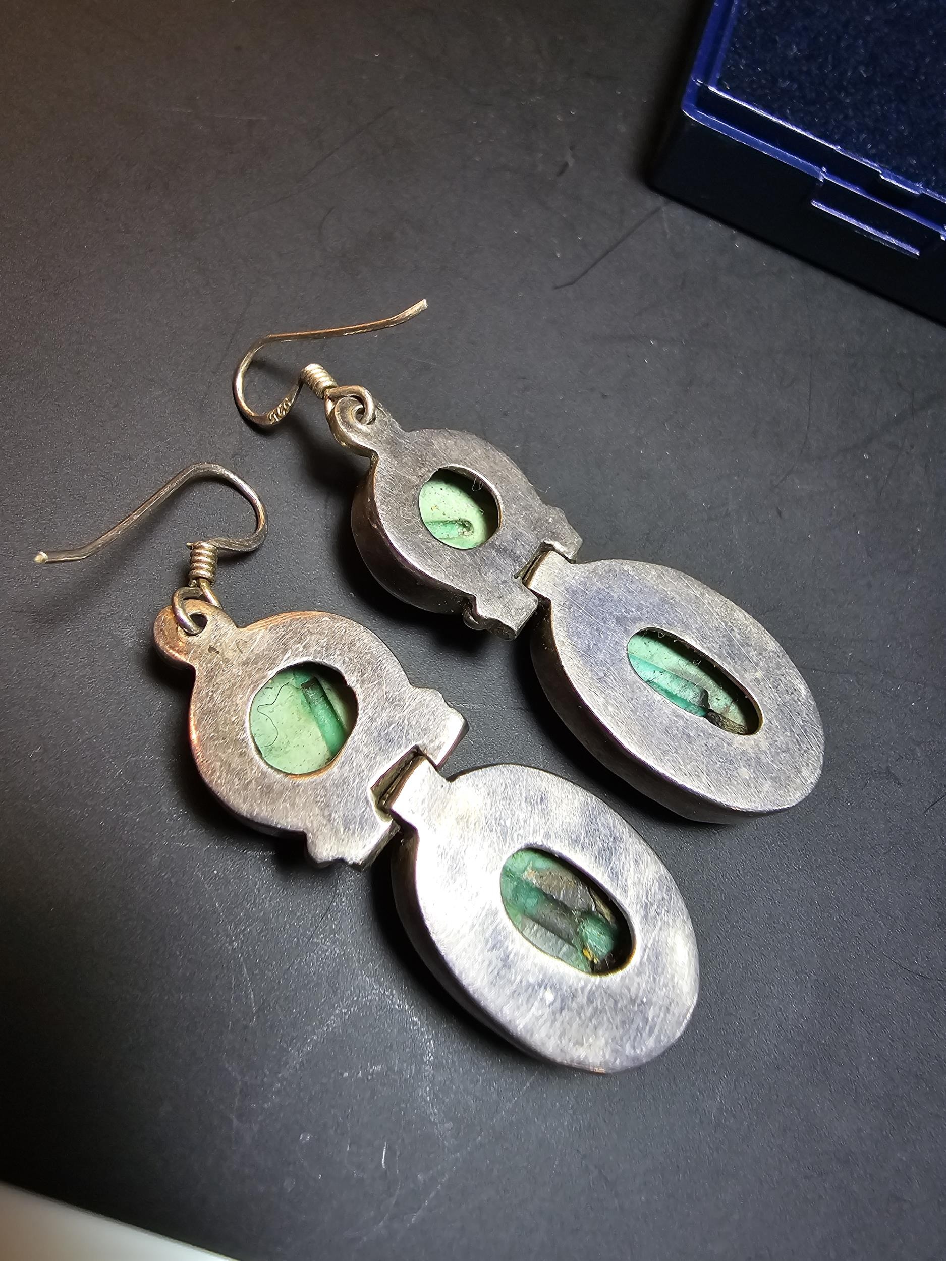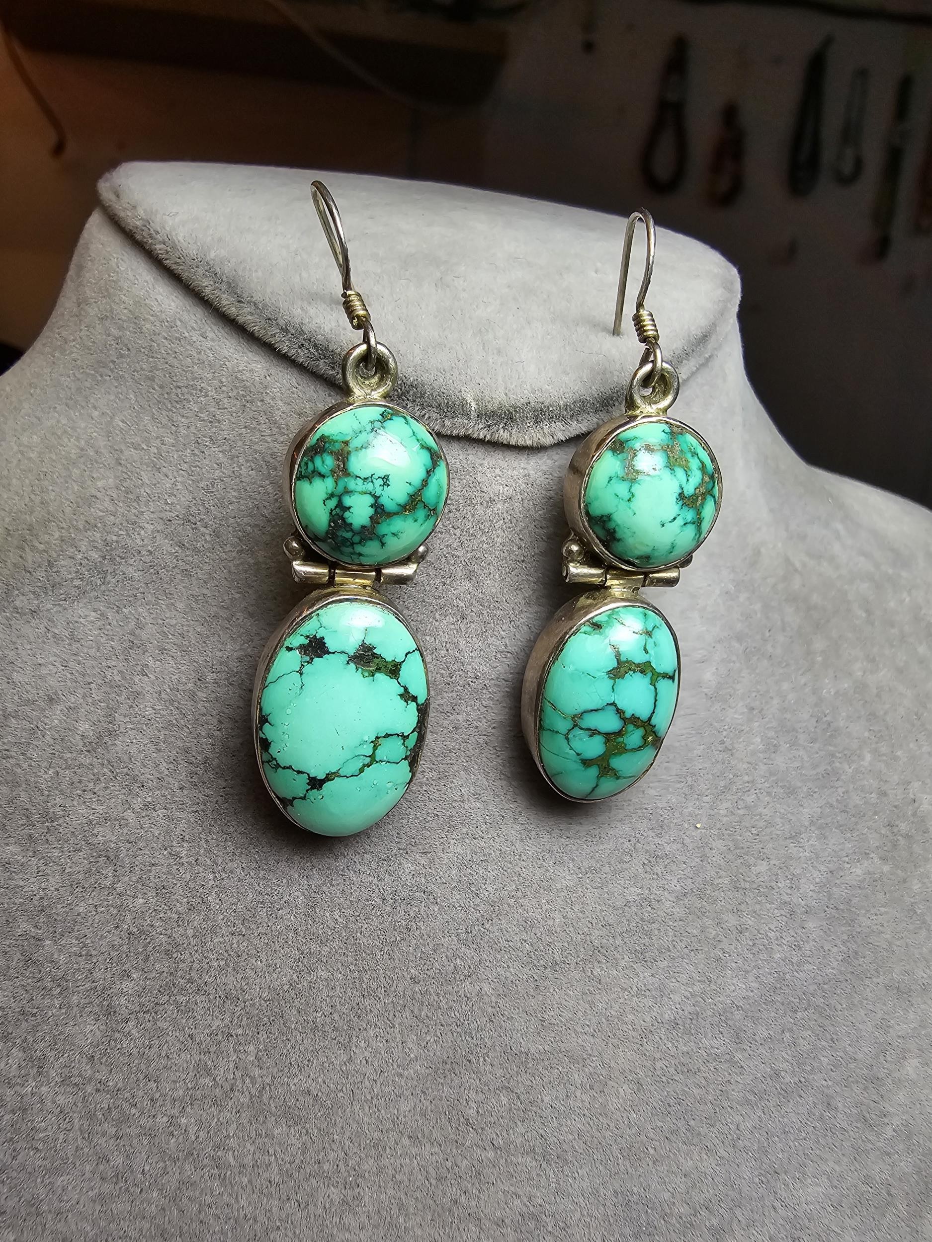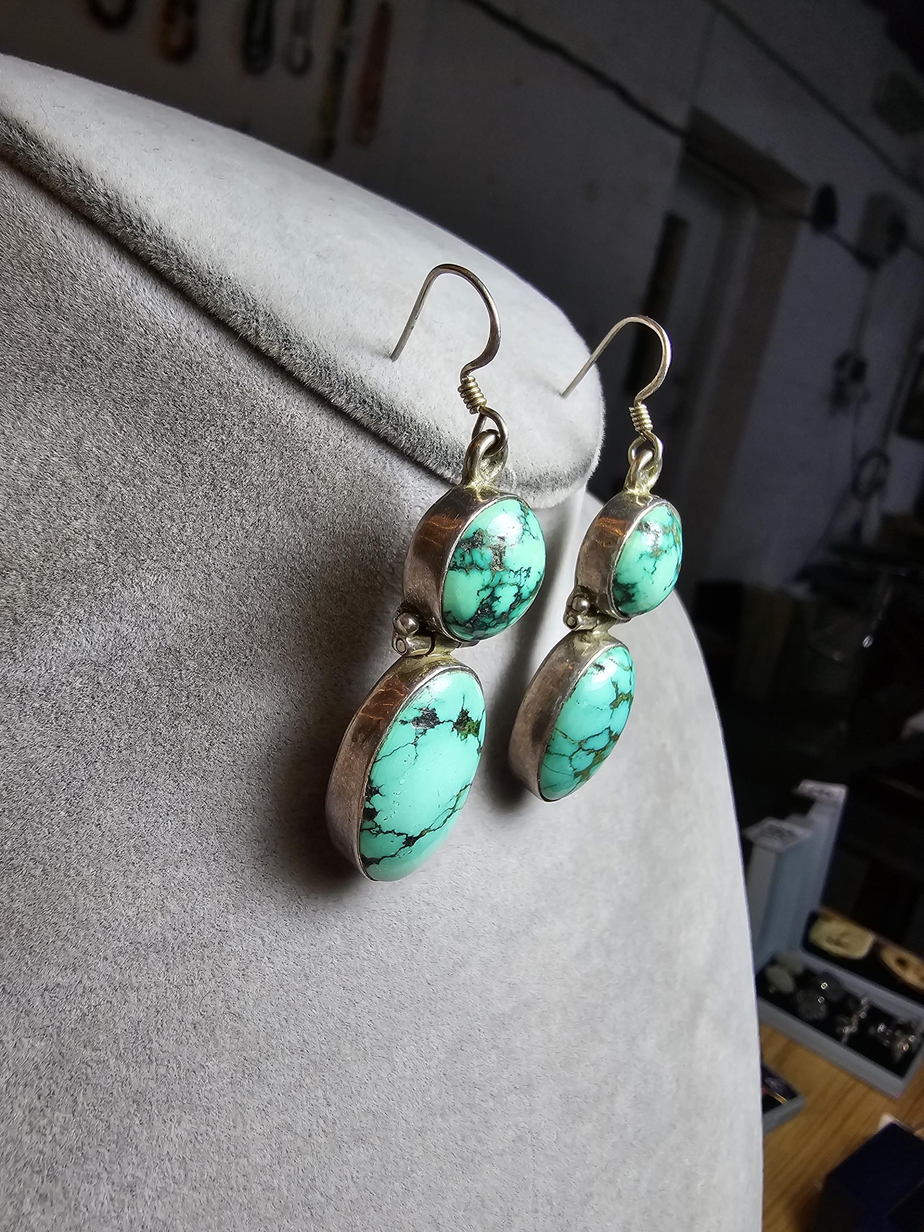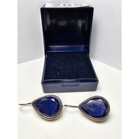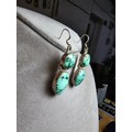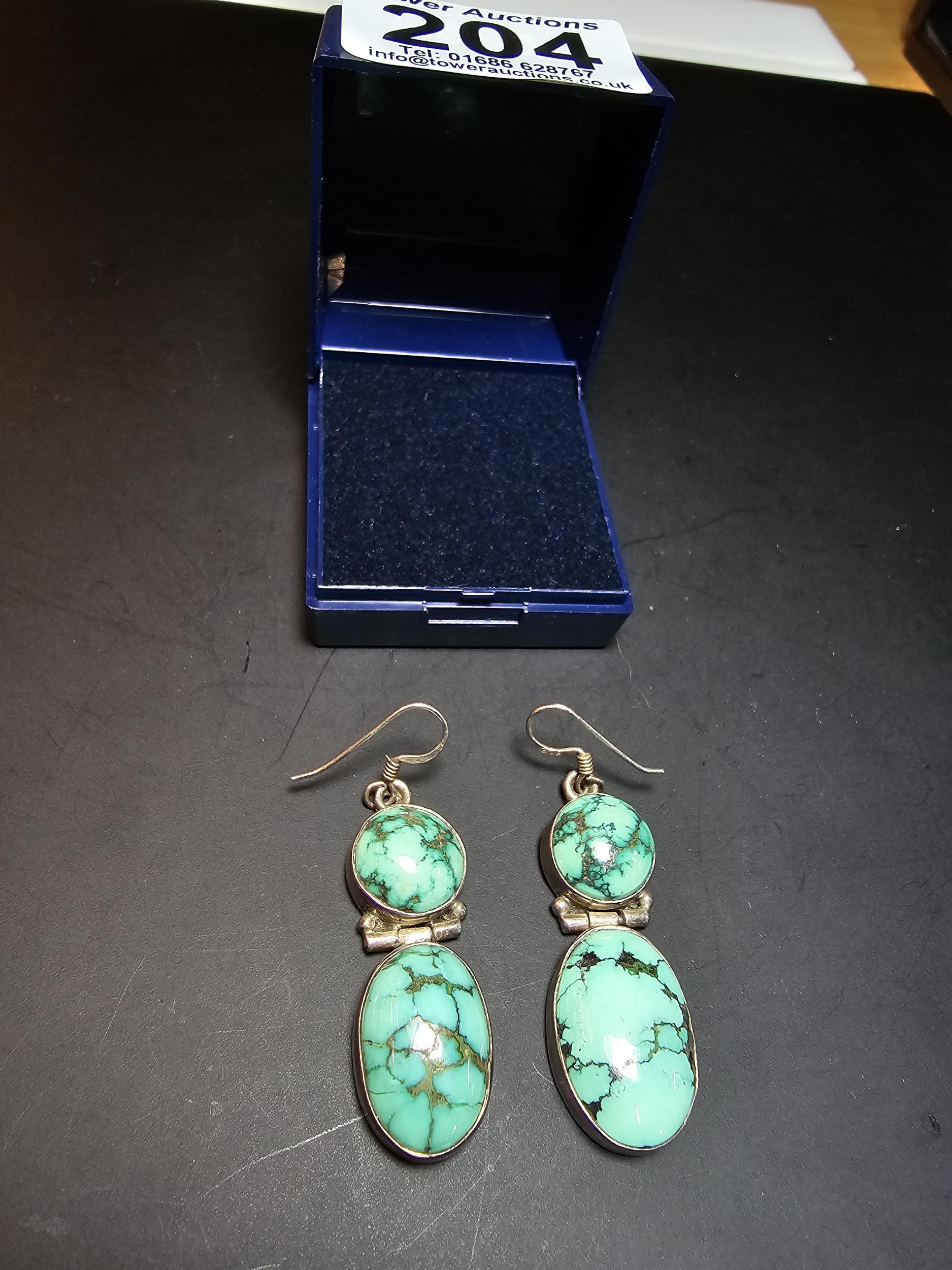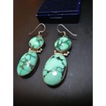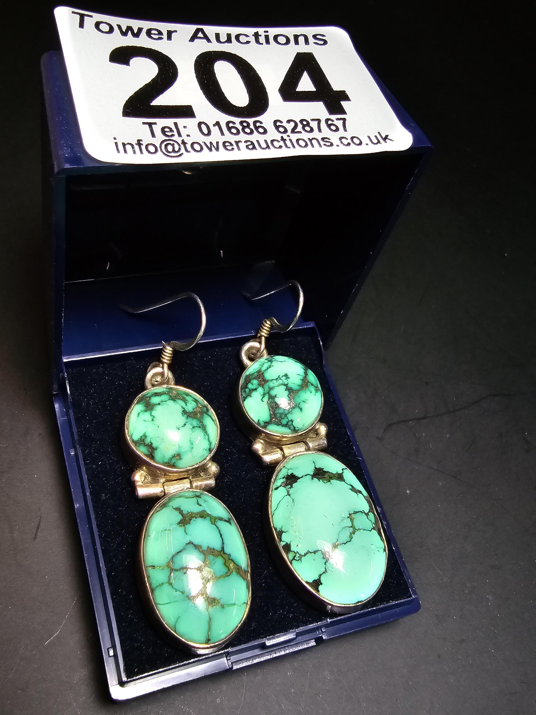 A good quality vintage 925 silver pair of drop earrings inset with 2 large natural turquoise stones to reach earring, each drop earring is also hinged. In Excellent clean condition and display well. Length of the drop is 45mm, in good clean condition and boxed.