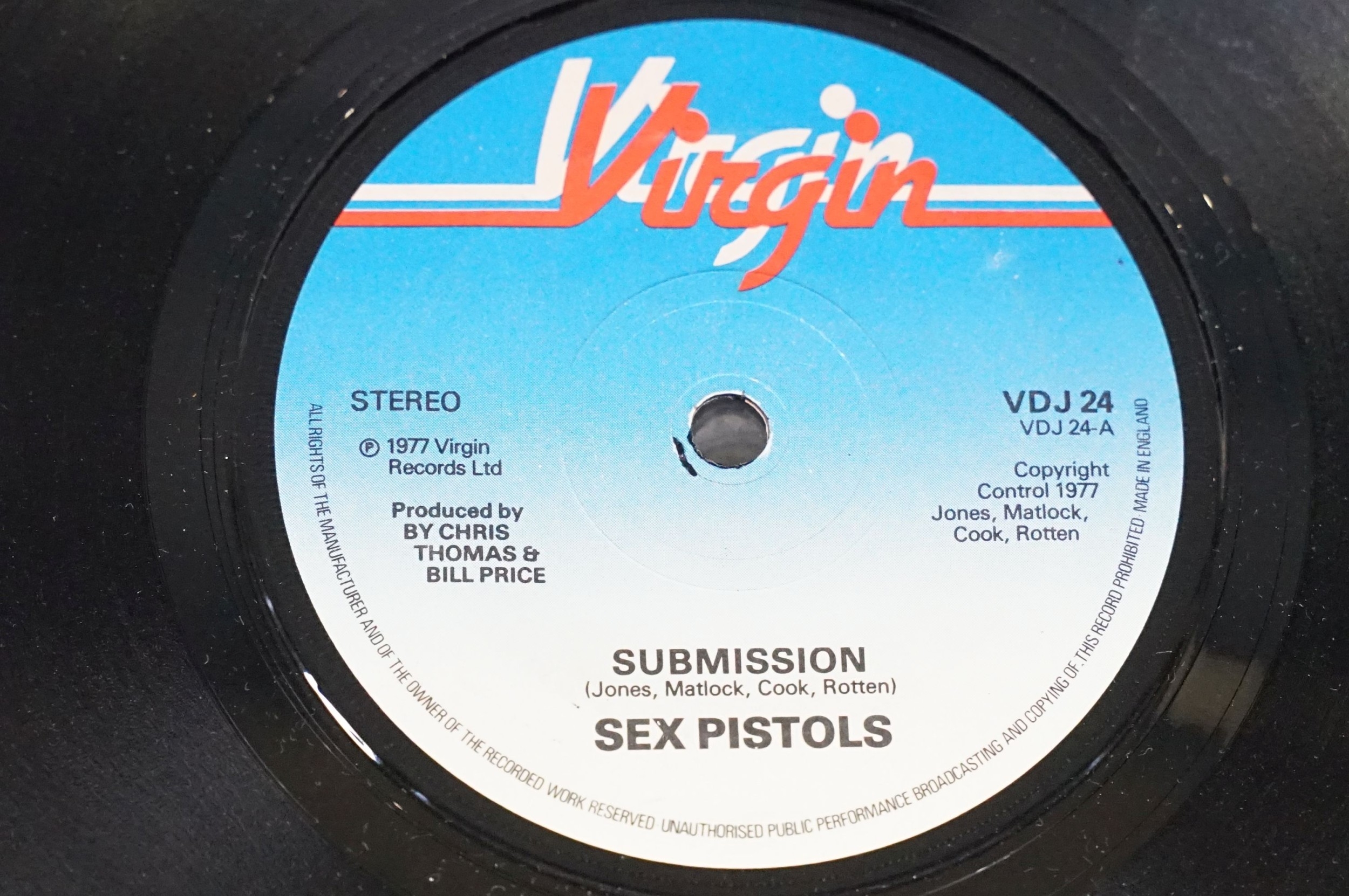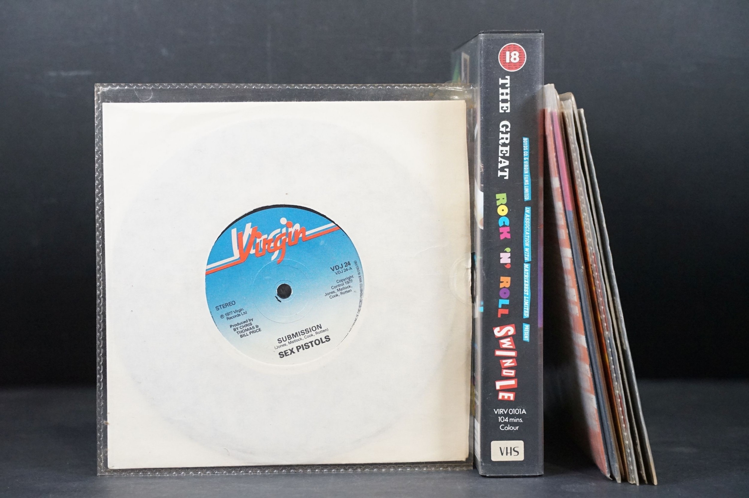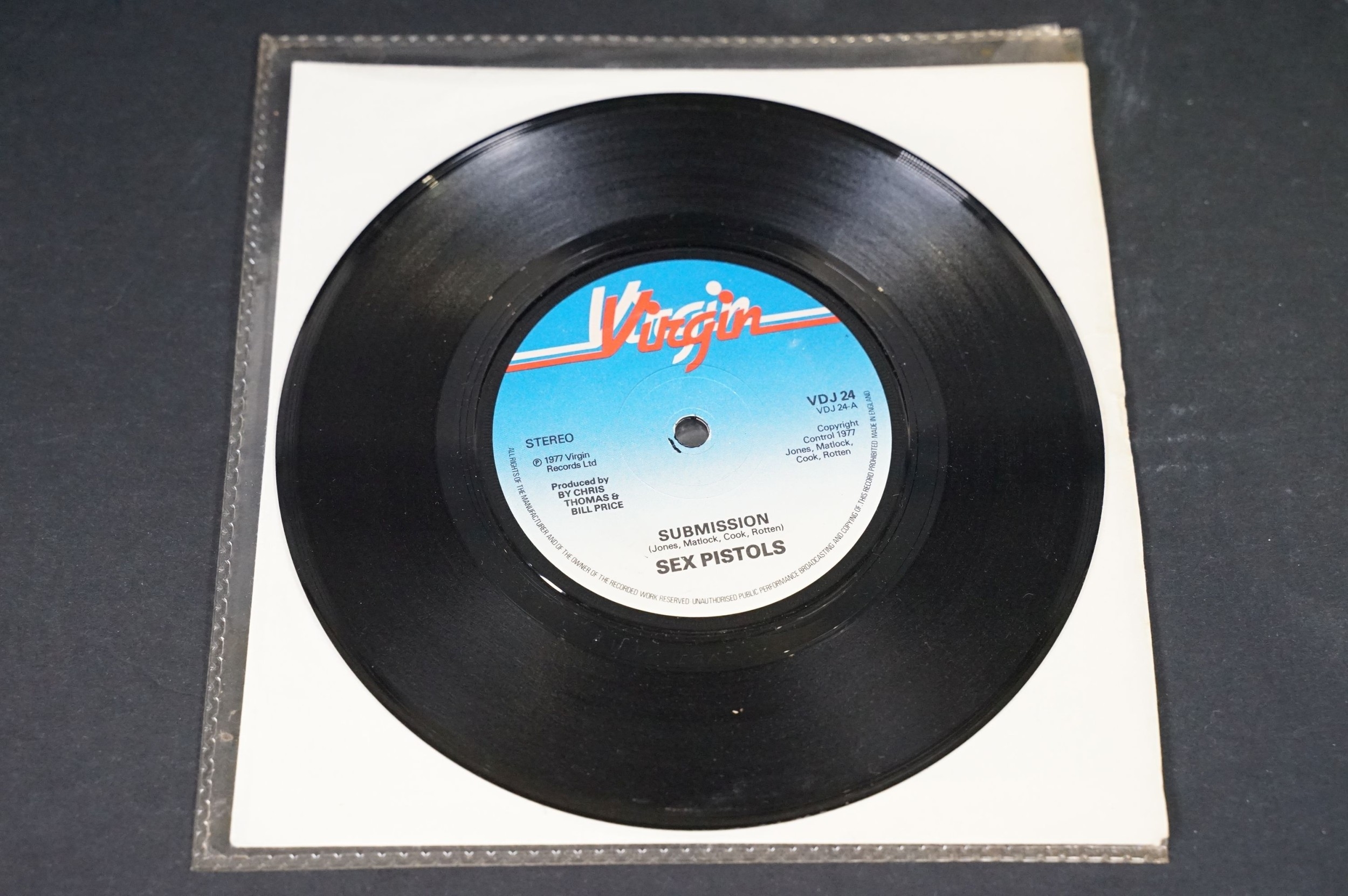 Vinyl - 8 Sex Pistols 7" singles and 1 DVD to include Submission (single sided VDJ24), Pretty Vacant, The Great Rock N Roll Swindle, Stepping Stone, Holidays In The Sun (French) and others. Vg+ overall