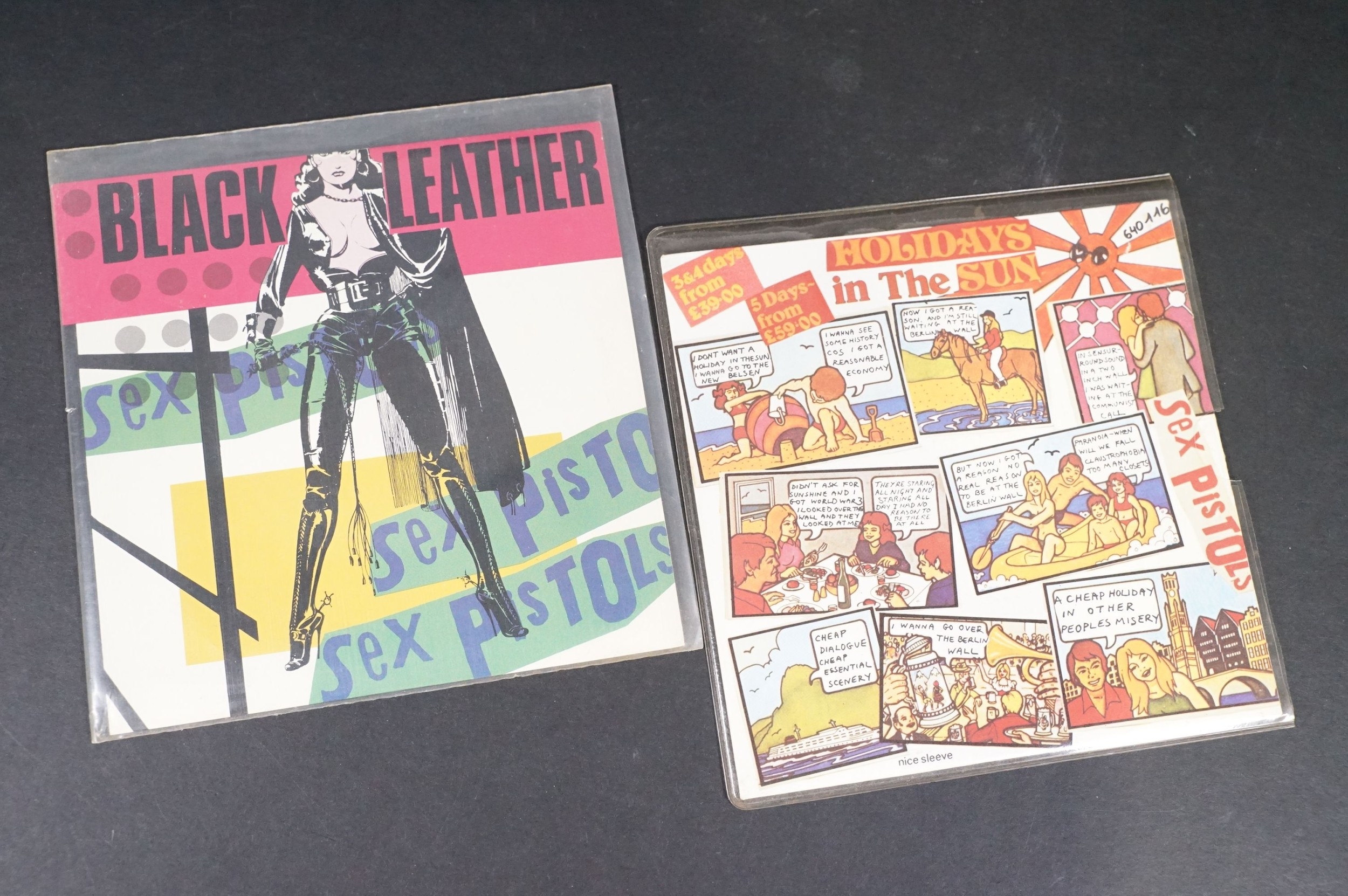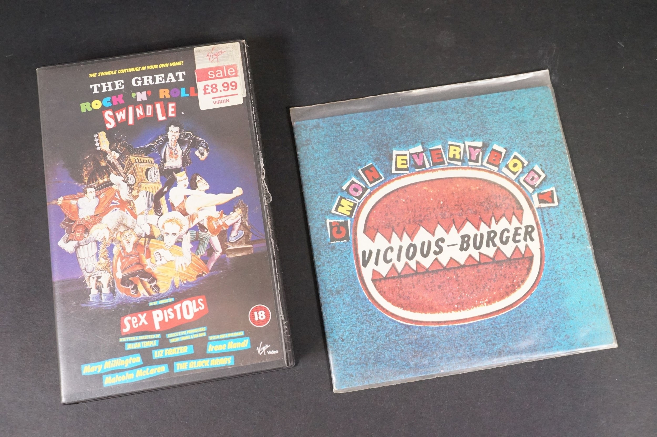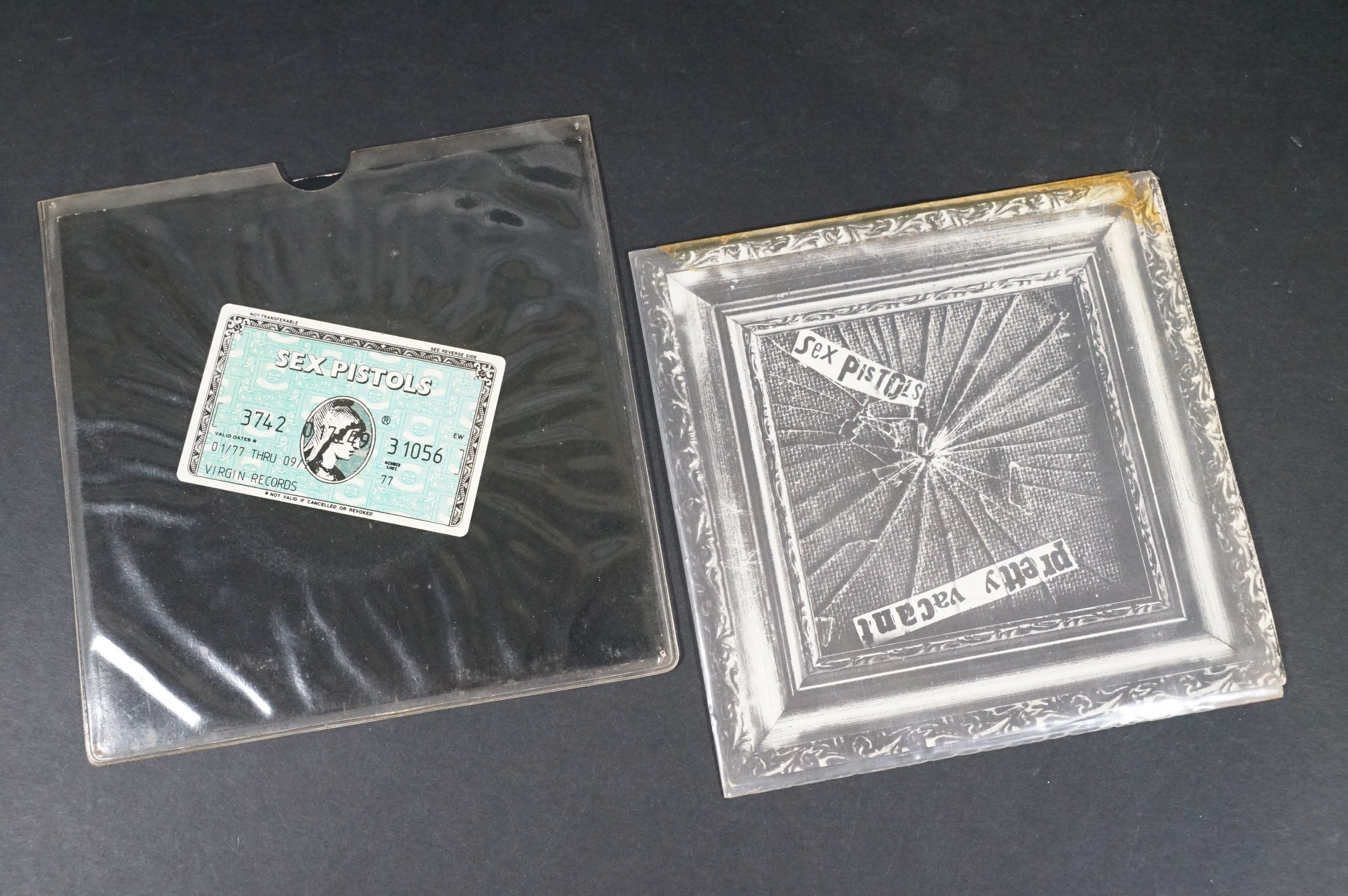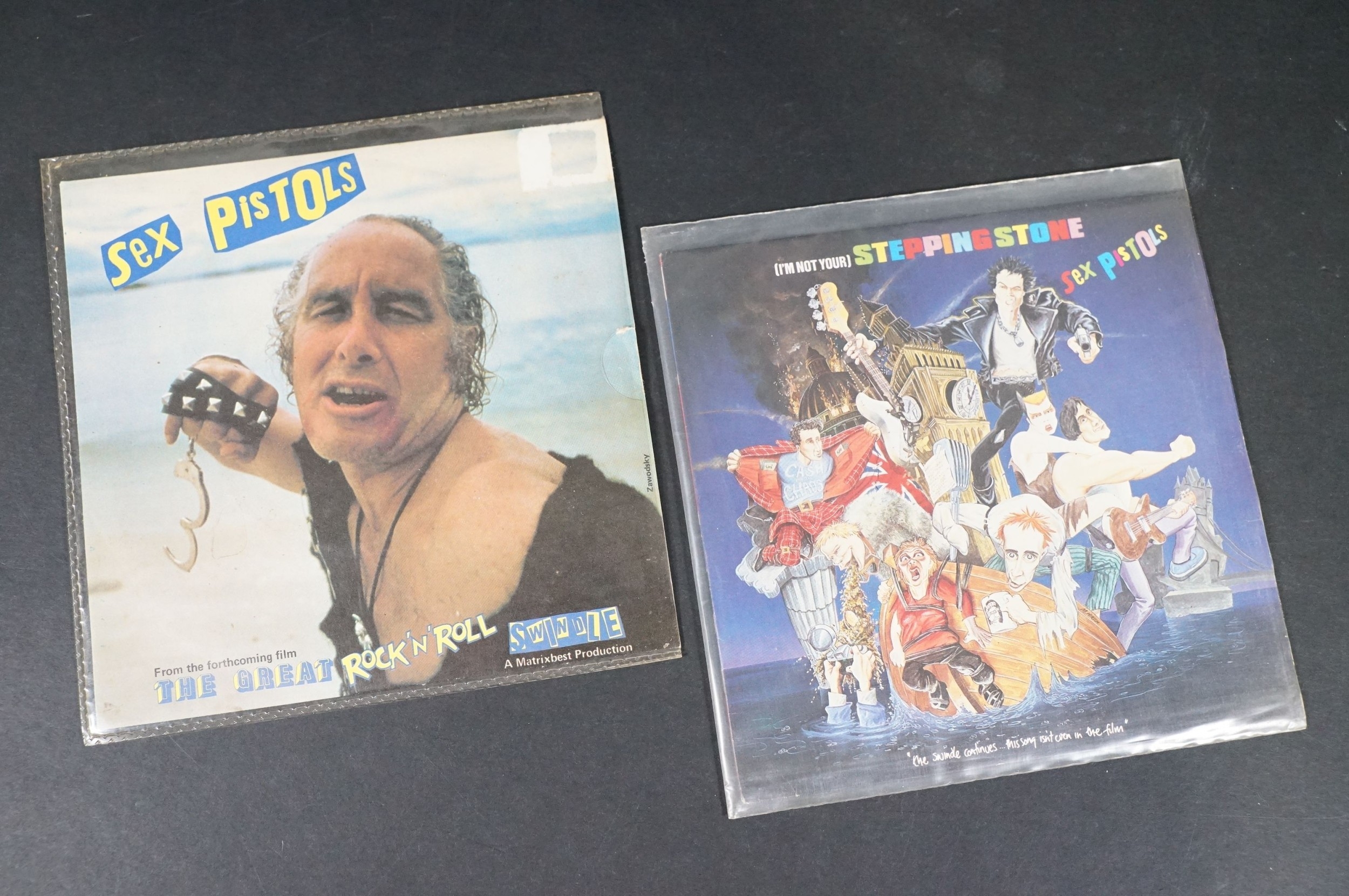 Vinyl - 8 Sex Pistols 7" singles and 1 DVD to include Submission (single sided VDJ24), Pretty Vacant, The Great Rock N Roll Swindle, Stepping Stone, Holidays In The Sun (French) and others. Vg+ overall
