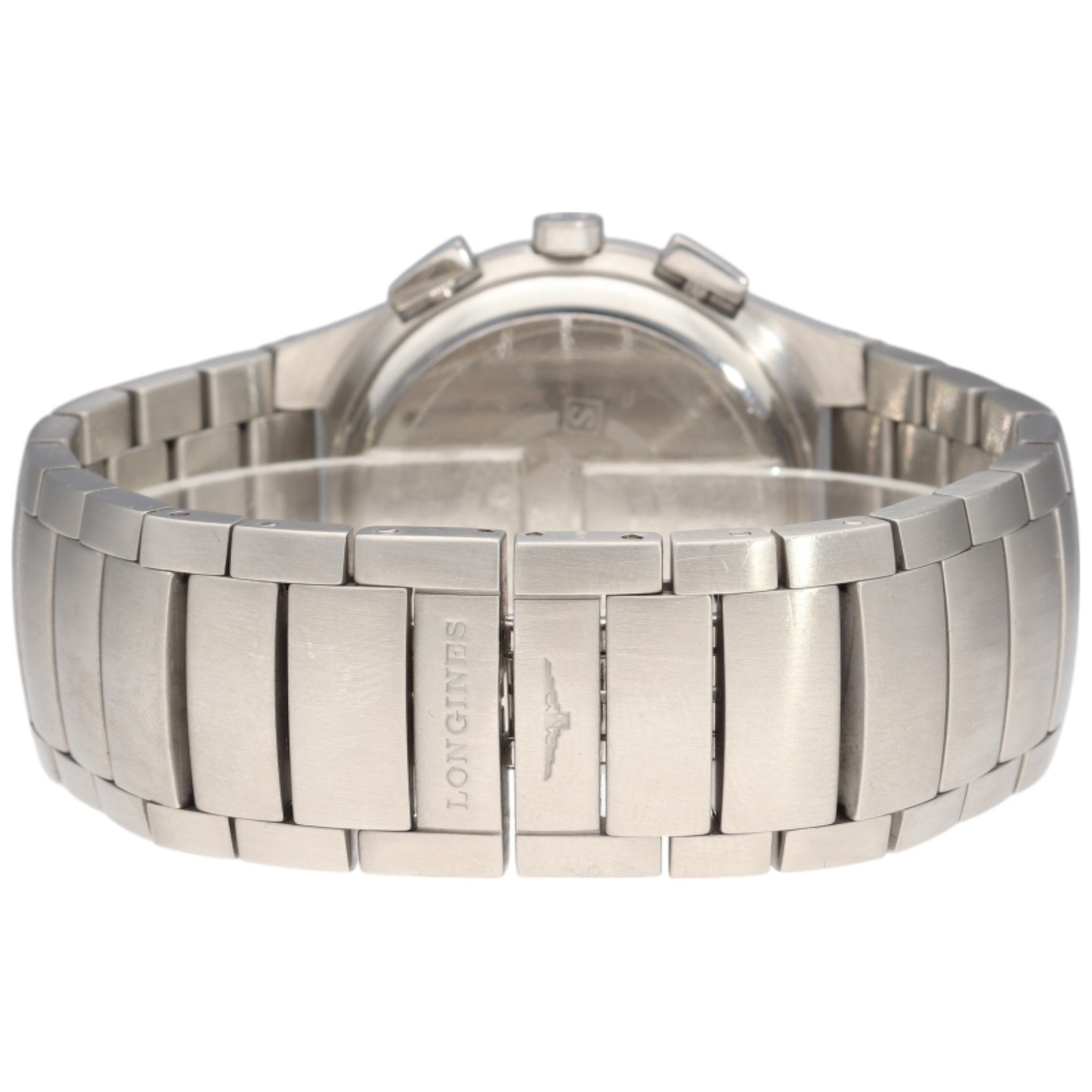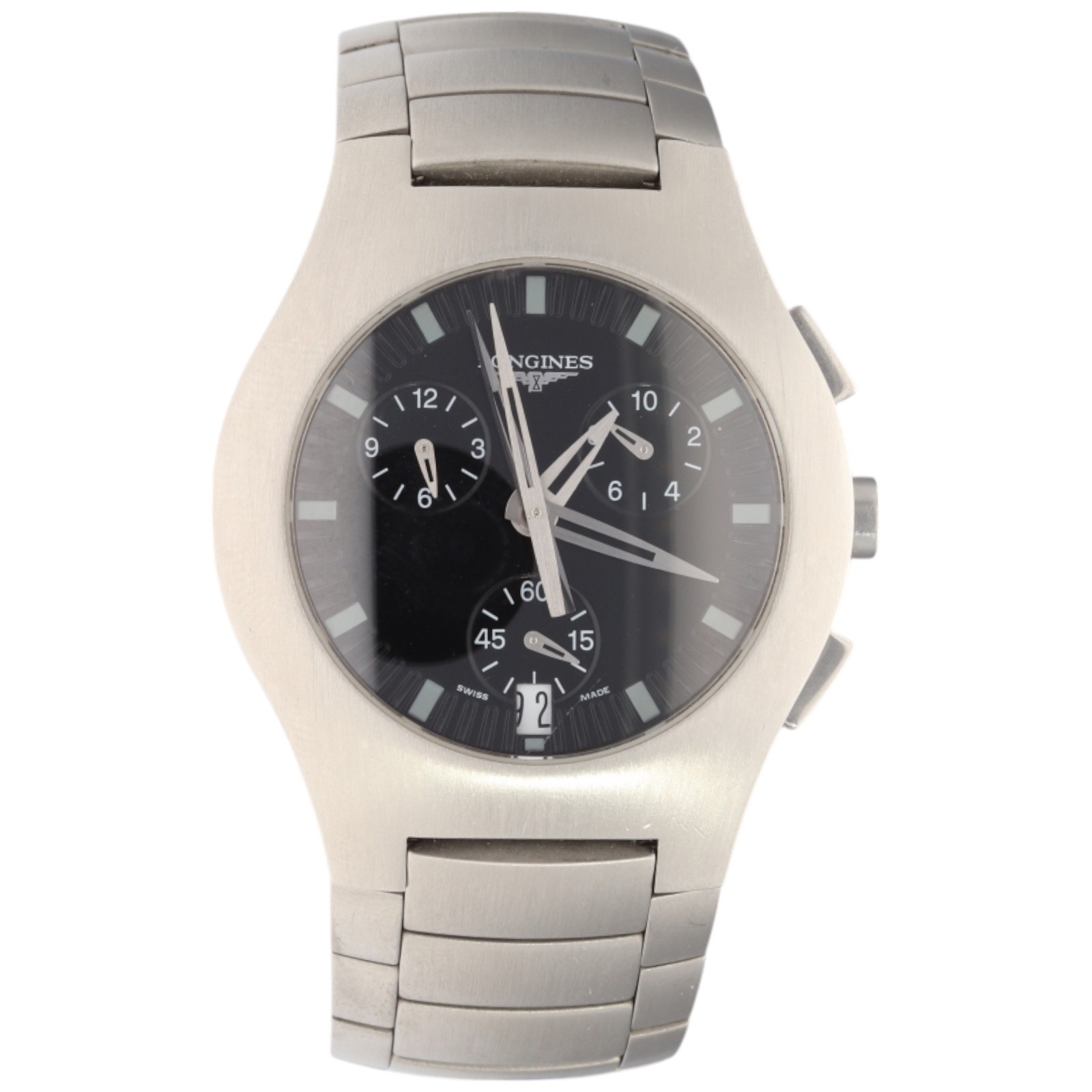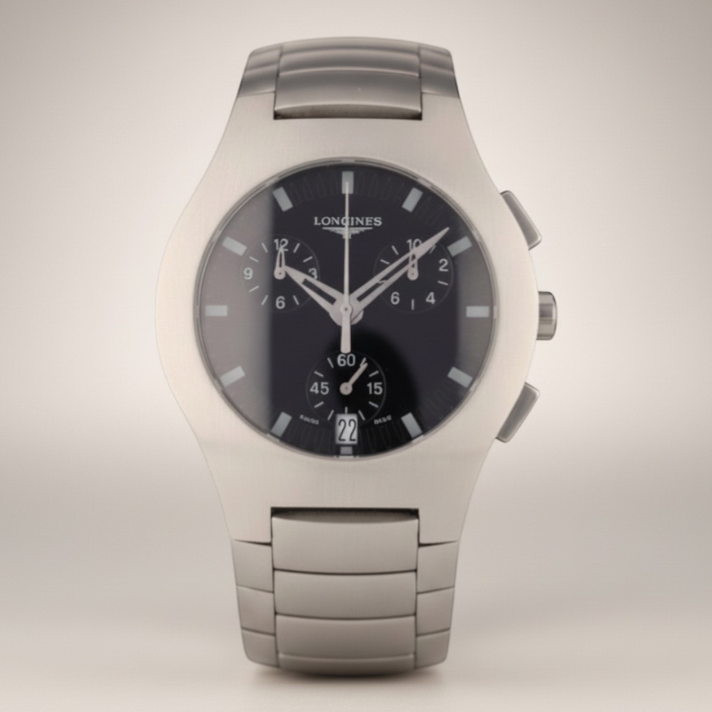A gentleman's Longines Oposition chronograph, reference L3.618.4. Featuring a 38mm stainless steel case with a sapphire crystal and a black dial with three sub-dials. The watch is presented on its original integrated stainless steel link bracelet with a double-folding deployment clasp.