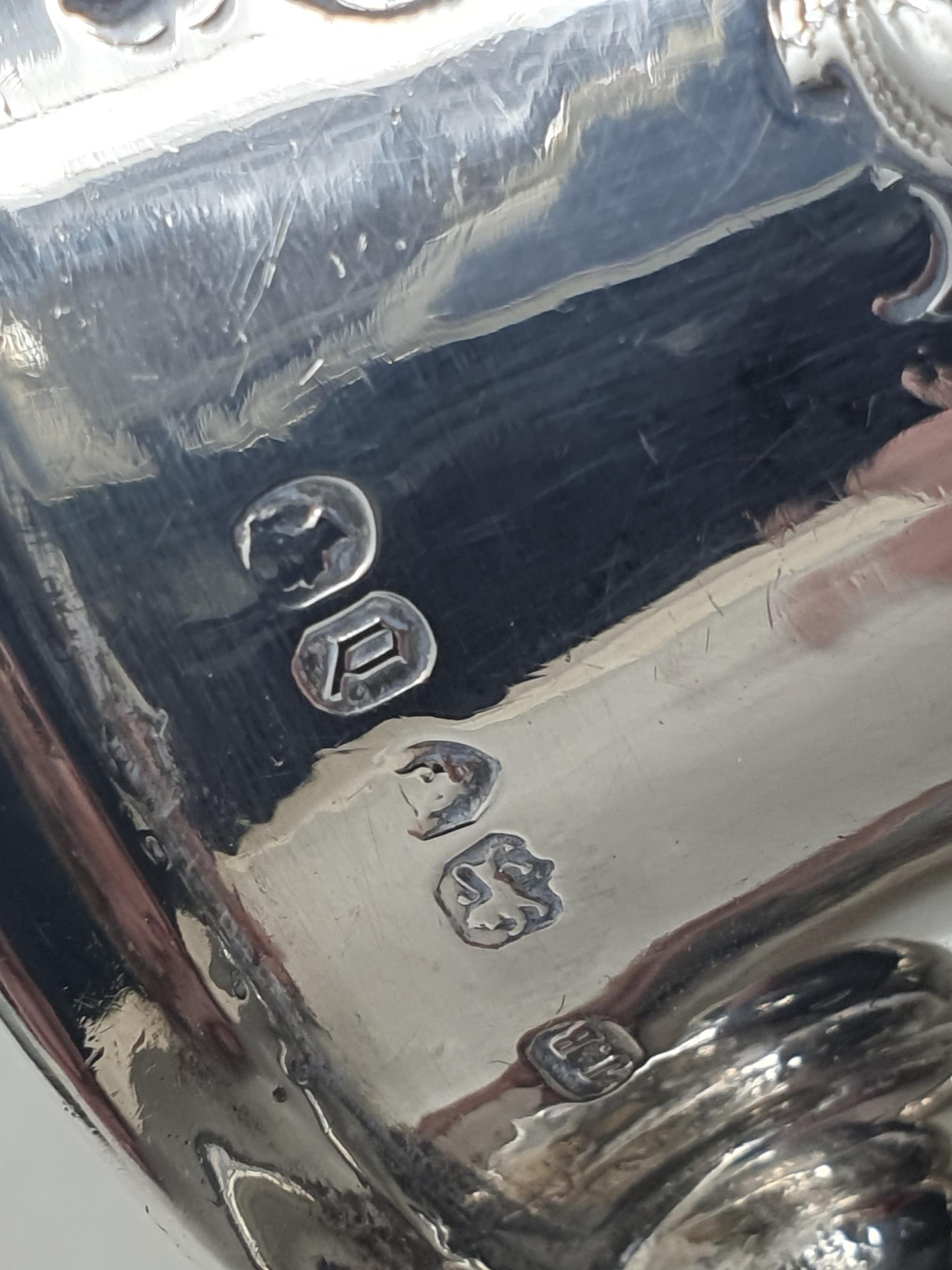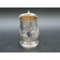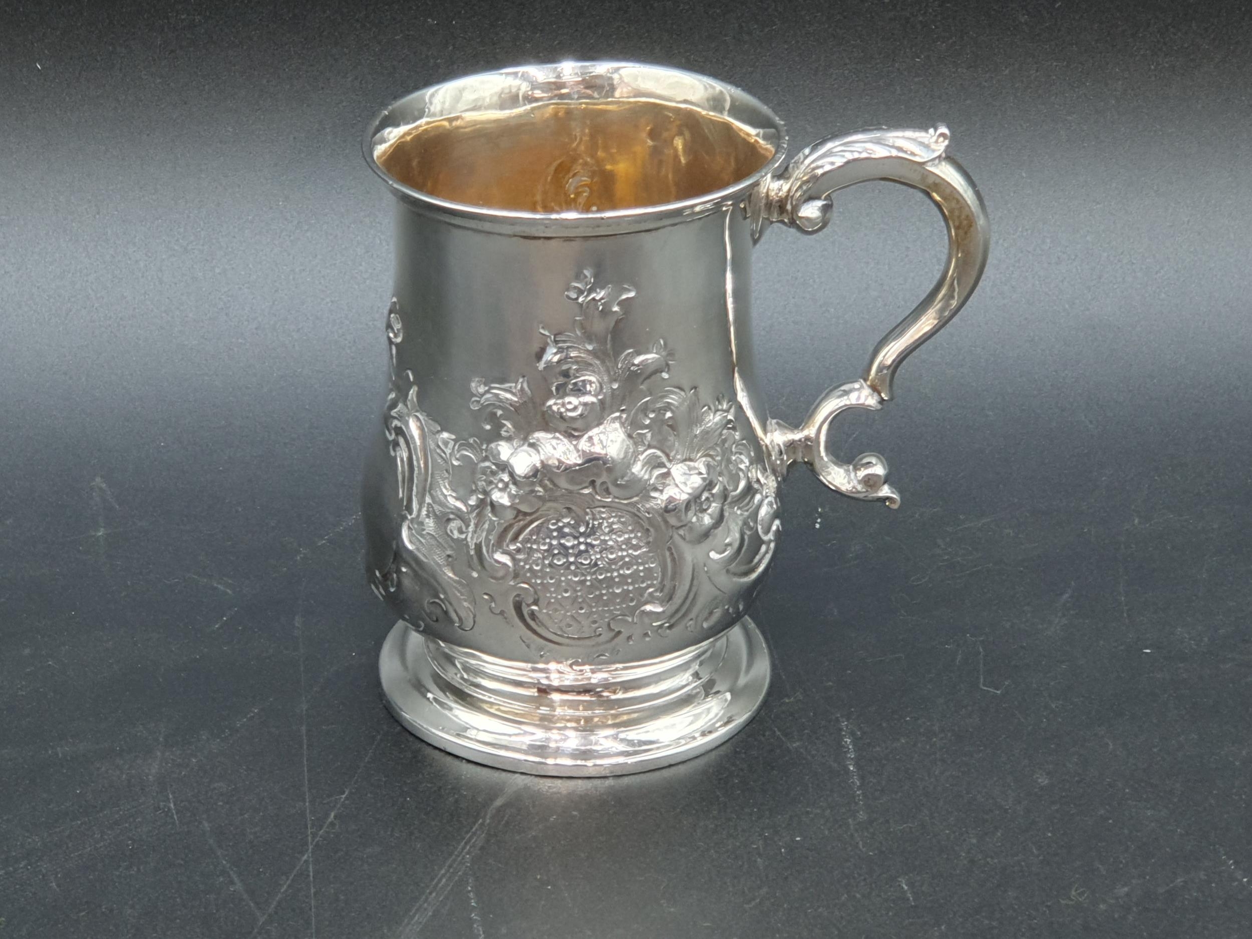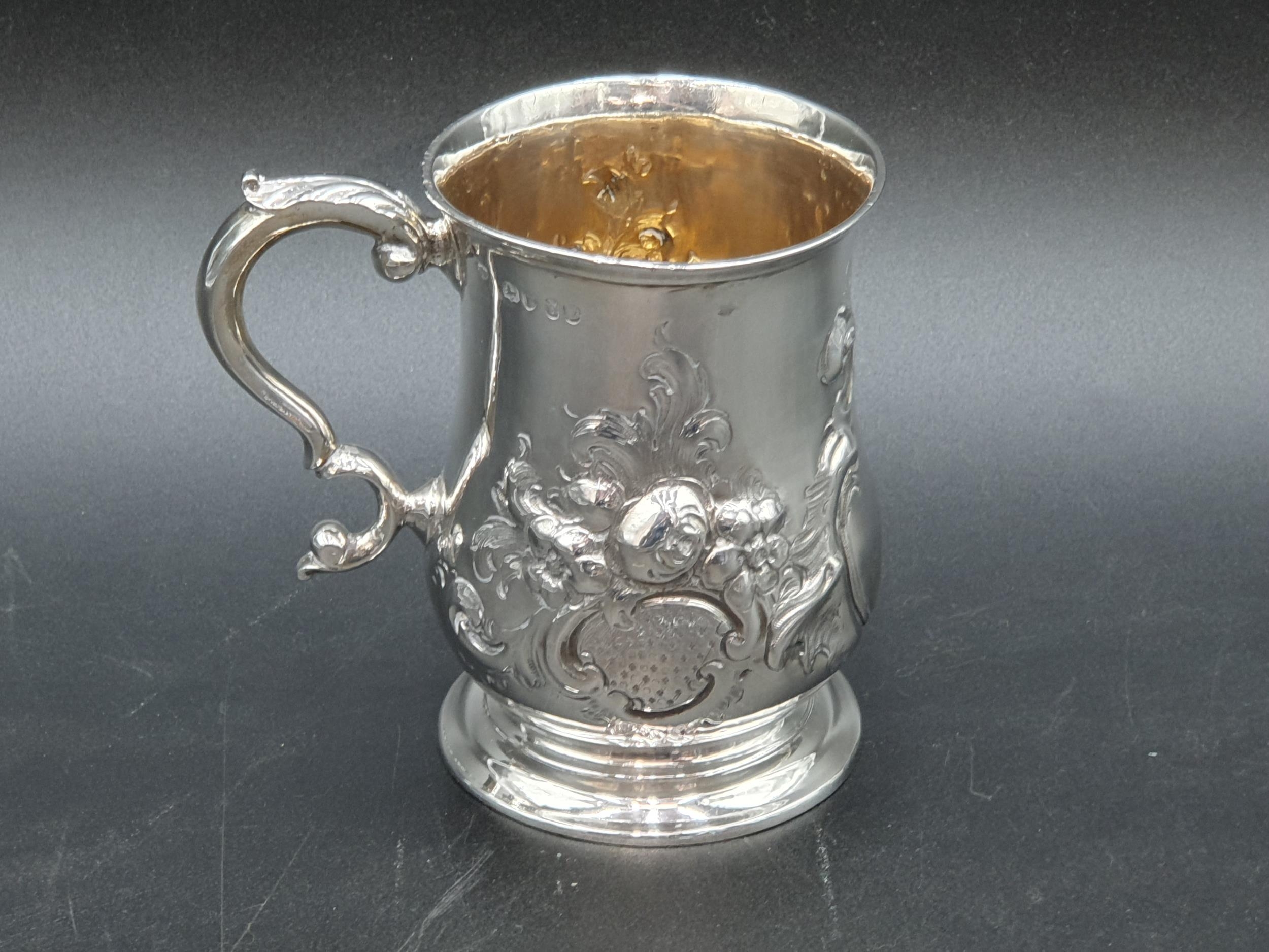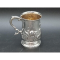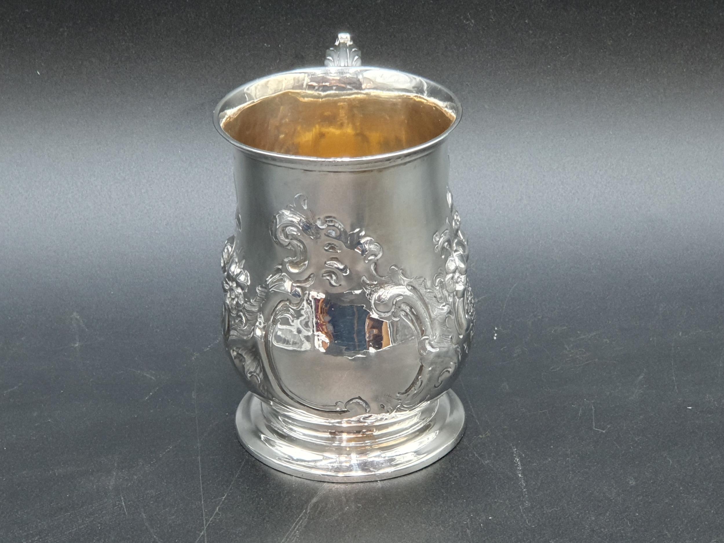 A Victorian silver baluster Mug with floral and scroll embossing, vacant cartouche, London 1859, maker: J.B, 170gms