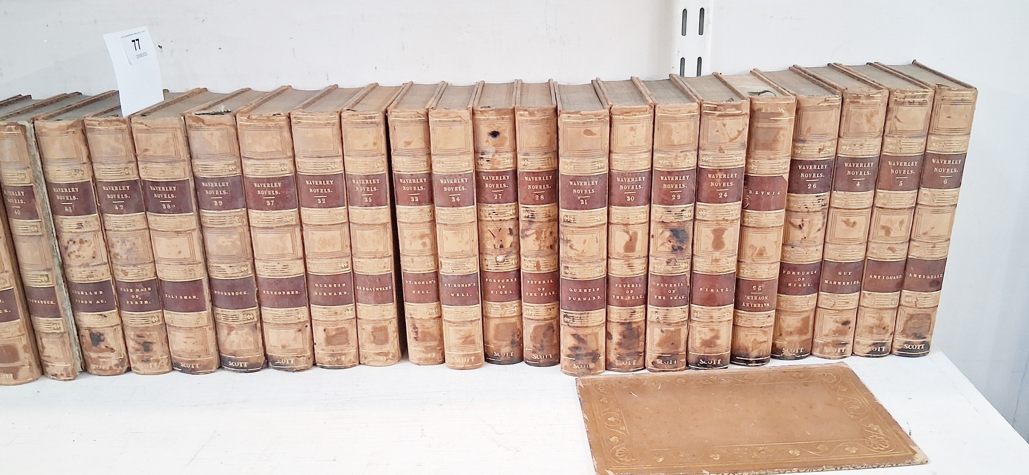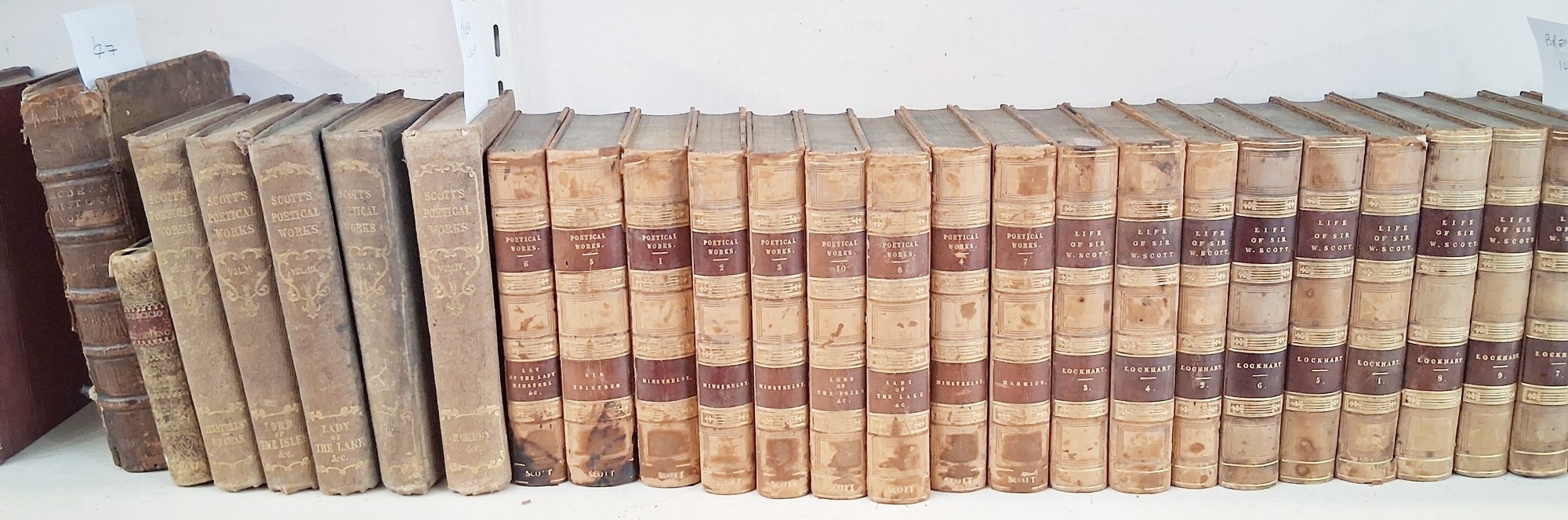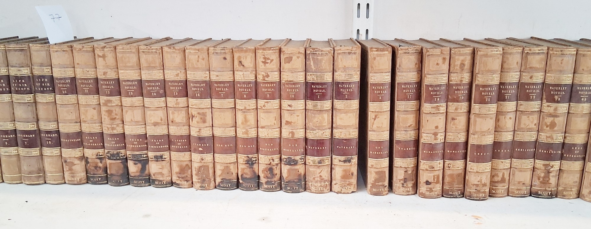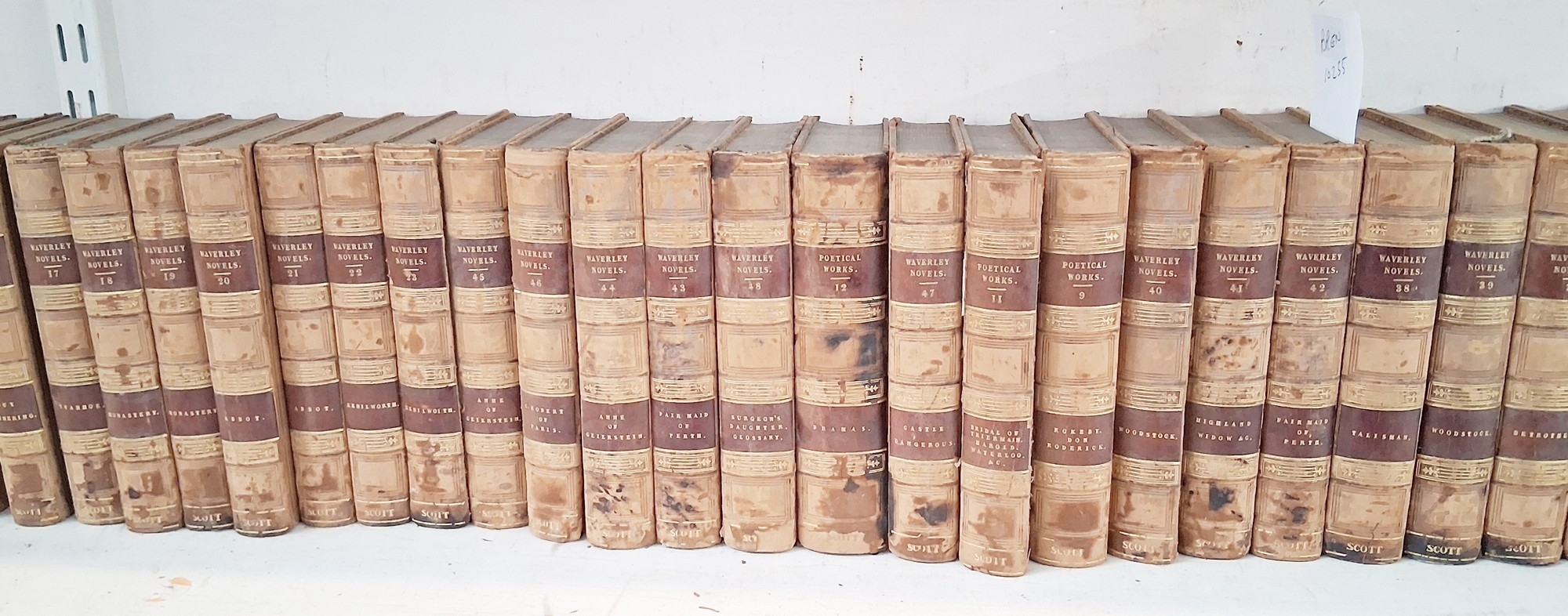 Scott, Sir Walter "The Waverley Novels", poetical works, The Life of W Scott, all bound full calf with floral gilt decorated boards, 8vo, marbled ep, marbled edges, some in varying condition, 70 vols in all and seven other volumes - some volumes poor condition and in need of repair