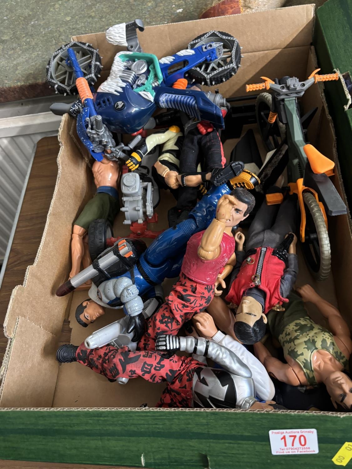 BOX OF ACTION MAN FIGURES INCLUDES MOTORBIKES & BICYCLE PLEASE SEE PICTURES FOR DETAILS