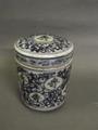 A Chinese blue and white pot and lid with painted character decoration to top and sides, 5' x 3¾'