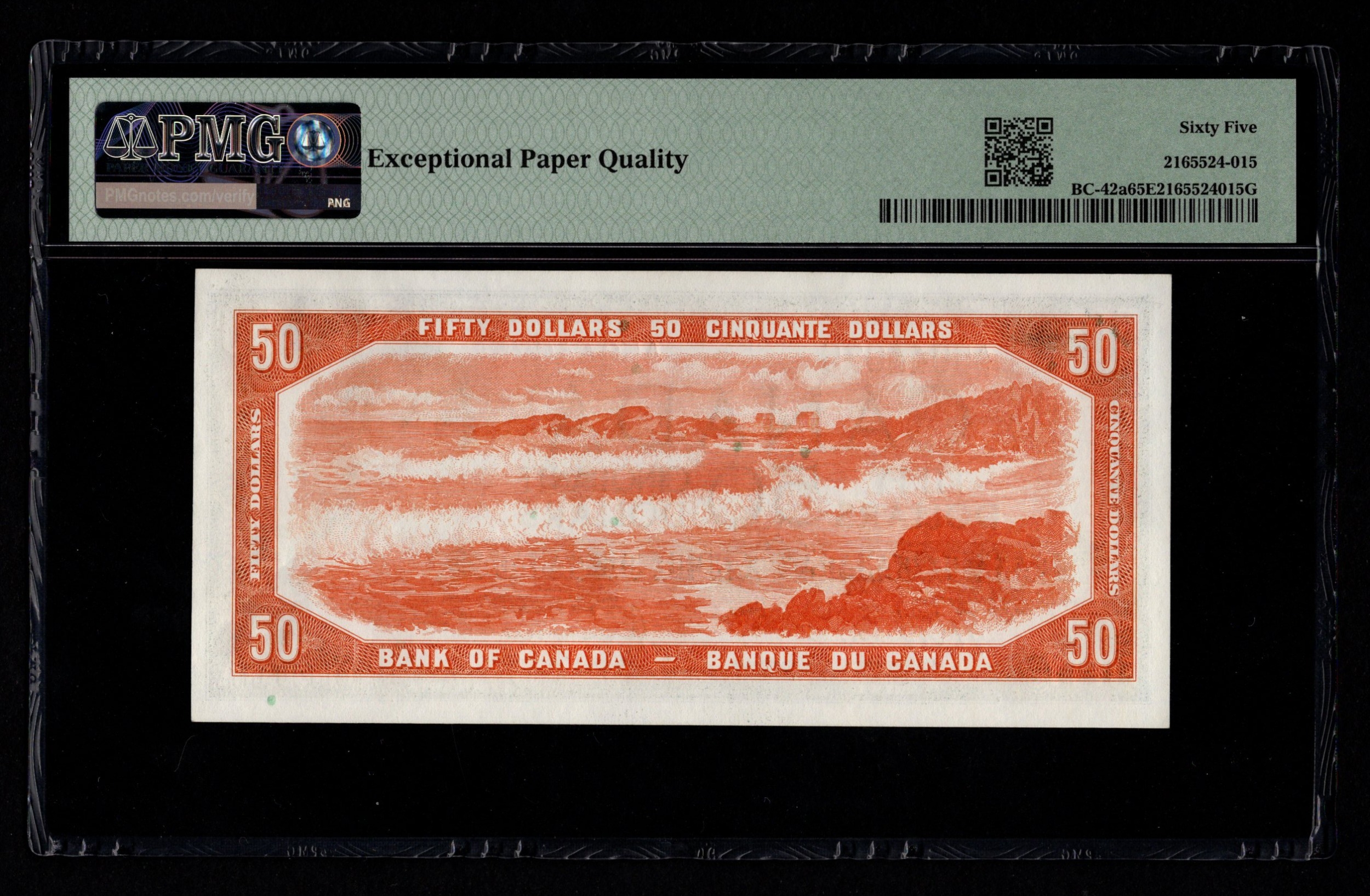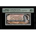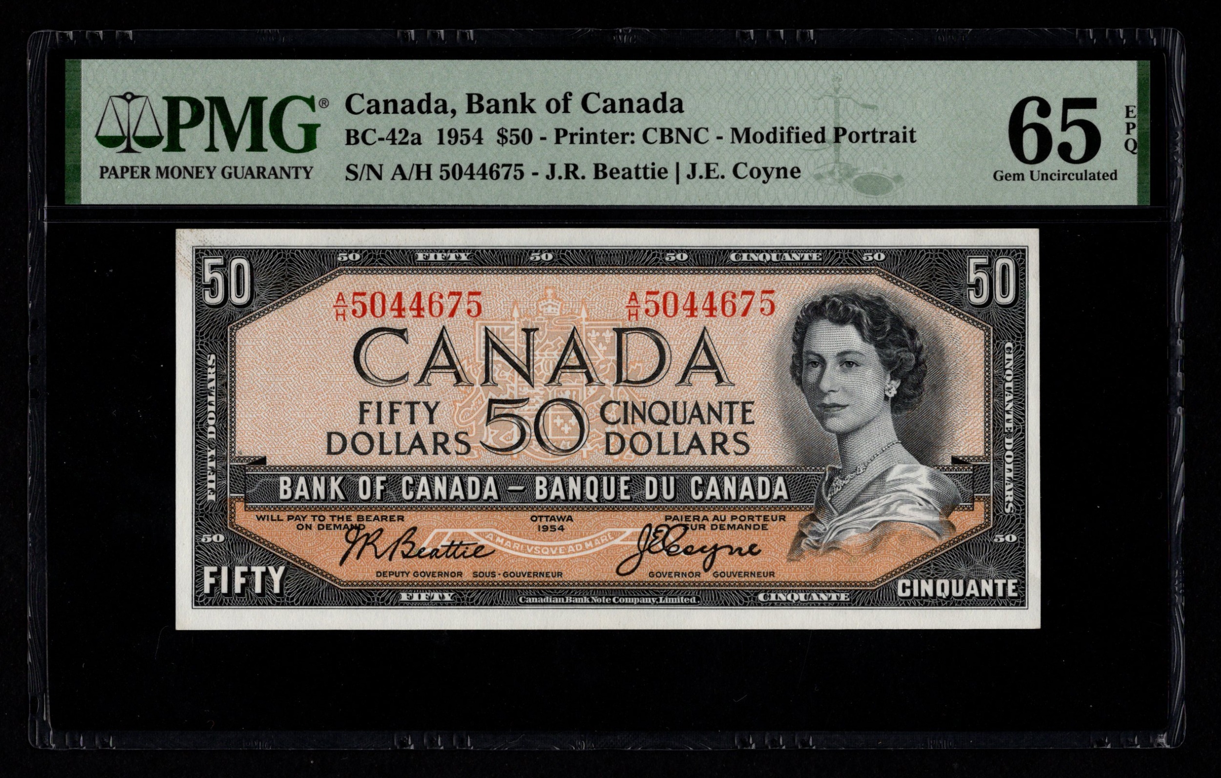 Canada 50 Dollars dated 1954, modified design, signed Beattie & Coyne, serial A/H 5044675 (BNB B344a, Pick81a) in PMG holder graded 65 EPQ Gem Uncirculated, exceptional paper quality