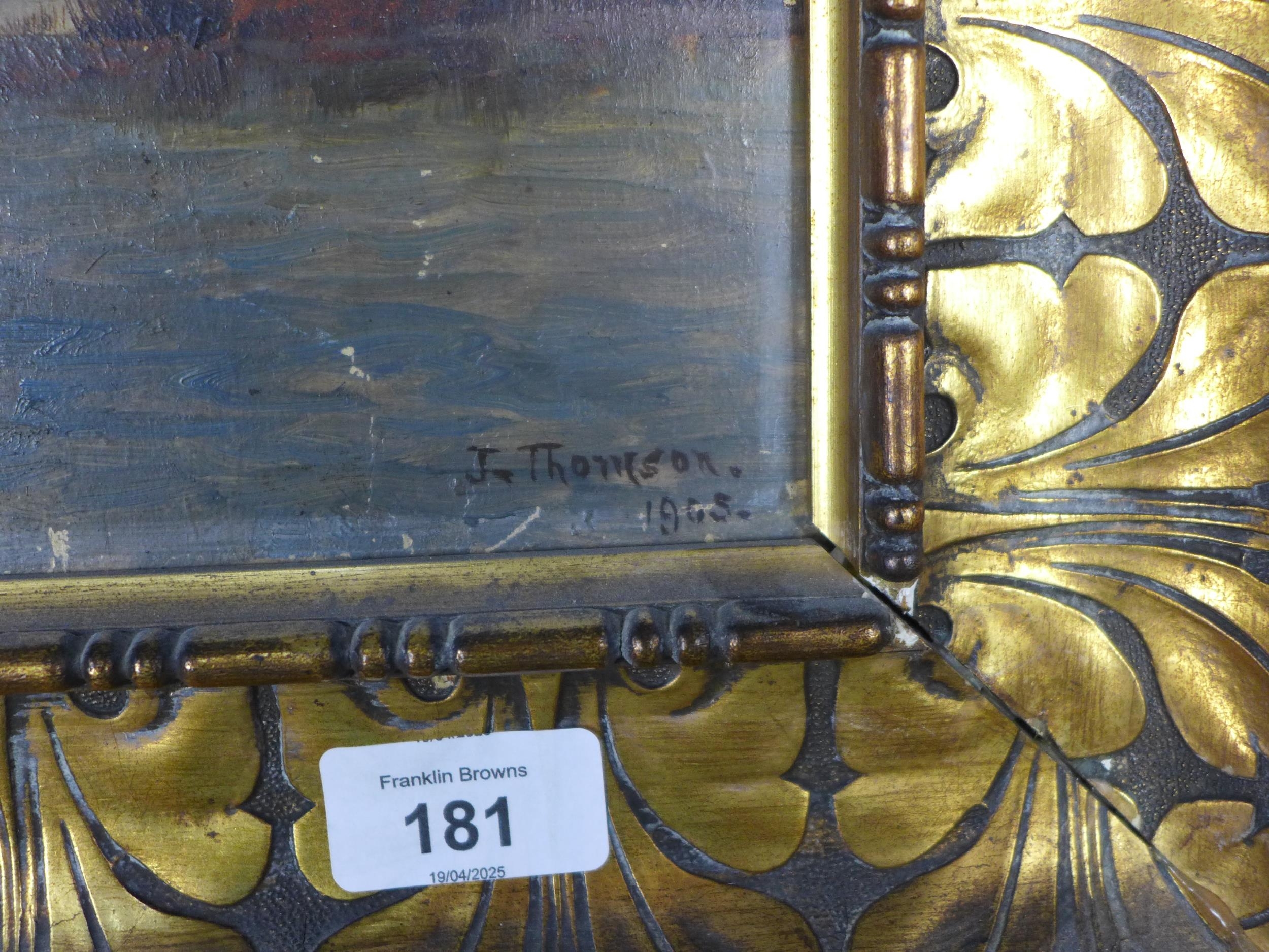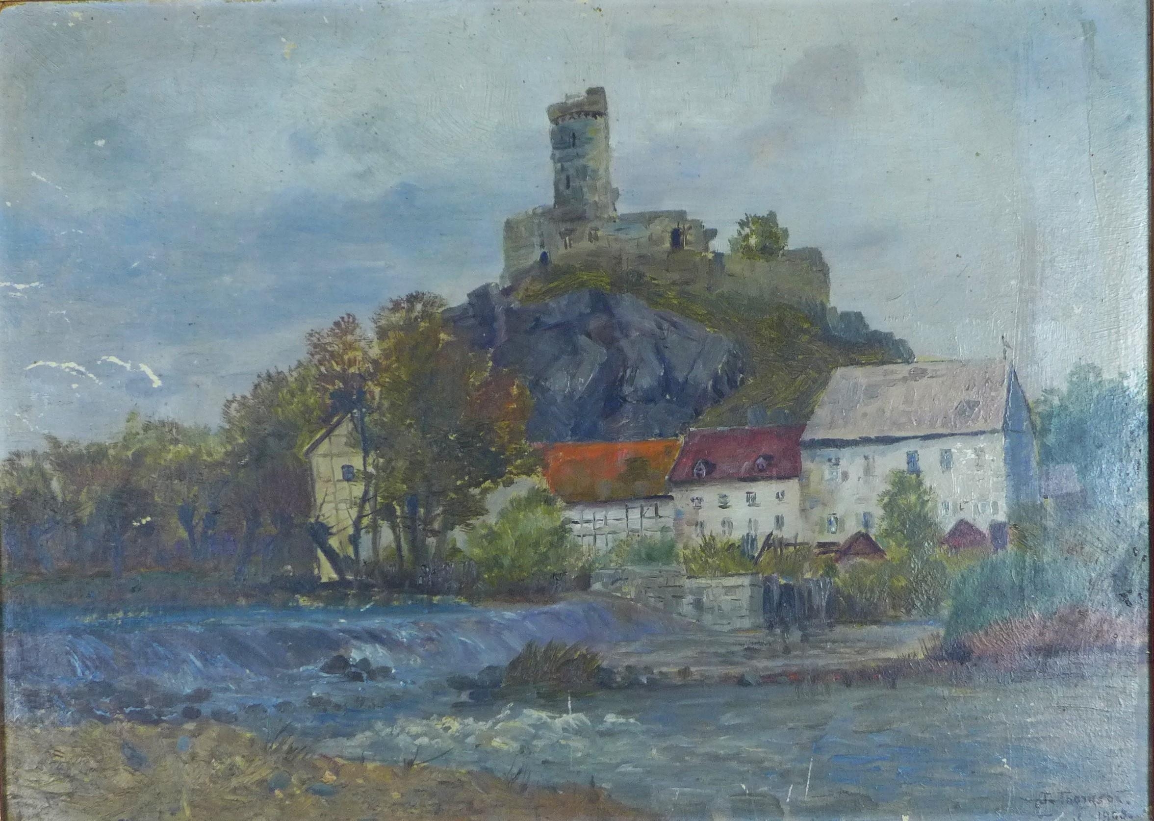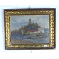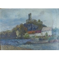 J. THOMPSON, oil on board of a caste ruin and village, signed and framed, 47 x 34cm