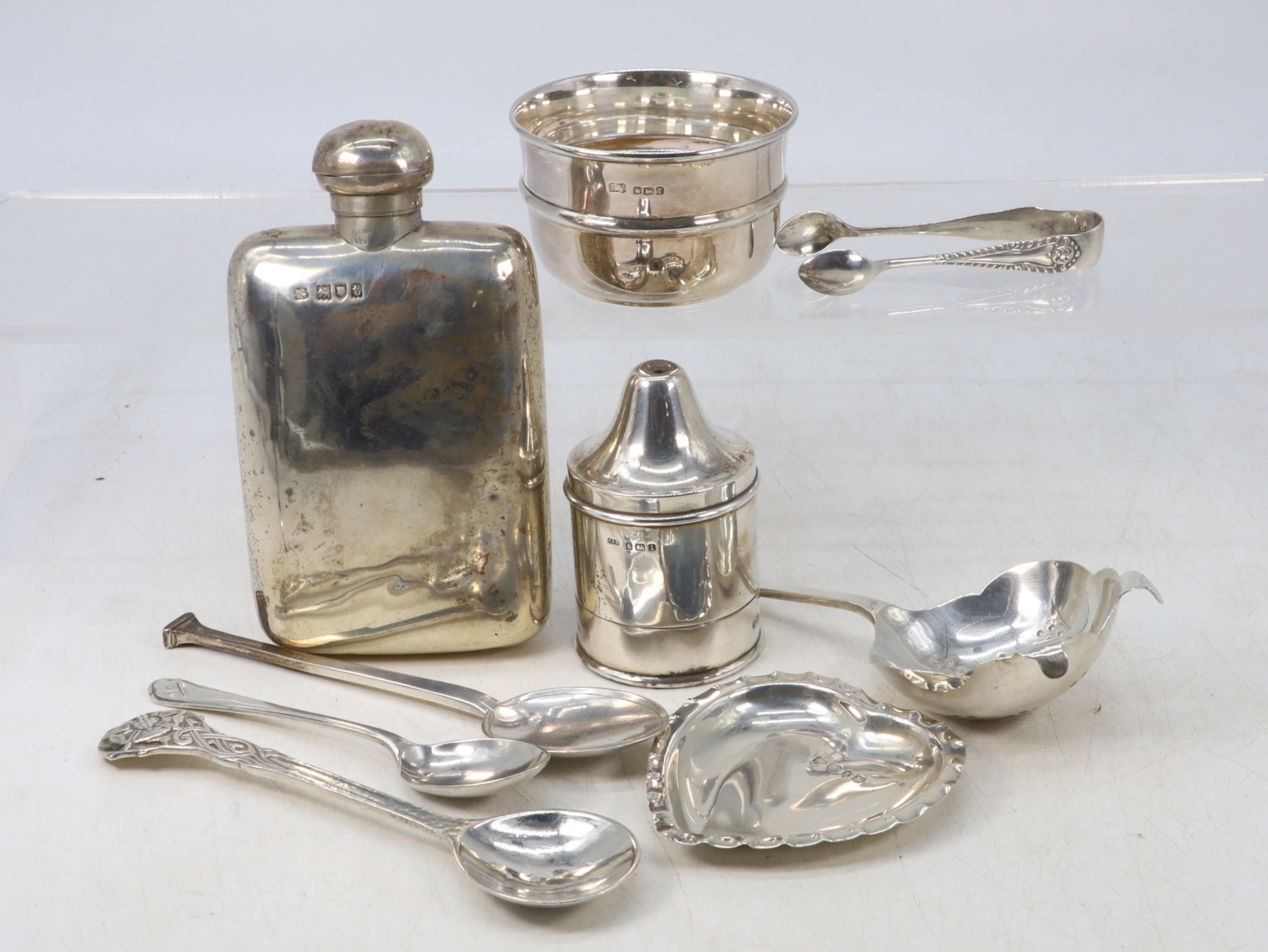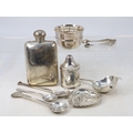 Silver hip flask, silver strainer, three spoons, sugar tongs, heart shaped dish, sherry label, small bowl, and a unknown object of silver