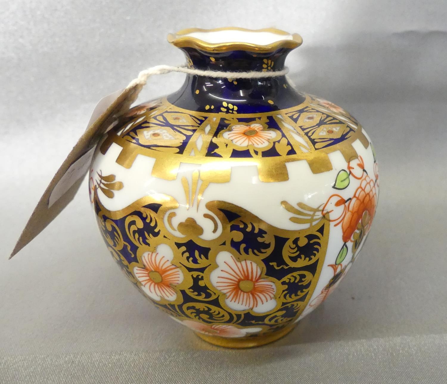 Miniature Royal Crown Derby Imari Porcelain Vase, pattern number 1450 C299, Stands approx 7.5cm tall.