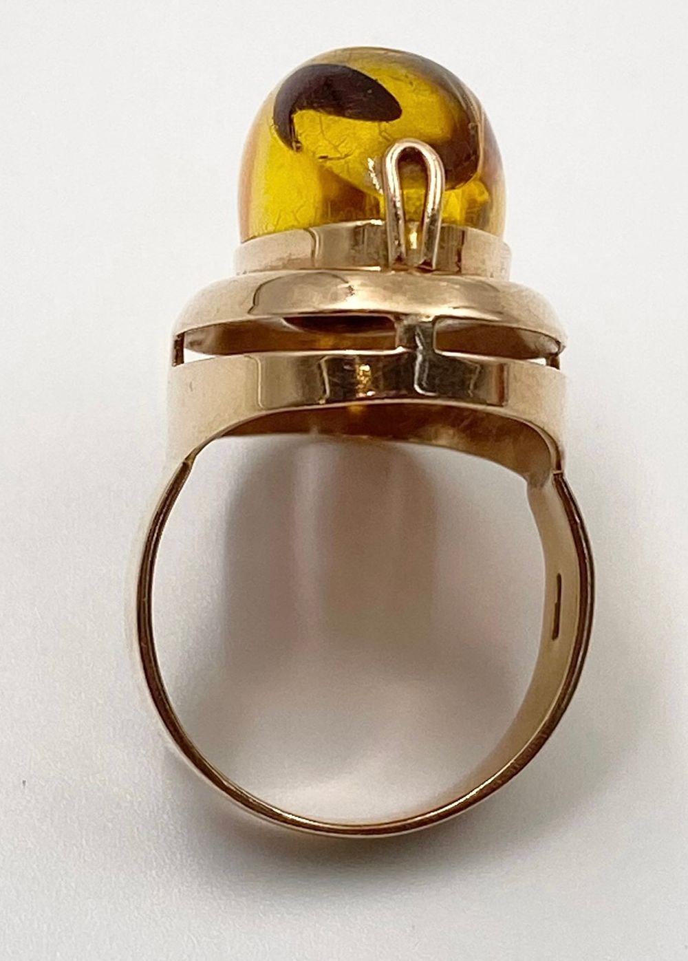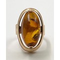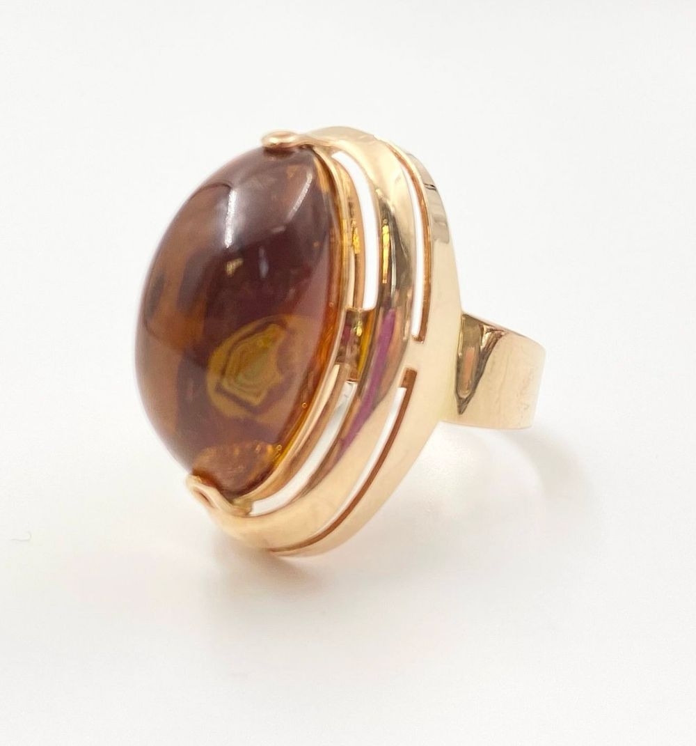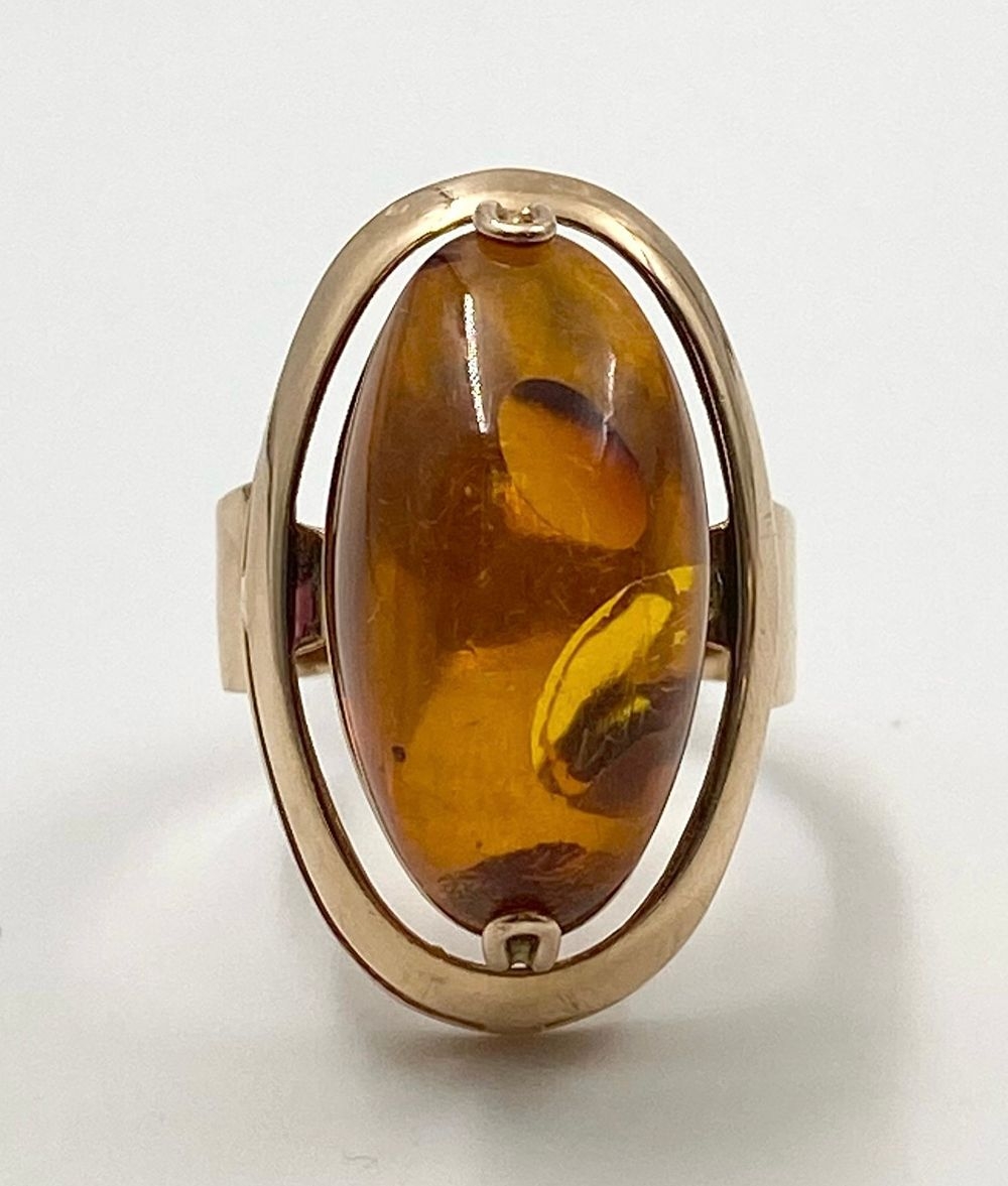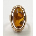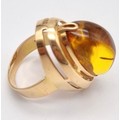 A LARGE AMBER STONE SET IN RING HAND CRAFTED IN 14K ROSE GOLD. 7.2gms size M
