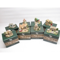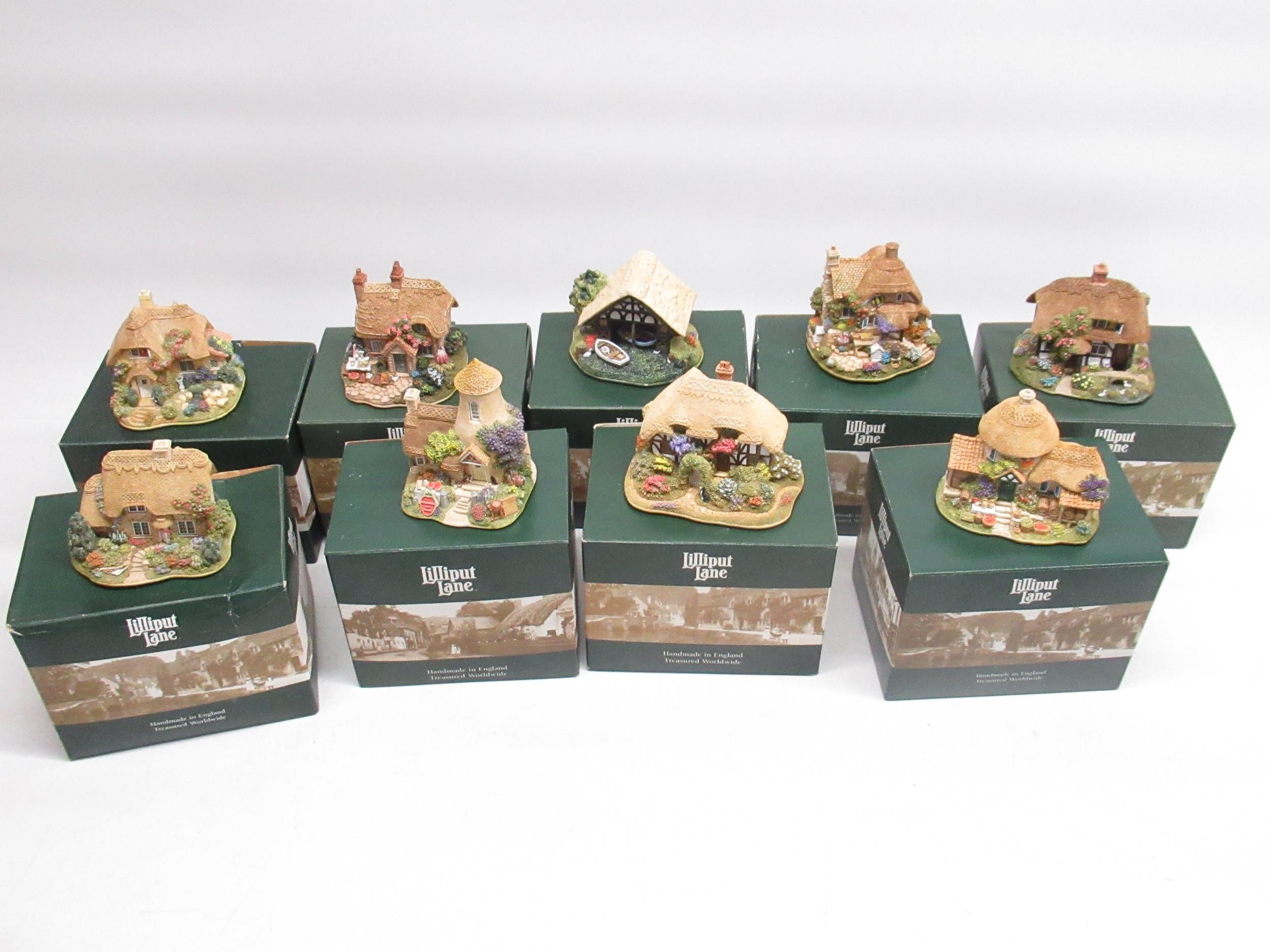Nine Lilliput lane, Little Dog Lost No L2551, Fresh today Nol2256, Warwick Castle Boathouse No L2901, Goosey Goosey Gander No25257, Gold Top No 2495, Little Scrumpy No L2395, April Cottage No L3020, Little Bee No L2317 and Little Watermill No L2227, All boxed