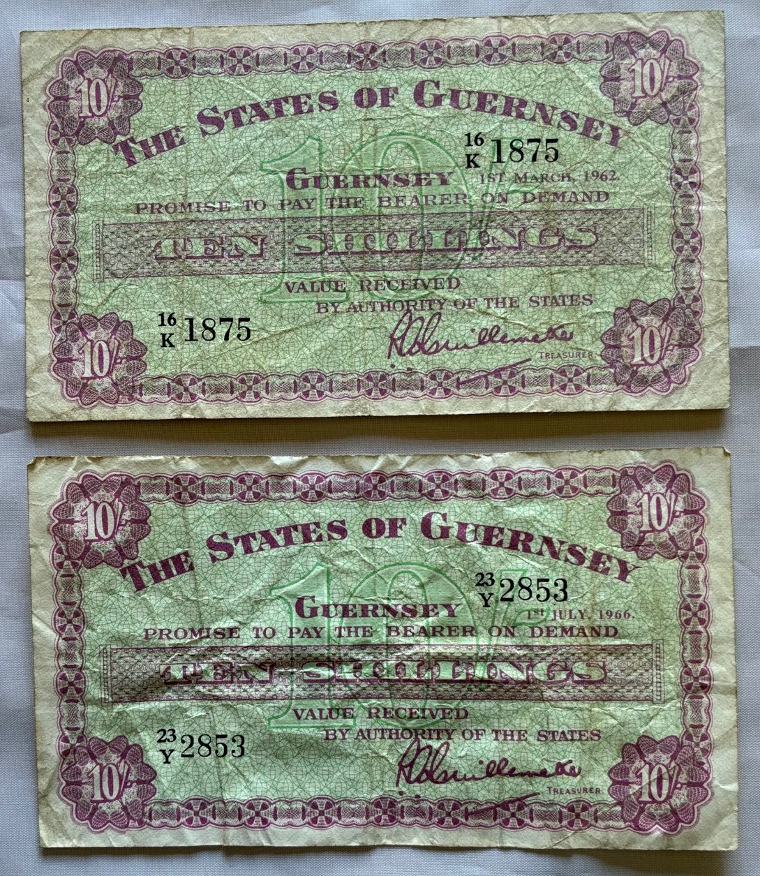 British Banknotes, The States of Guernsey, Ten Shillings, 16K 1875 1st March 1962, together with 23Y 2853 1st July 1966, signatory L.Guillemette (2).