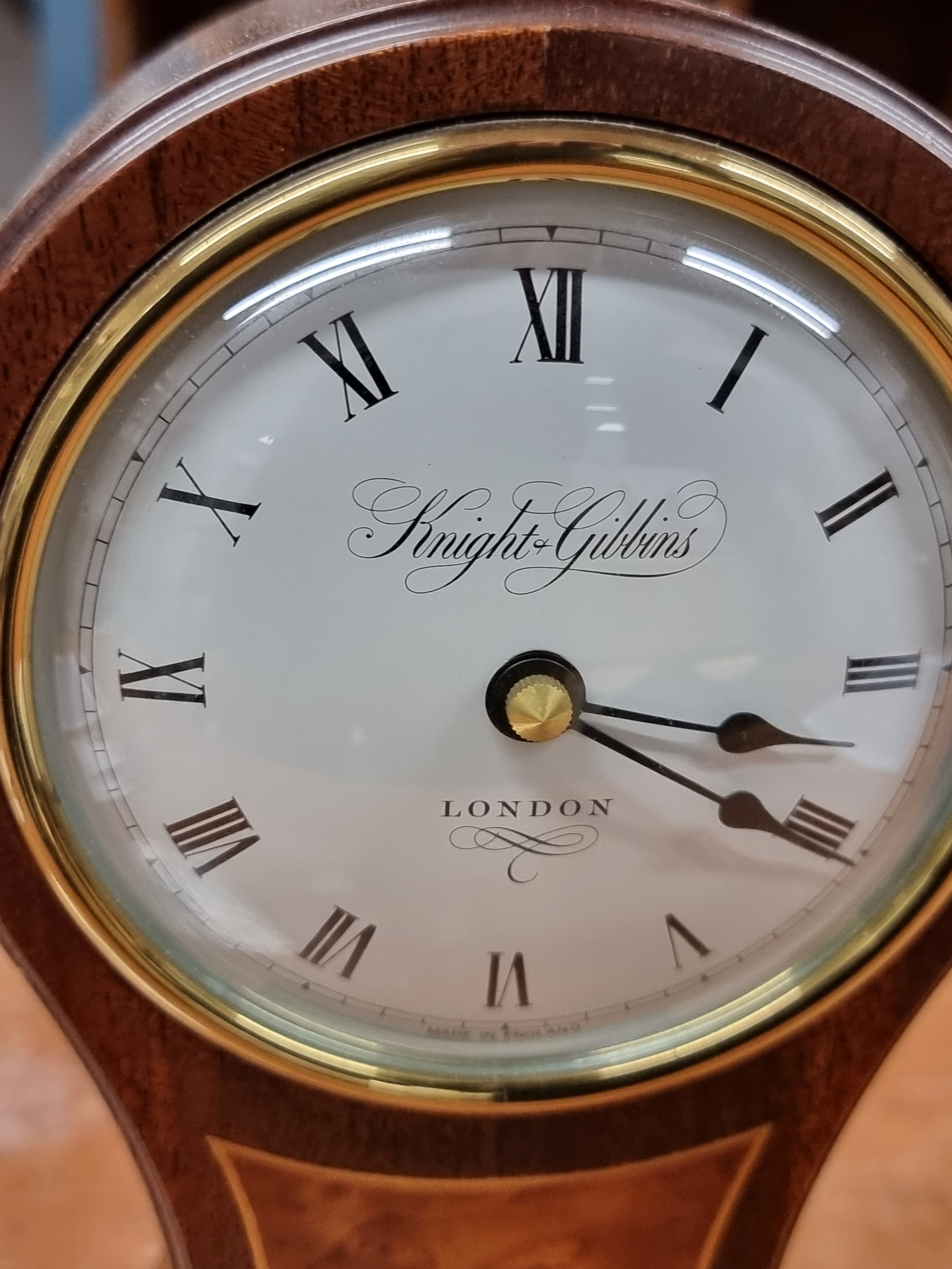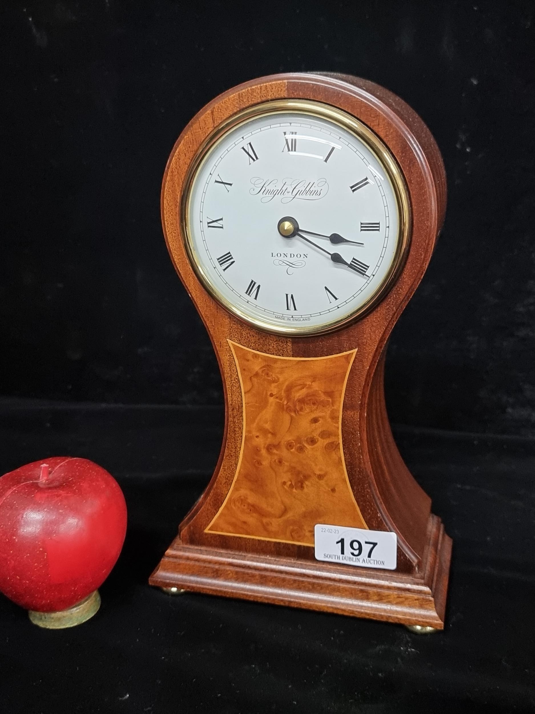 A lovely Knight & Gibbins mantel clock. Of wonderful hourglass form with a solid wood case, convex glass and bun feet. Lovely looking clock.