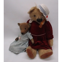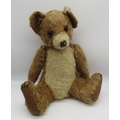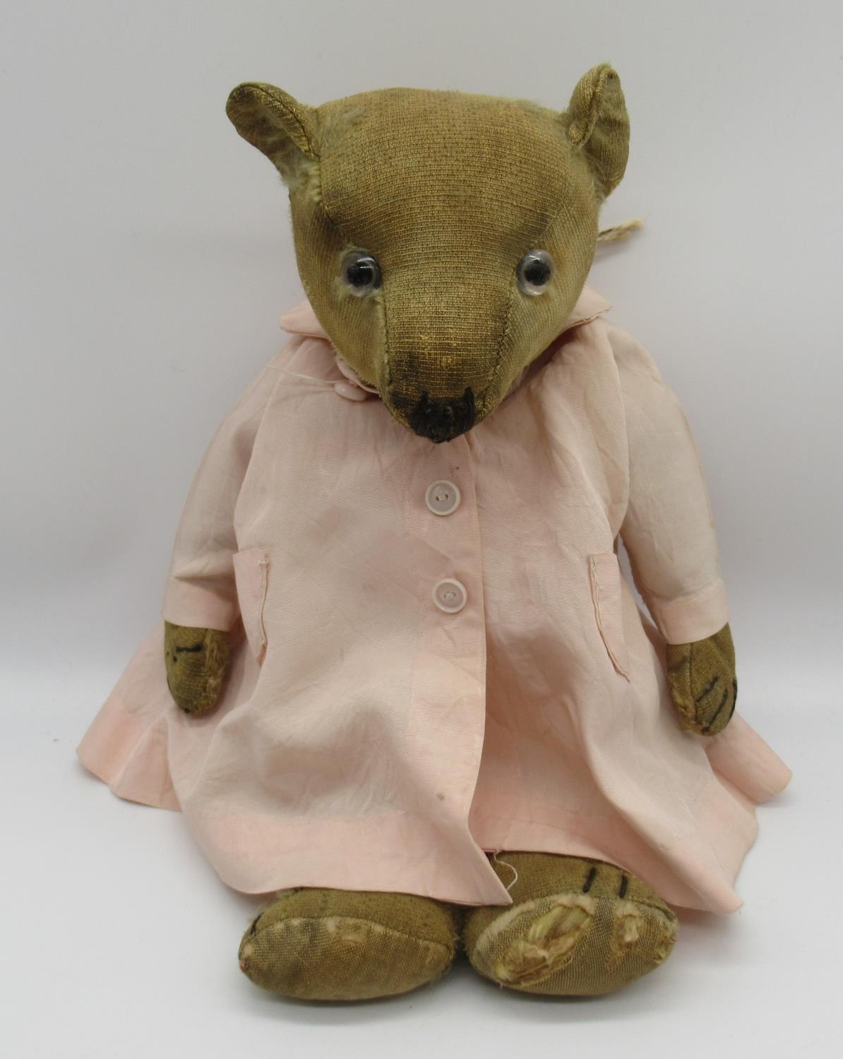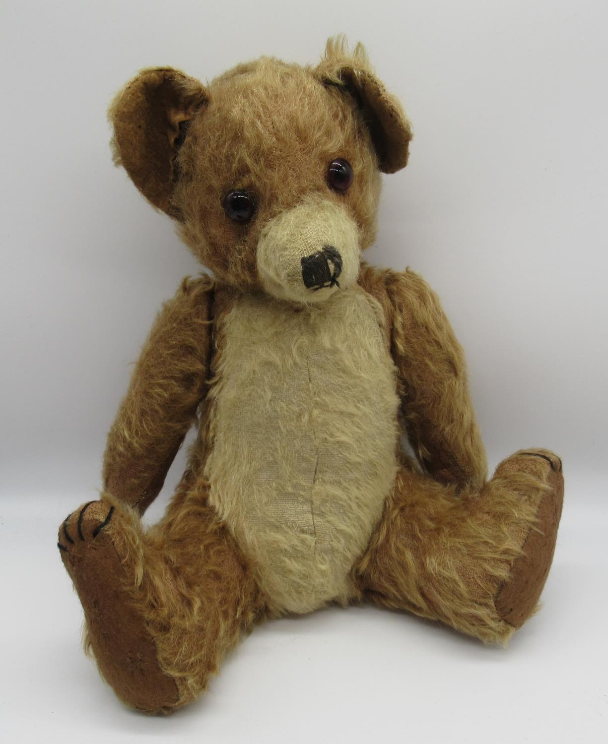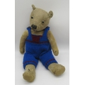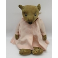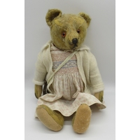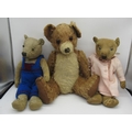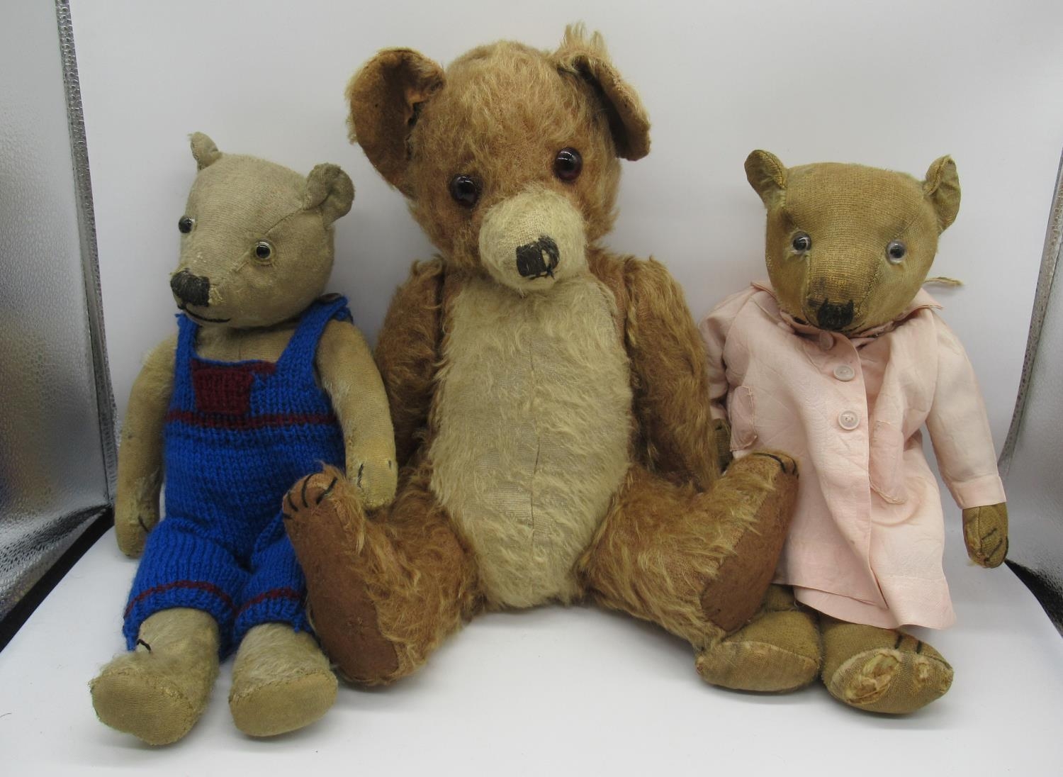 Collection of c. 1930's teddy bears: c. 1930's Bingy bear in cinnamon mohair, with original glass eyes, felt lined feet and stitched nose, H33cm, c. 1930's teddy bear with clear glass eyes, wearing pink coat, H38cm, and a c. 1930's straw filled teddy bear with glass eyes, wearing knitted blue dungarees, H42cm (3)