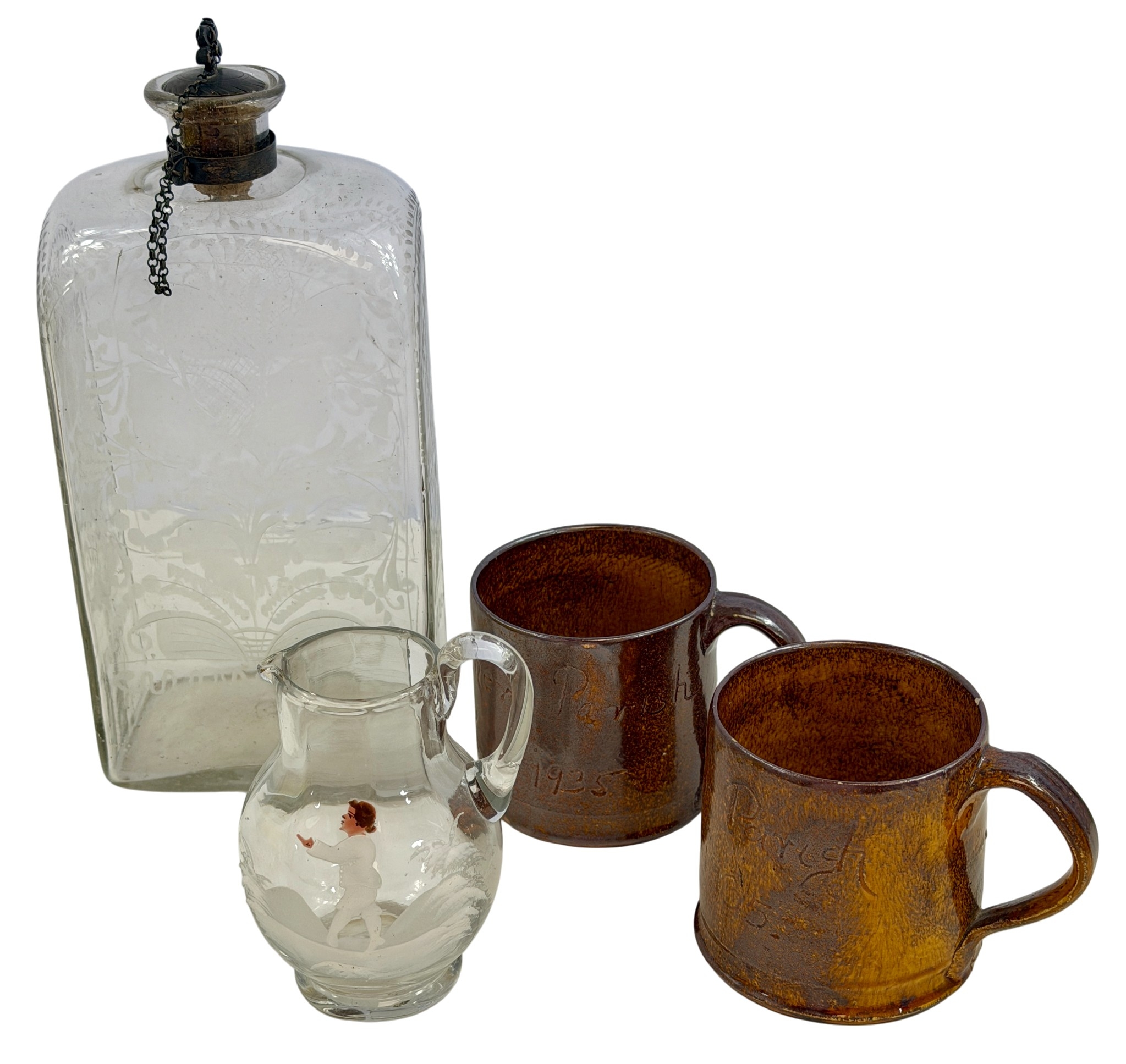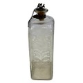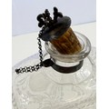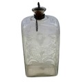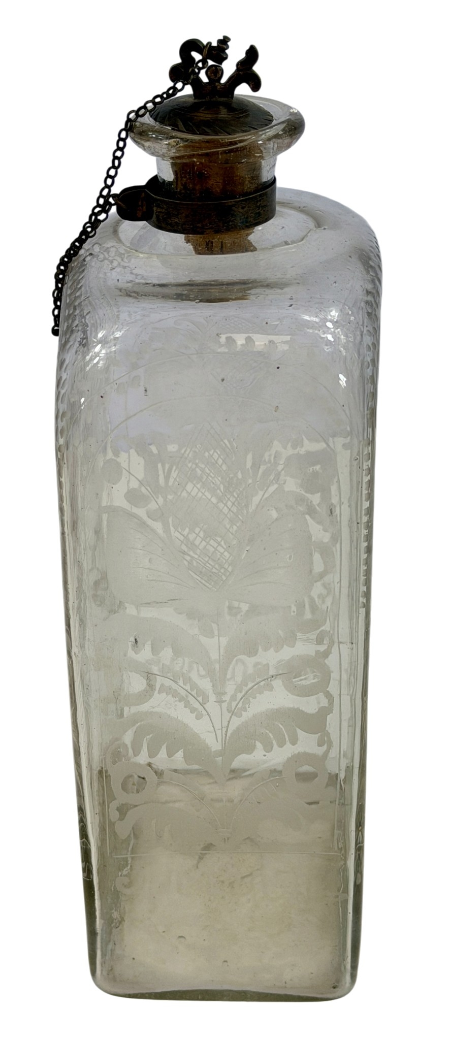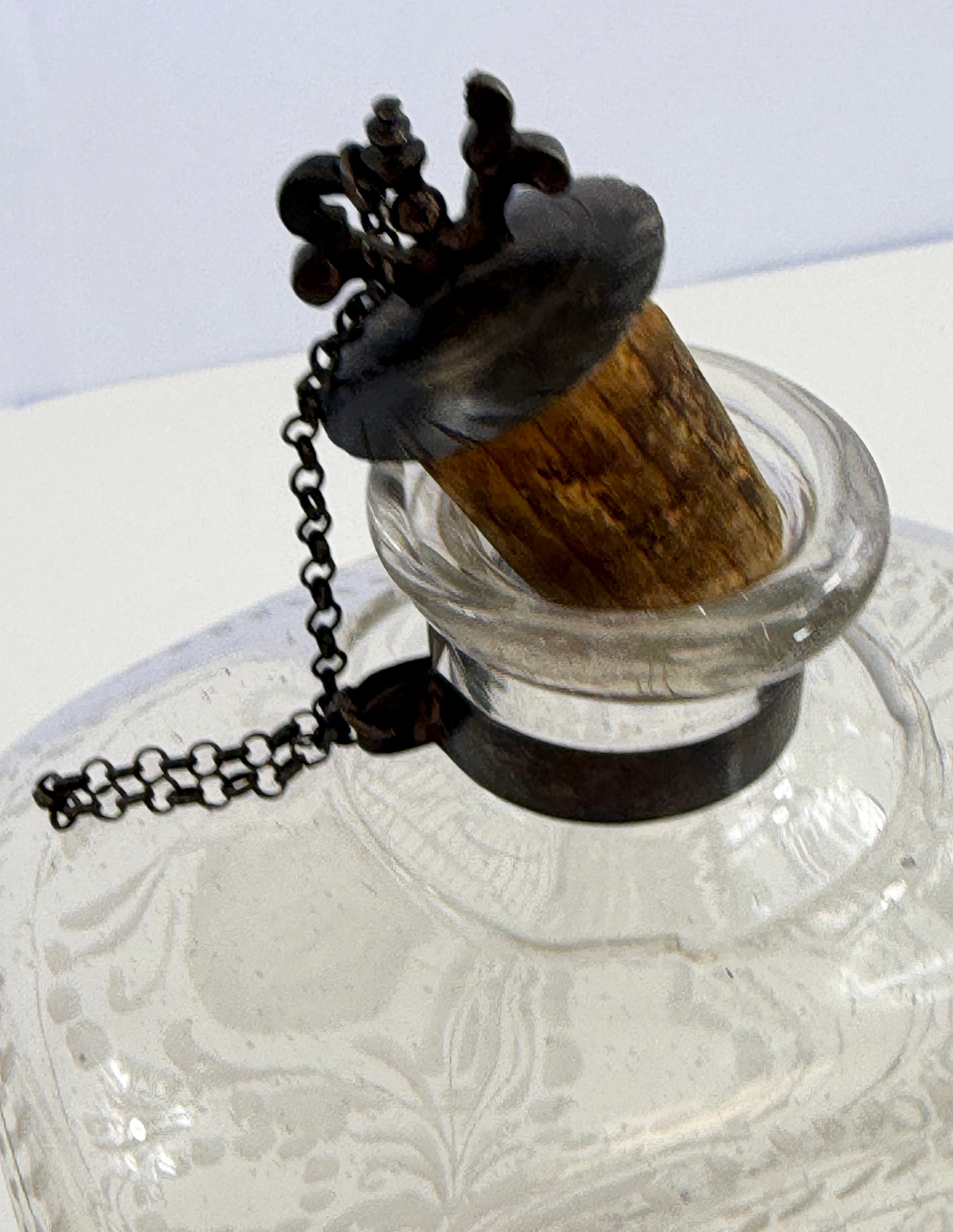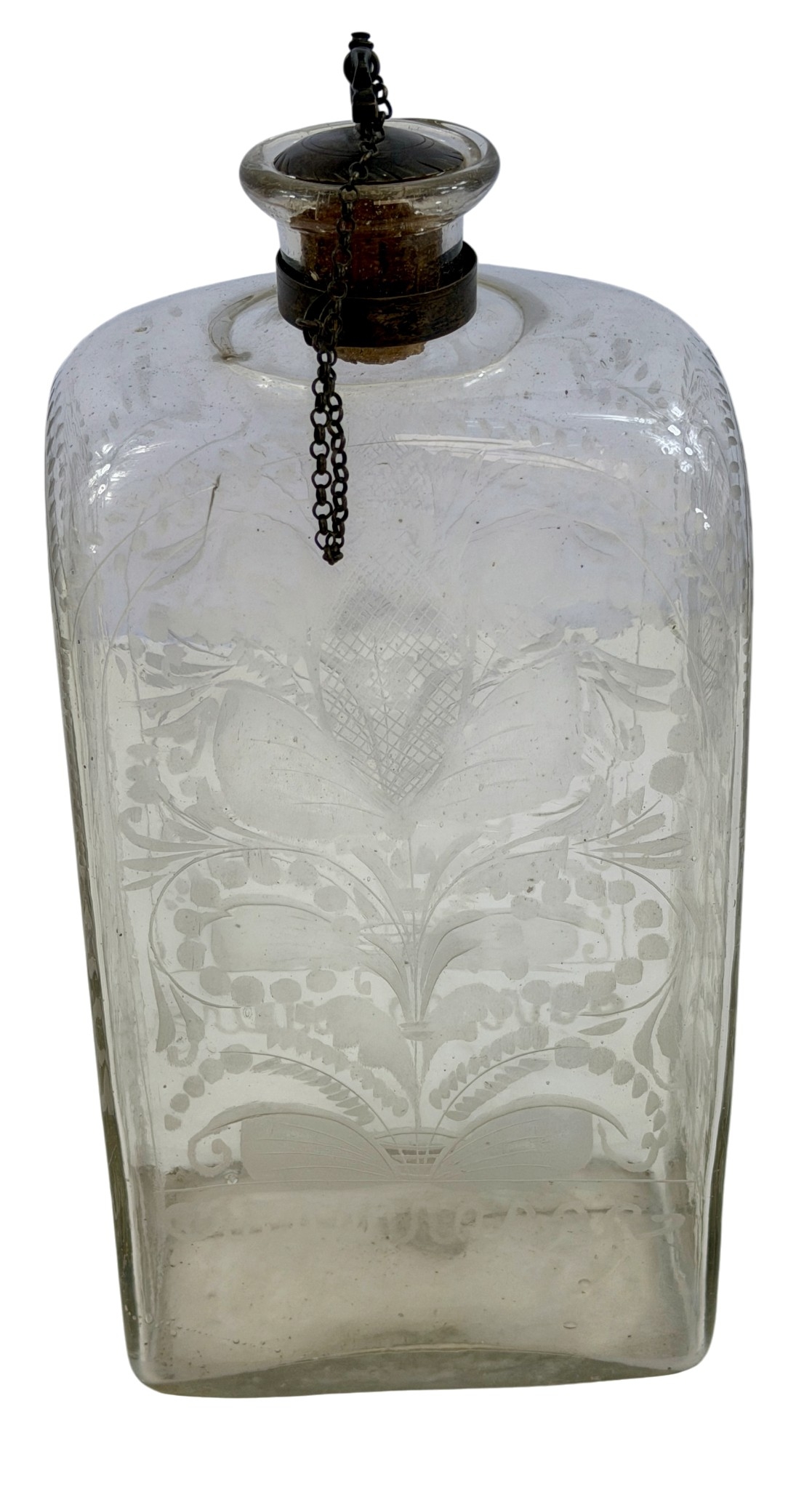 An antique spirit decanter with engraved glass detail. Likely from the 18th or 19th century Netherlands. Features a cork stopper with chain.