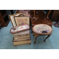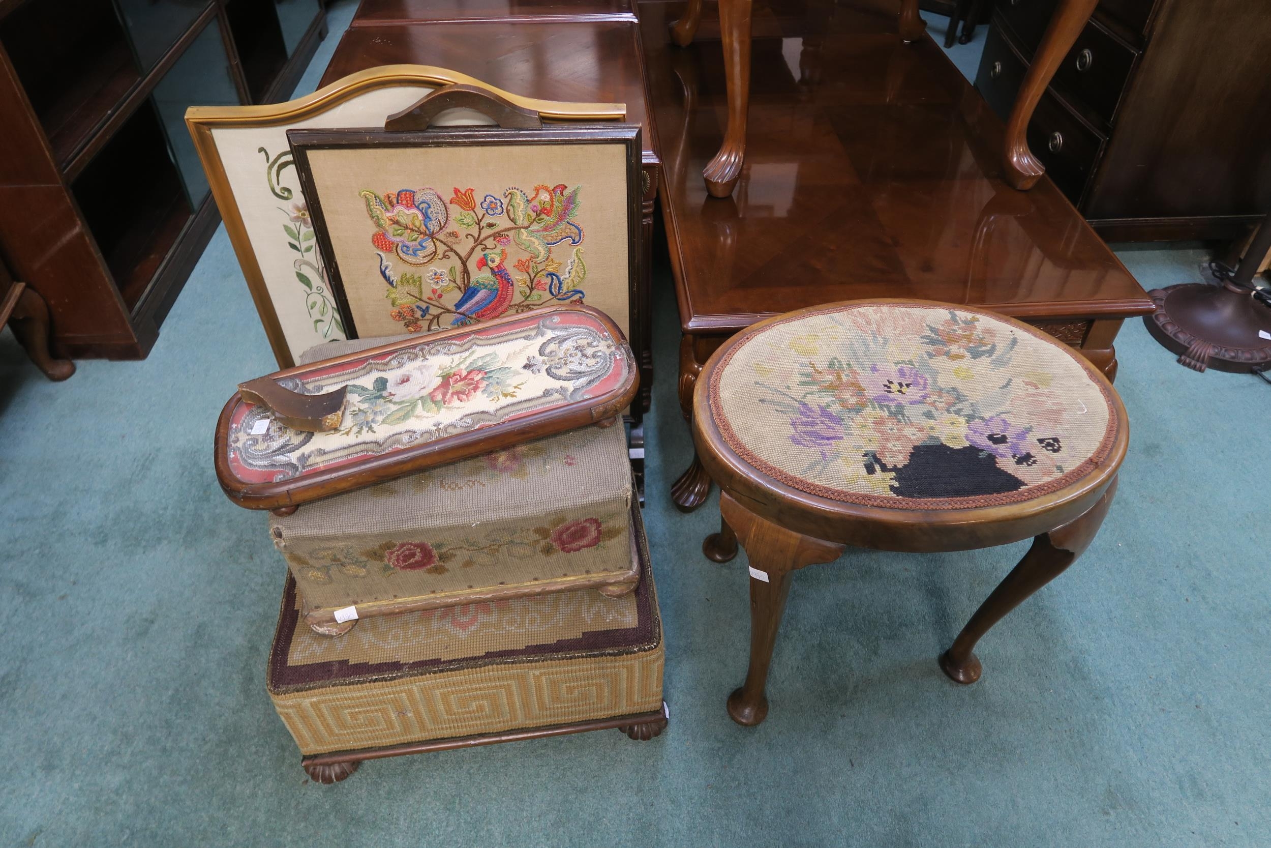 A lot comprising three upholstered footstools, two tapestry firescreens and a tapestry tray (6)