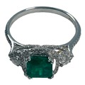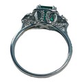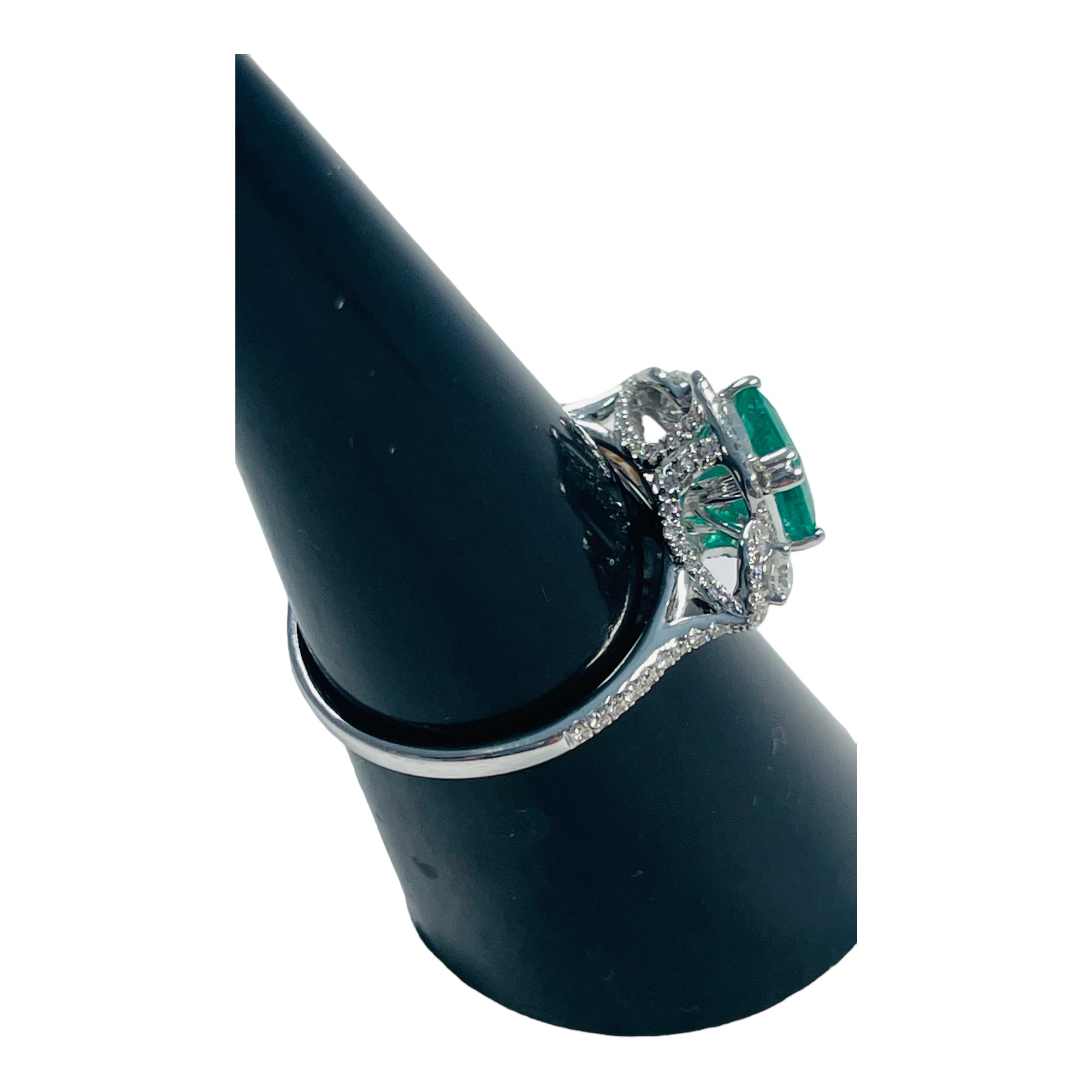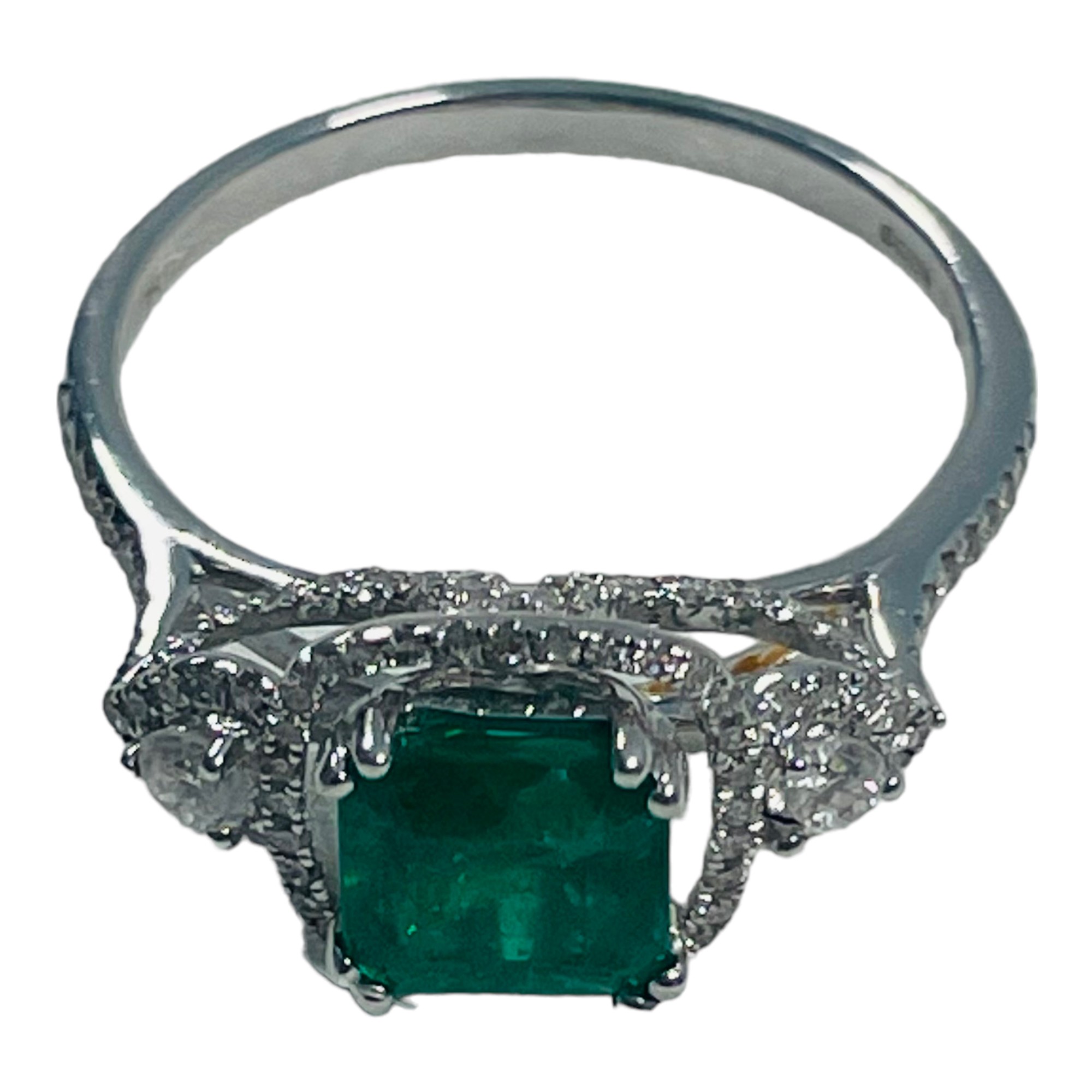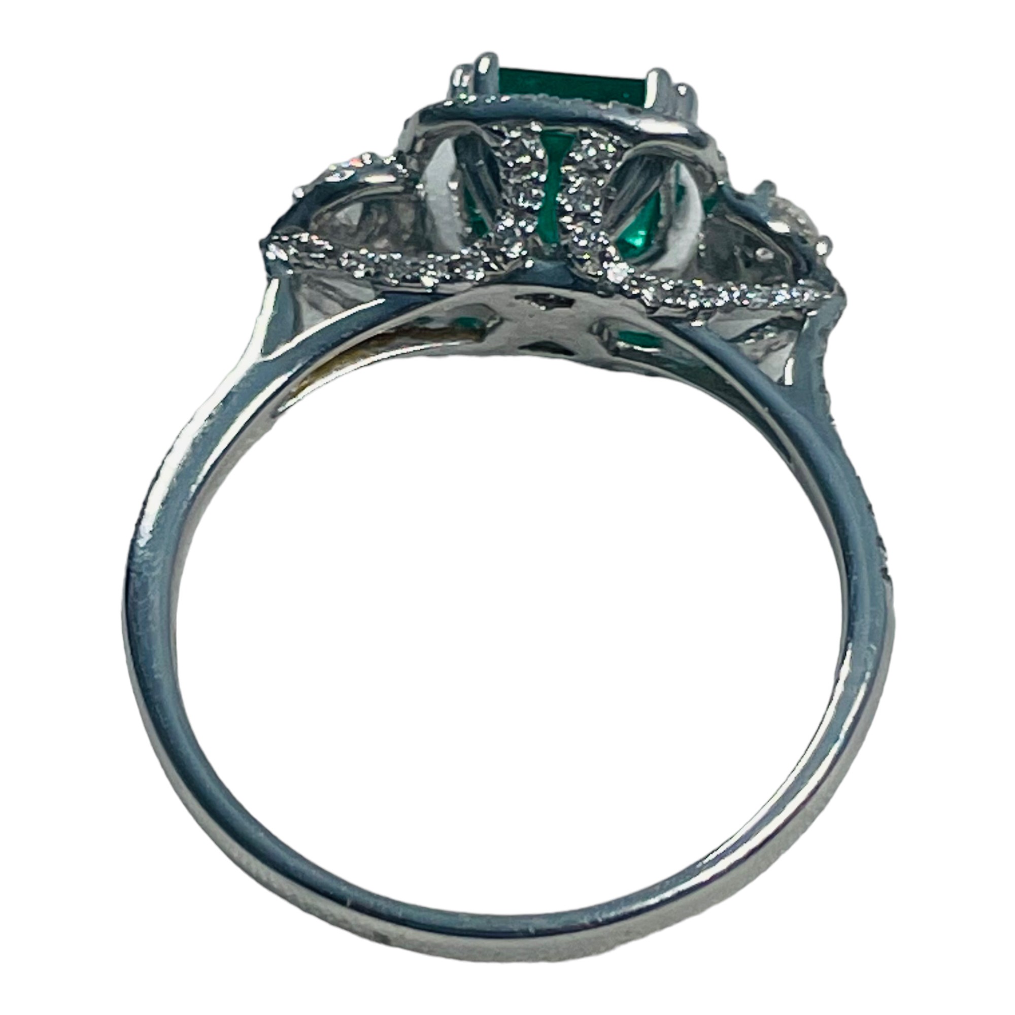 An 18ct white gold emerald and diamond ring, set with a cushion cut emerald, weighing an estimated 0.75cts, in a diamond set halo design, with diamonds set in the shoulders, shank, and basket, estimated total weight of diamonds 0.50cts, ring weighs 2.8 grams.