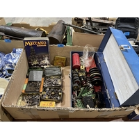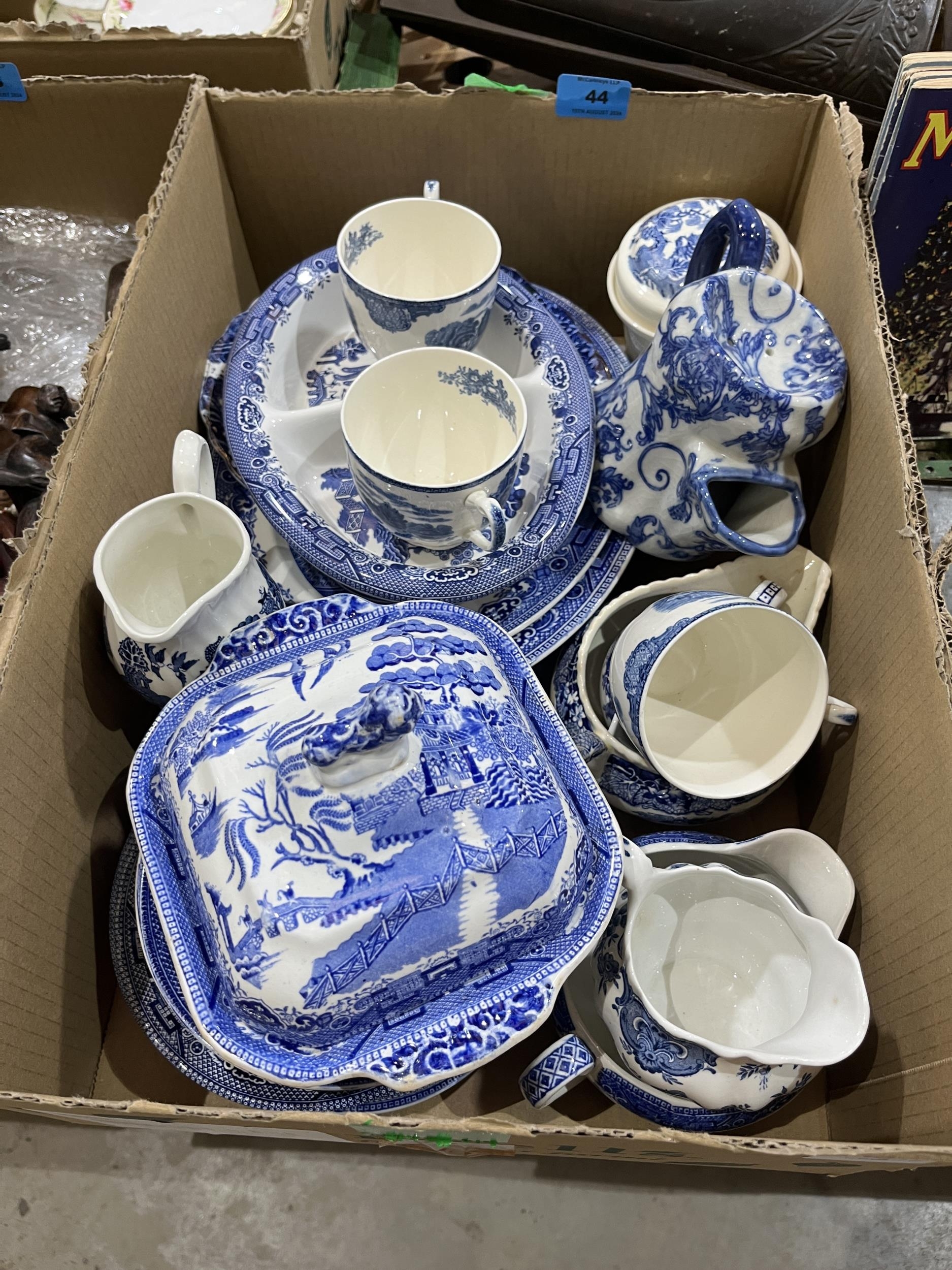 A box of blue and white ceramics.