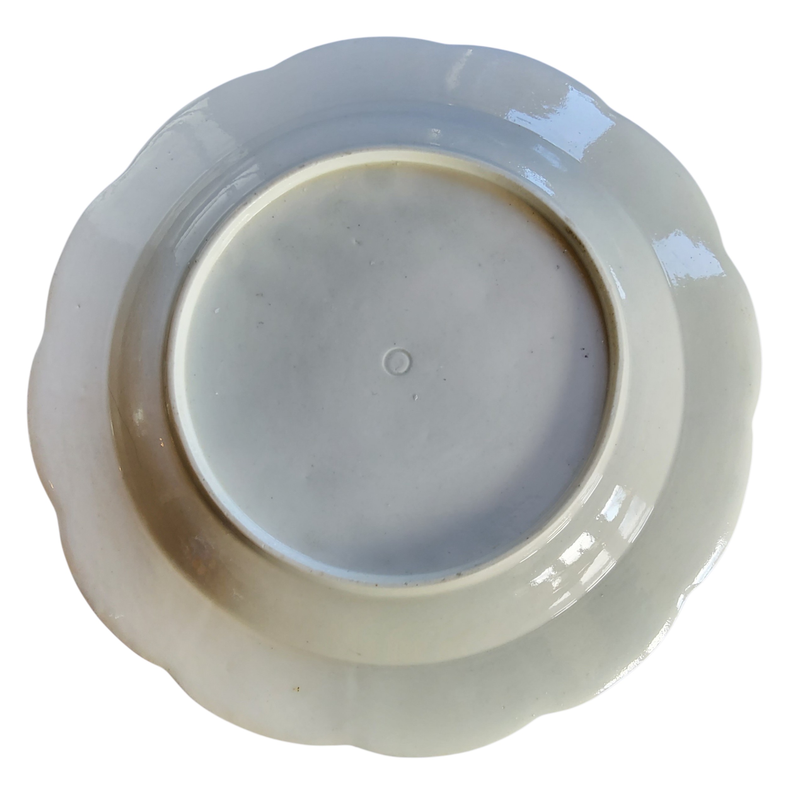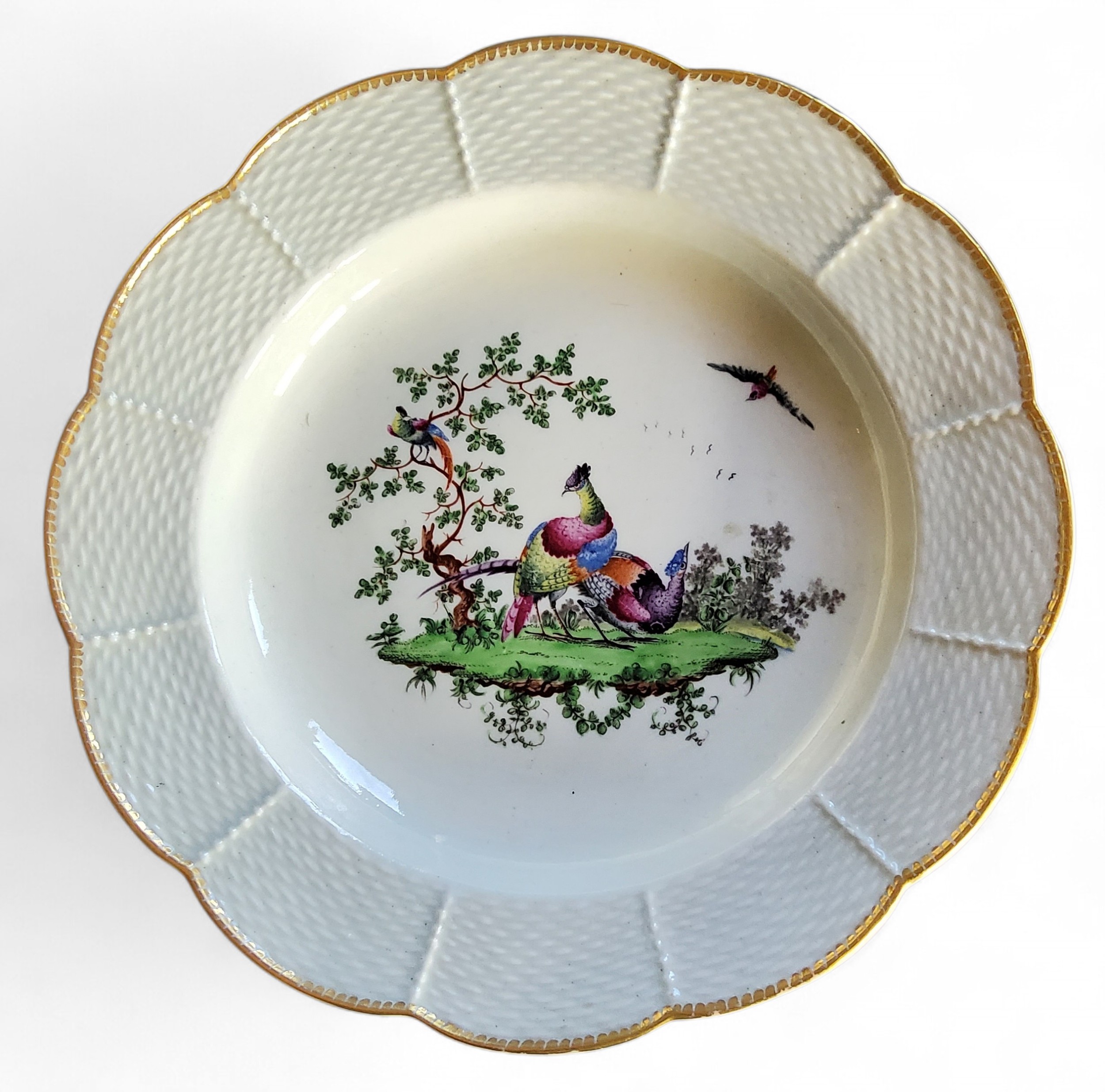 A Worcester shaped circular plate, the field painted with fanciful birds and folaige, basketweave border, gilt dentil rim, 20cm diam, c.1770