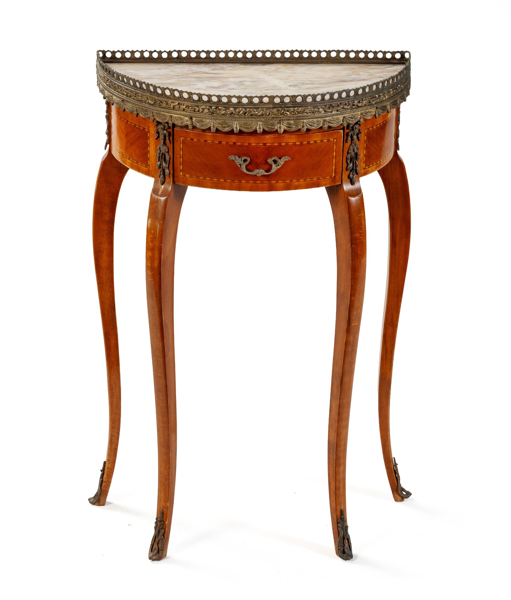 The demi-lune marble top surmounted by a pierced brass gallery, a frieze drawer below, on restrained cabriole legs