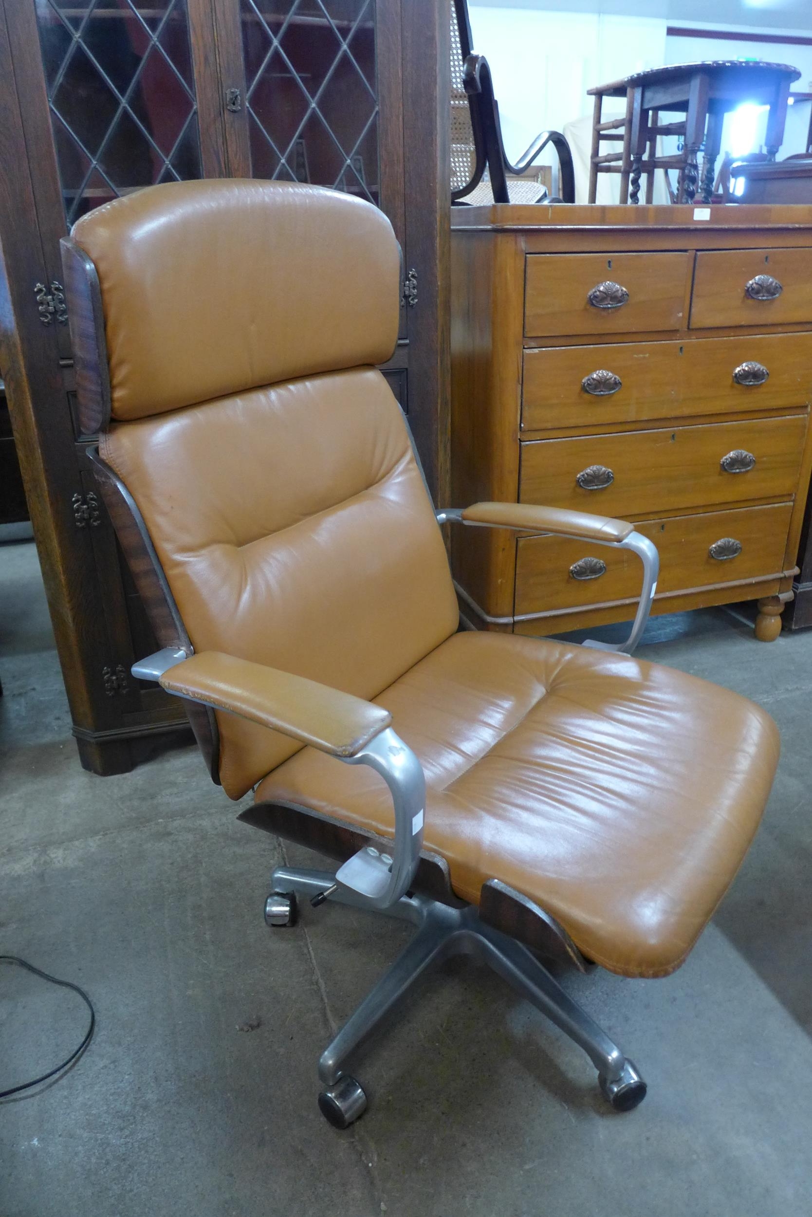 A Herman Miller style chrome, plywood and tan leather revolving desk chair