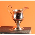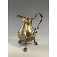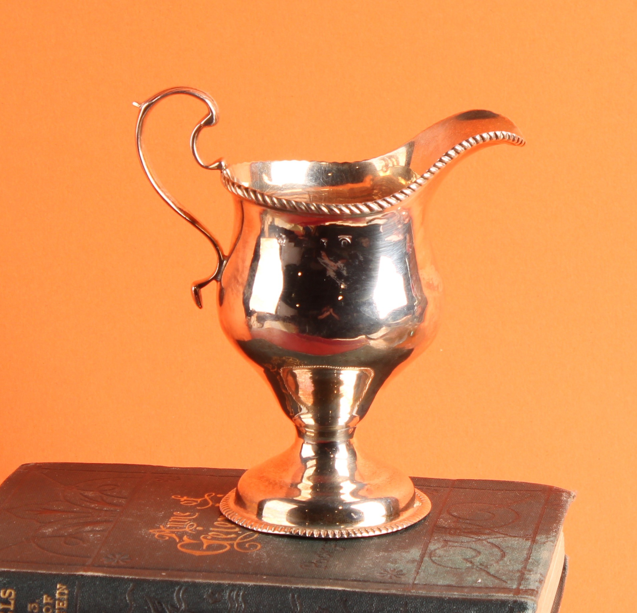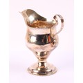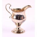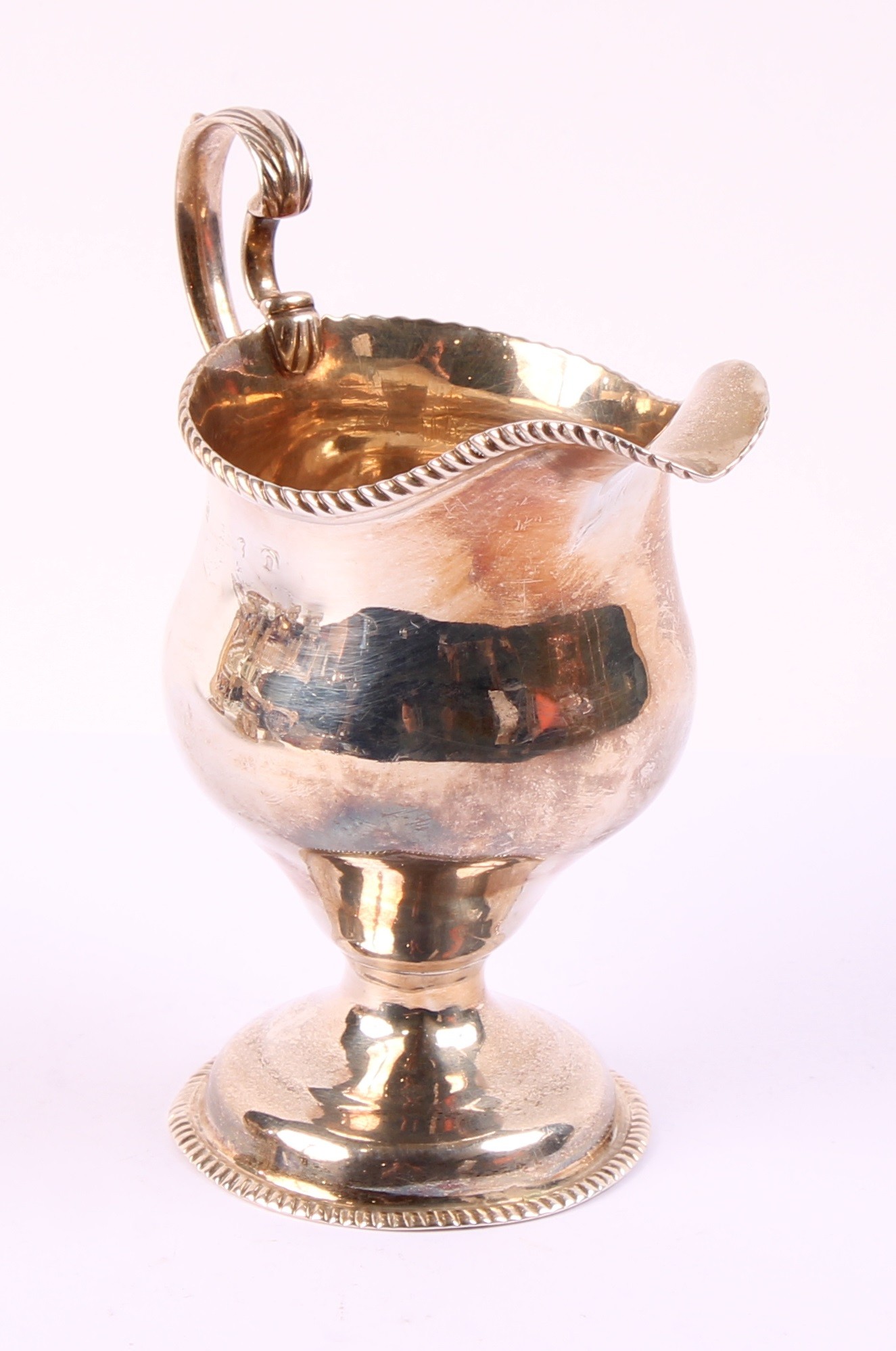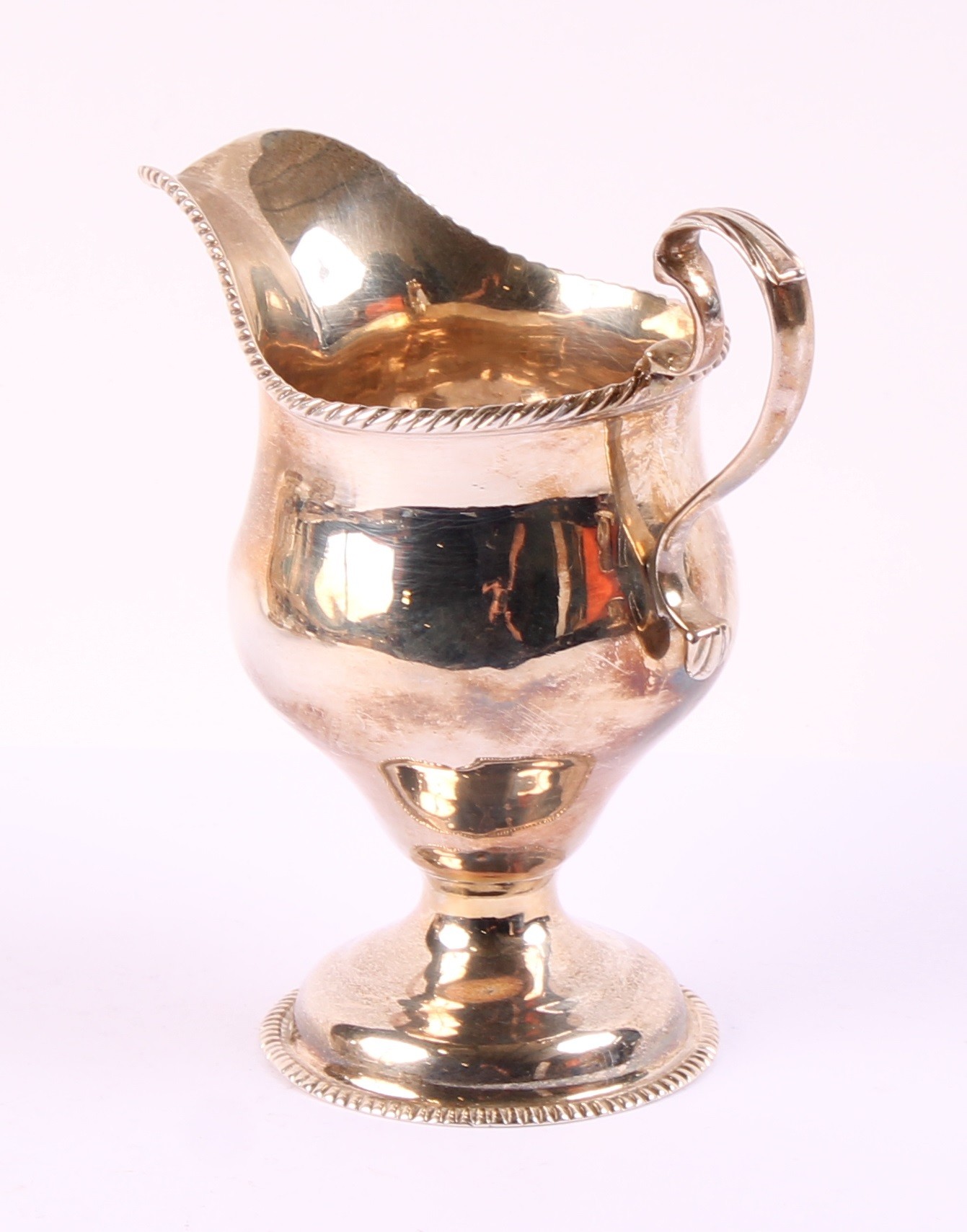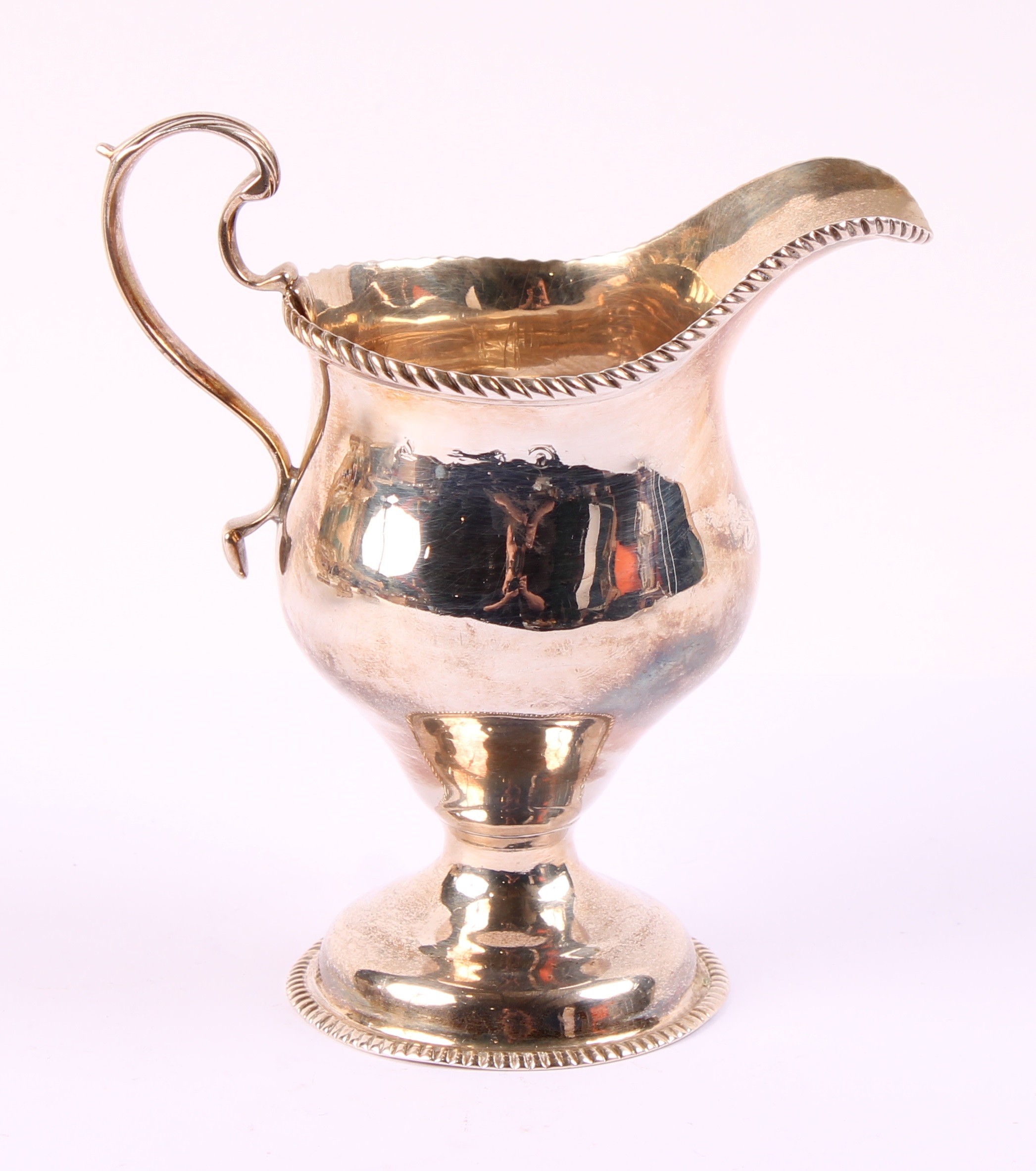 A George II silver ogee shaped pedestal cream jug, gadrooned borders, acanthus capped scroll handle, 12cm high, marks rubbed, London, c.1750, 103g