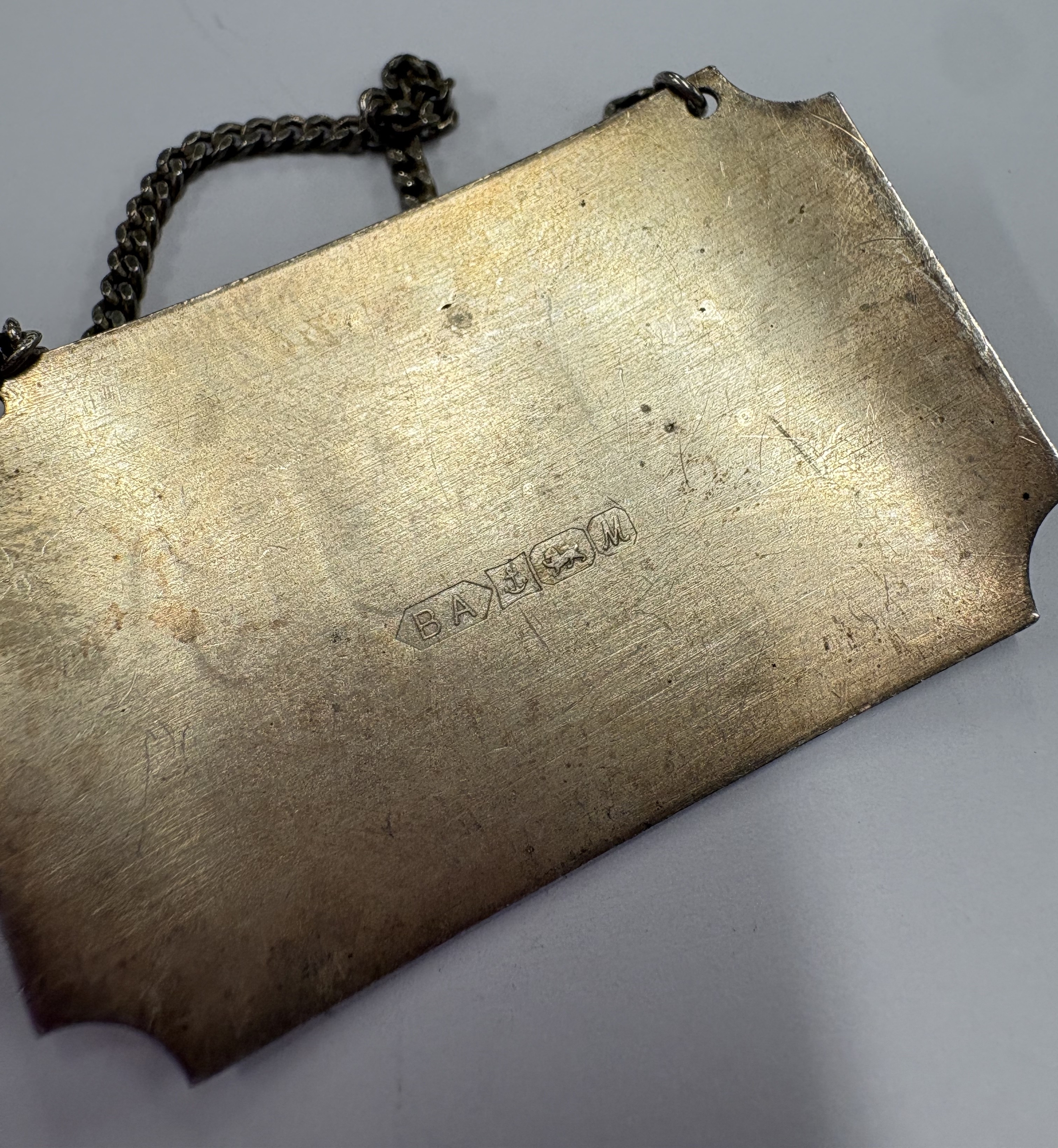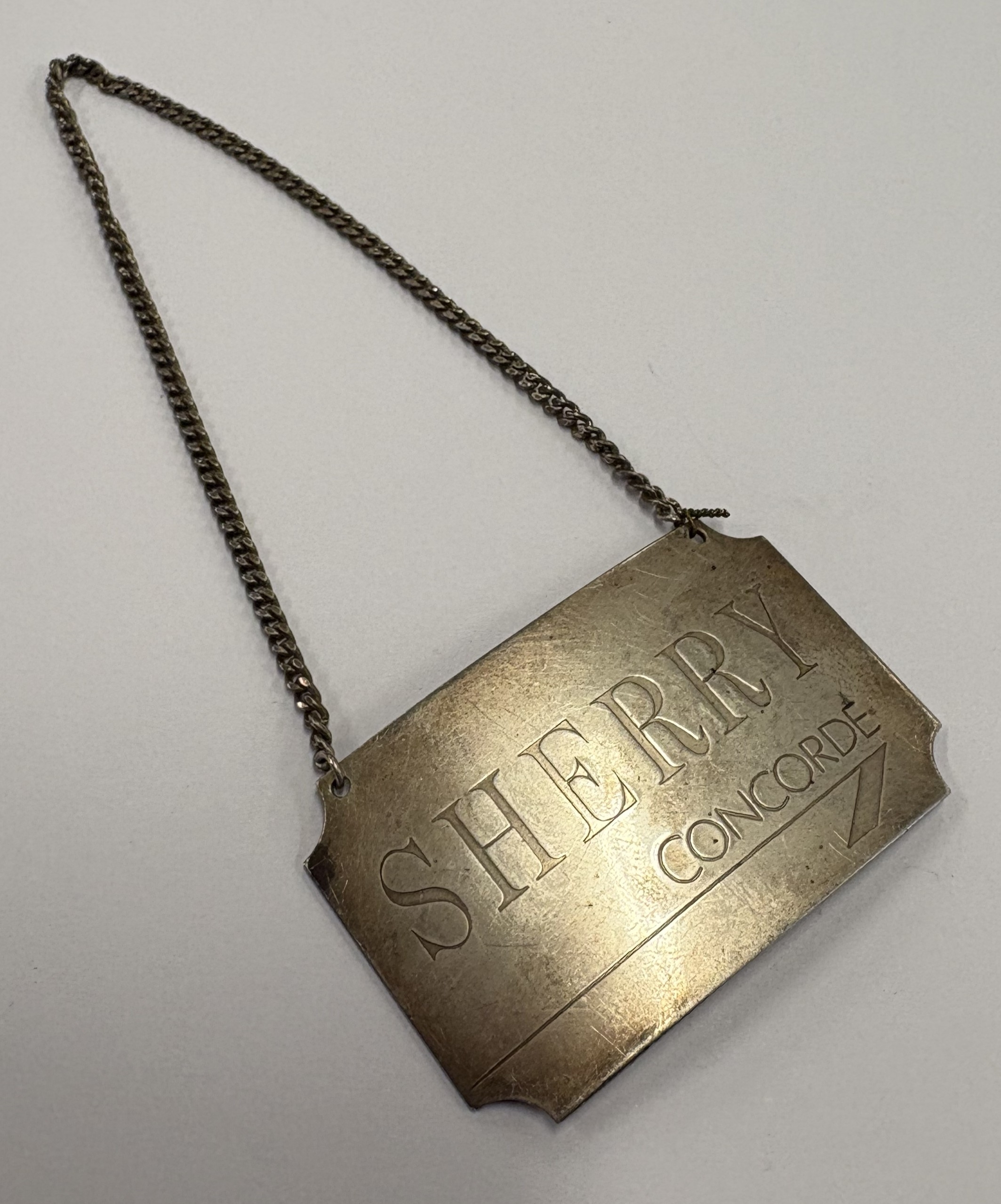 A Concorde silver wine label for 'Sherry'. Birmingham 1986. By British Airways. Approx. 15 grams. Est. £40 - £60.