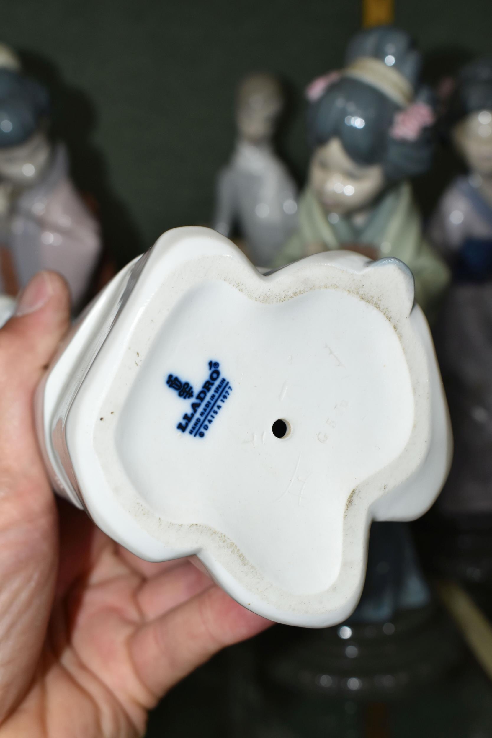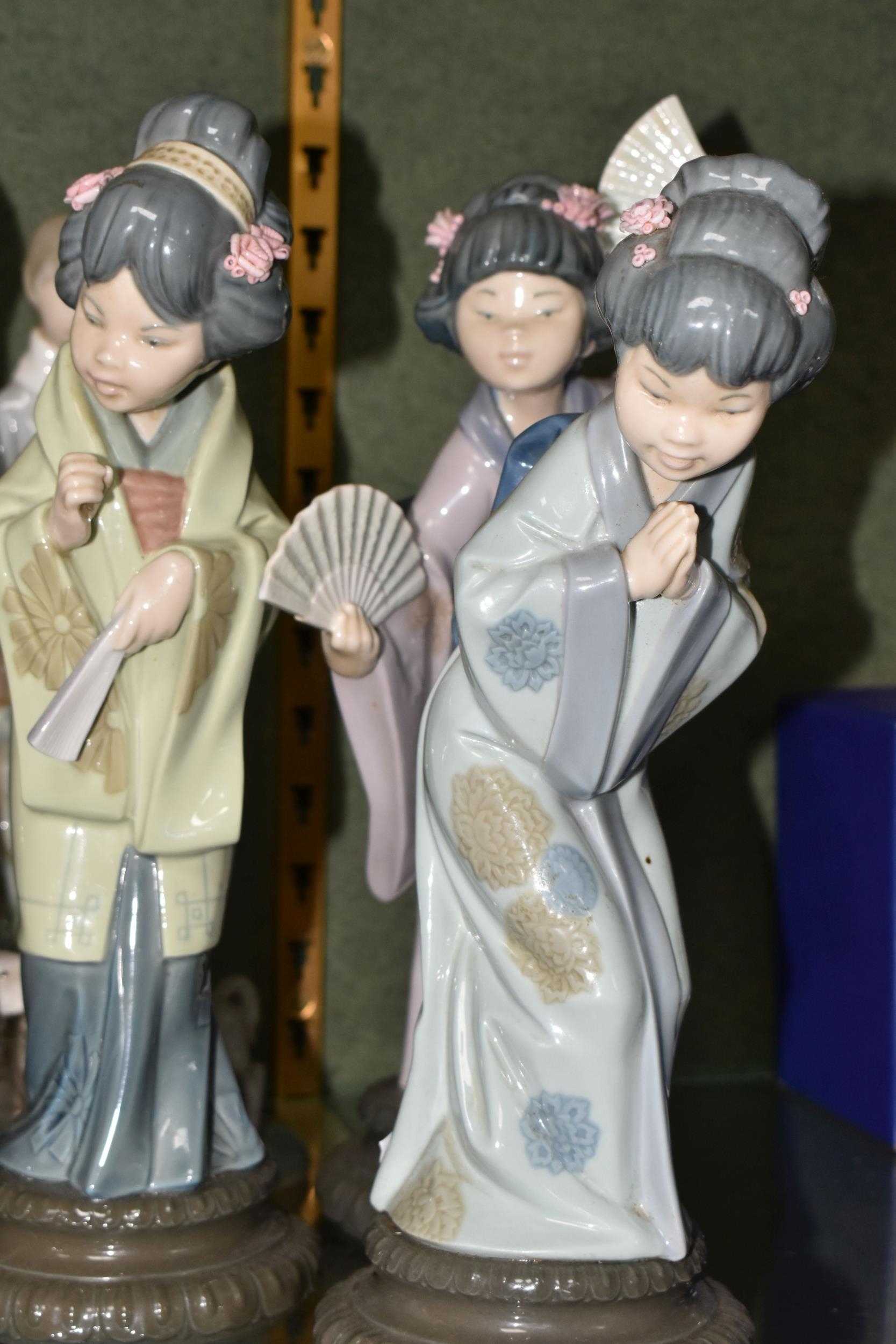 A GROUP OF SIX LLADRO FIGURES, comprising 4584 'Girl Holding Lamb', 4509 'Boy With Lambs' (missing left hand), together with four Geisha figures: Chrysanthemum 4990, Sayonara 4989, Oriental Spring 4988, Madame Butterfly 4991 (6) (Condition report: would benefit from a wash, obvious damage mentioned in description)