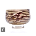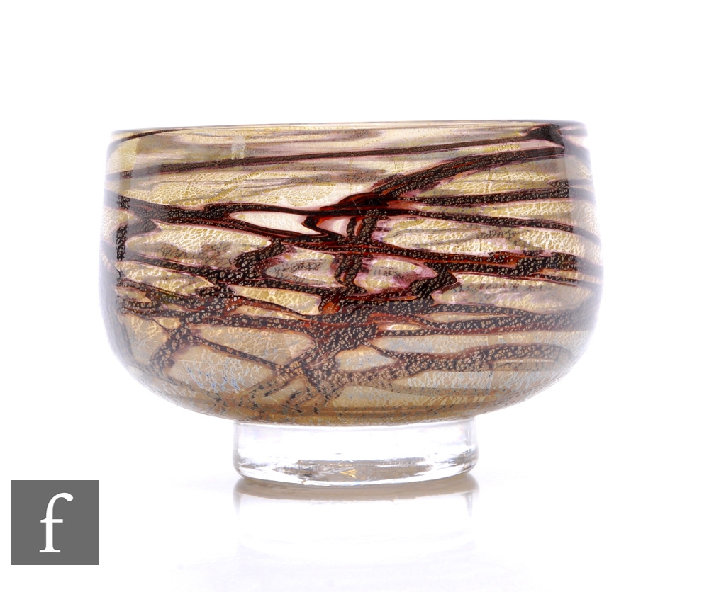 Allister Malcolm - A contemporary studio glass bowl, of footed inverted cylindrical form, trailed burnt umber over clear ground with gold and silver foil inclusions, moulded monogram, diameter 13.5cm.