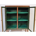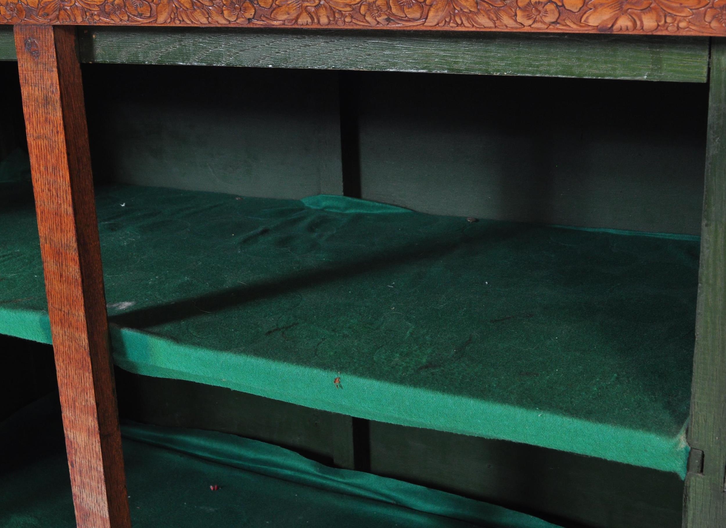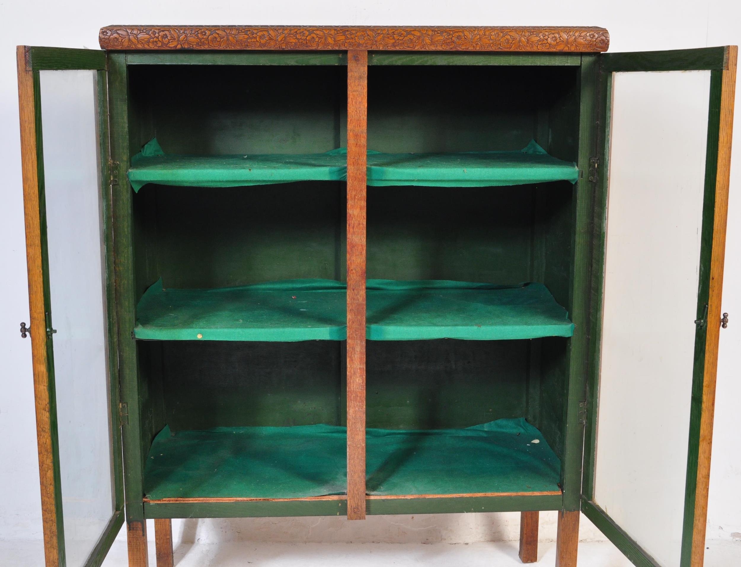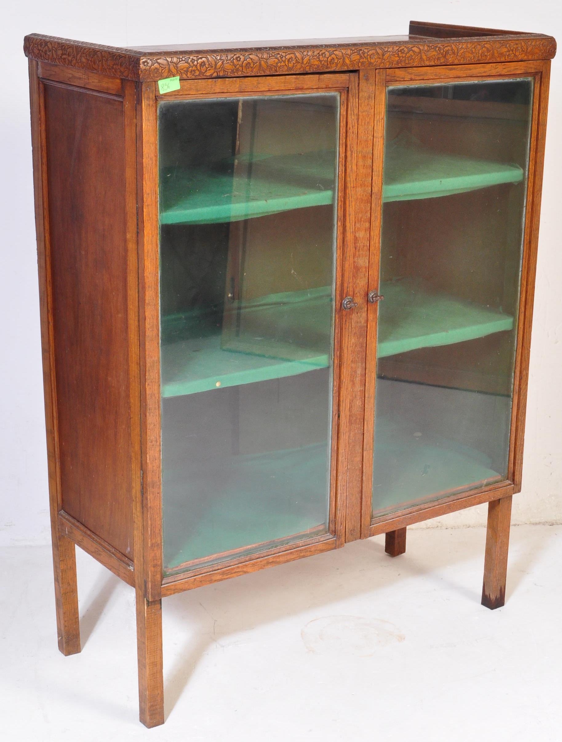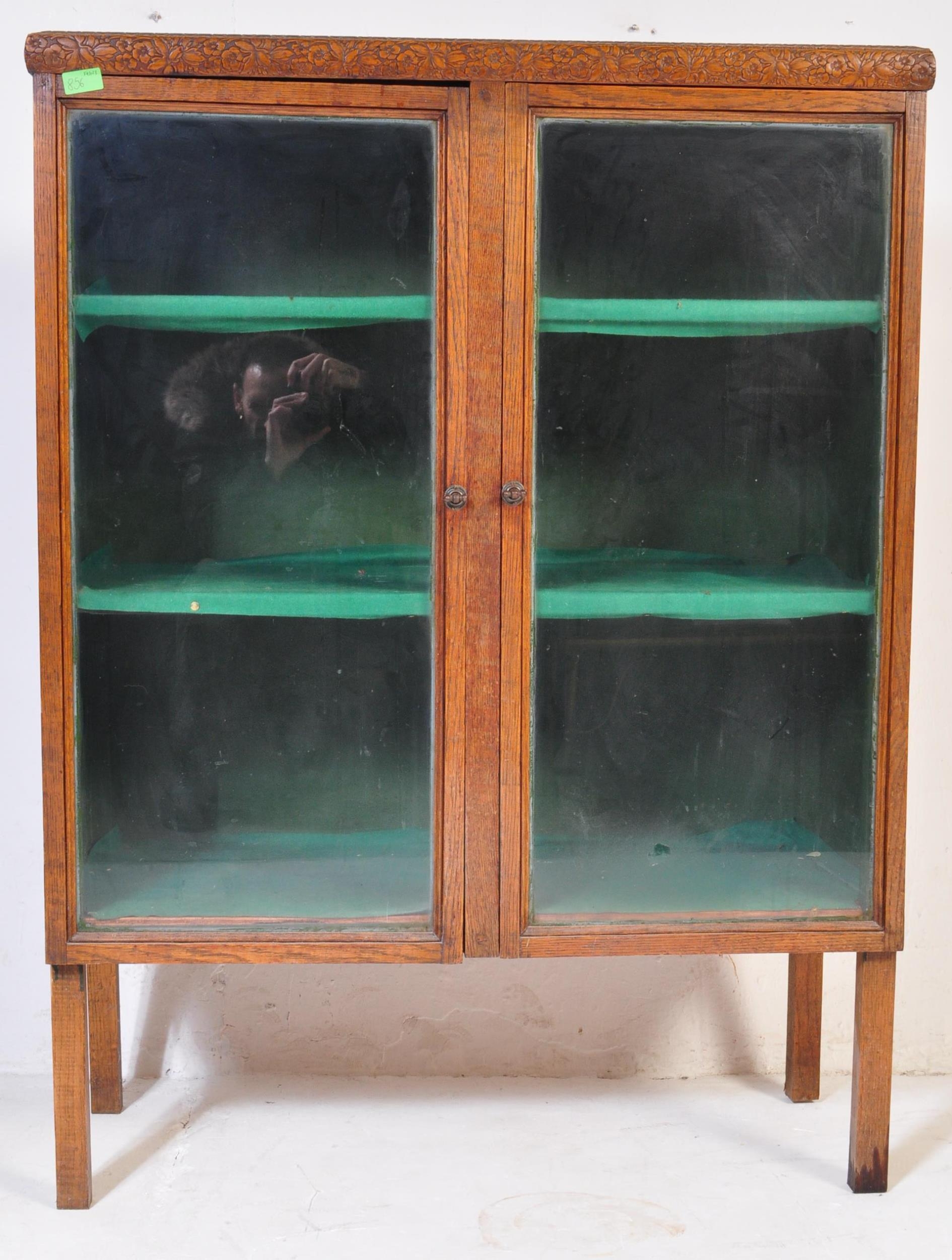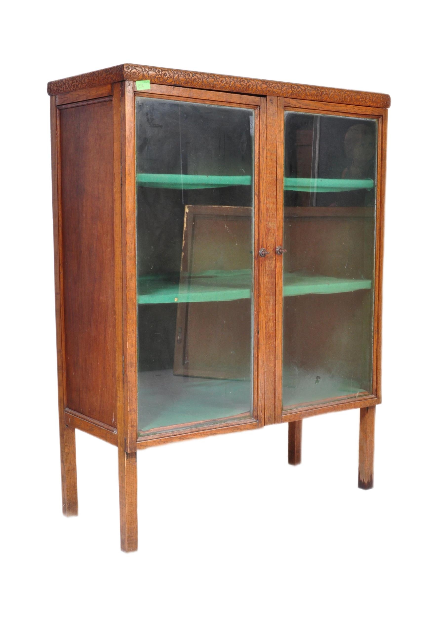 A vintage 20th century 1930's oak glazed cabinet having twin doors opening to reveal a shelved interior with carved floral frieze above. Measures approx; 123cm x 93cm x 41cm.