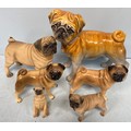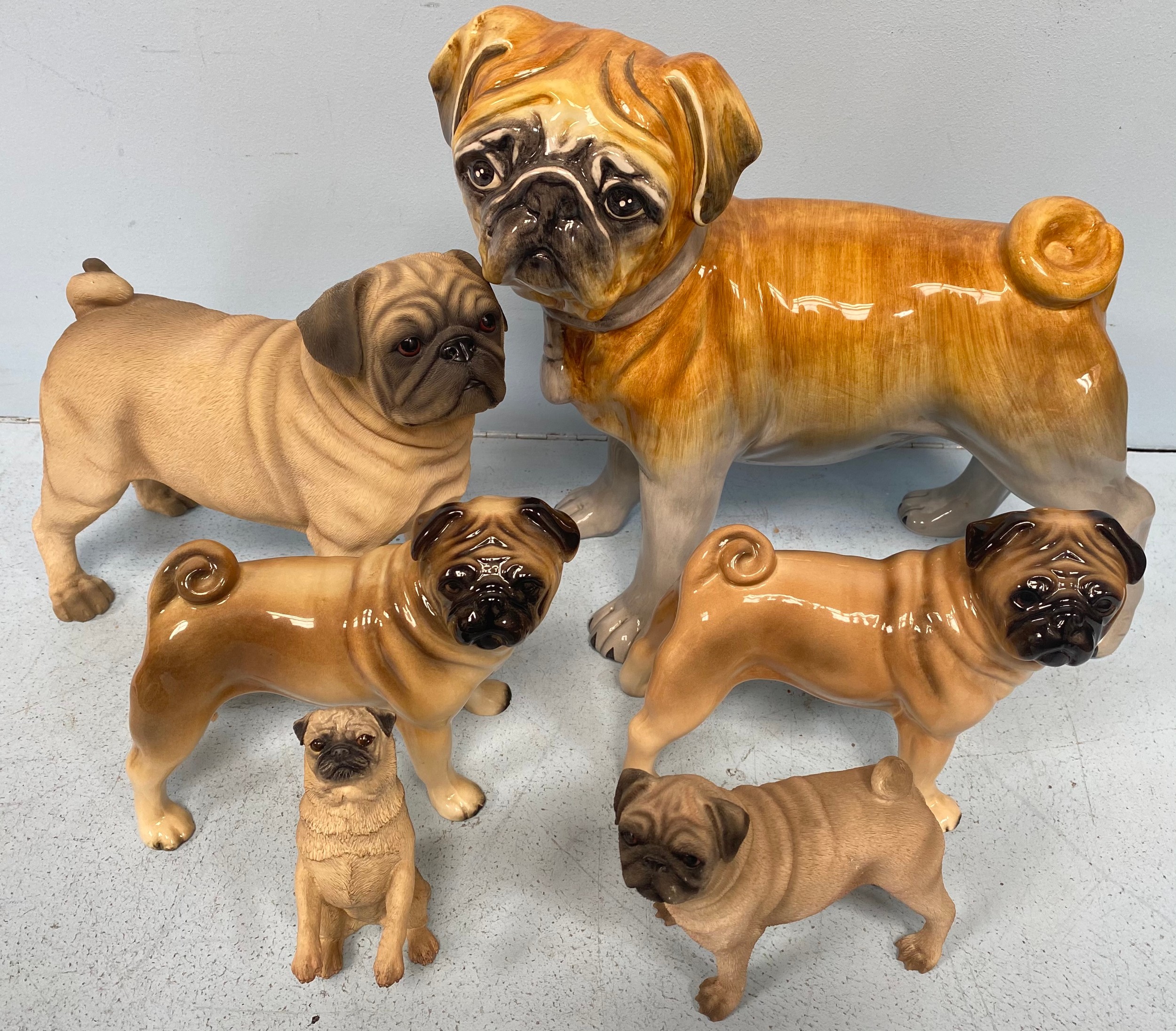 Six various models of Pugs including a large ceramic Pug measuring 29cm high, two smaller ceramic Pugs, two composite Pugs by Leonardo and another smaller one (6)