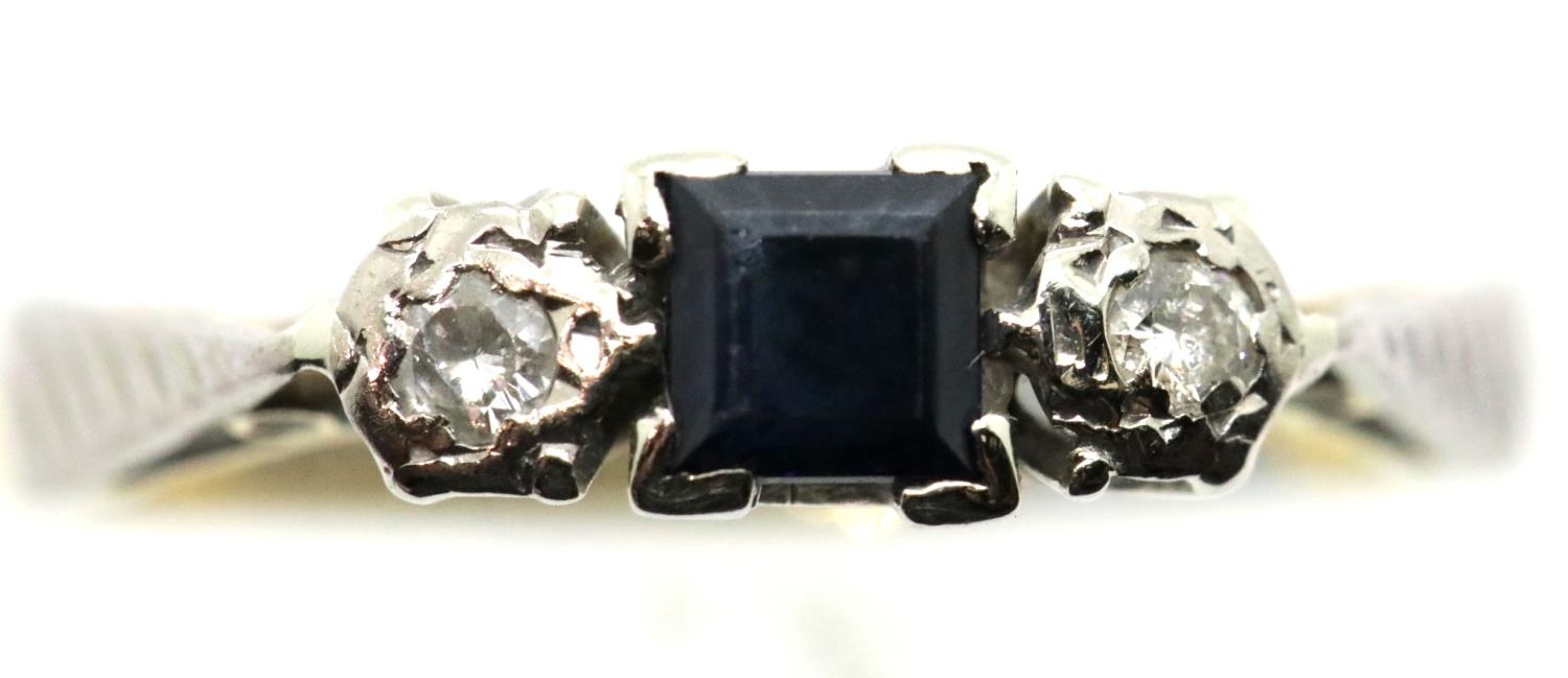 Ladies 18ct gold antique princess cut sapphire and diamond three stone ring, size M, 3.0g. P&P Group 1 (£14+VAT for the first lot and £1+VAT for subsequent lots)